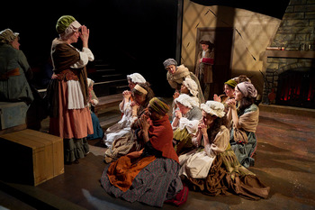 Kirkwood has made Sally an extremely hard woman to root for. In an early scene, Sally, who has left her husband for her lover, returns home to retrieve money and is confronted by her abusive spouse. He is a lout, without question, and no one wants her to bend to his will. Yet her coarse demeanor and ugly reproach make it hard to like her either. But, after all, she has no choice but to fight fire with fire and to be a tigress if she is to prevail against him, so we give her a pass. Let's wait to see her in a better light. But when, among the twelve women chosen to decide her fate, she is just as scornful and nasty to them, it becomes more difficult to sympathize with her. She is aware that all but one of those women have pre-judged her, not only because she has already been found guilty of murder, but because she is an adulteress. They have every reason to doubt her pregnancy claim, for it is a known trick for a woman in her circumstance to "plead the belly." As a twenty-first-century audience, we want to be fair and to hear Sally's case, yet it is hard not to feel pushed away by her unwillingness to make an effort at being agreeable, to allow us to see whatever virtues she may have, or to show an ounce of remorse for the murder for which she was convicted. We want her to win us, along with the jury of matrons, to her side with a geniality she does not possess. Sally's spiteful temperament is also aimed–even more so–at Lizzy, the only one of the twelve women who pleads on Sally's behalf. Lizzy is the local midwife. She brought some of the younger women off the jury into the world, and delivered babies from some of the others. Sally was the first child Lizzy ever delivered, and she alone in the group believes there must be some virtue within her that is worth saving. But Sally wants none of Lizzy's help. Thus, the most wrenching dynamic in The Welkin is between Sally and Lizzy. Their relationship increases in complexity as the play progresses. The other women in the group also play a part in arriving at the play's outcome. They are old and young, well-off and poor. Strong-willed, pious, haughty Emma, is resolved to see Sally hang. She is so bound in religiosity that she calls on the others to pray with her, guiding them to make the right decision–namely, her own. Charlotte is a stranger, a proper upper-class woman there on a visit, who was recruited to the cause, and turns out to have dark ulterior motives. The mute Sarah Hollis has not spoken for twenty years, yet knows things about this case unknown to the others. Sarah Smith speaks with wisdom as the elder of the group, having borne 21 children by three husbands, and still on her feet. Mary is a simple-minded soul, eager to make the decision and get back to her chores, while Helen appears to be sympathetic toward Sally's plight until submerged grief and anger flare up and alter her position. Judith is totally distracted by a plague of hot flashes, which is the cause of the windows repeatedly being opened and allowing the taunts of the angry mob to be heard by those within the chamber. In this universe of women, the men still have control. The jurors are introduced and sworn in by the unseen voice of the magistrate (Jim Ramlet, recorded), in sonorous bass tones that confer the court's authority upon them. A doctor makes himself available to examine Sally after the women's prayer, and Sally's efforts at lactation prove useless. Mr. Coombes–the bailiff assigned to passively guard the women during their deliberation–ends up wielding shocking power, even absent the court's authority. All of the actors create vivid portraits of these and other characters. Elizabeth Efteland gives an astonishing performance as Sally, whose life has been a series of torments and, for the sake of a brief grasp of pleasure and joy, now falls prey to the ultimate torment. While we have difficulty liking Sally, Efteland's portrayal enables us to understand her and, at last, earn our mercy. Tracey Maloney endows Lizzy with the might of reason and a strident resolve that women must seize collective power over their lives–an idea as foreign to these women in 1759 as television. In addition to Lizzy's strength, Maloney shows her struggle to uphold her positions against undercurrents that spring forth from her past, much as social media casts shadows, rightly and wrongly, upon the integrity of our public figures. Among the other actors, Georgia Doolittle as Emma, Charla Marie Bailey as Sarah Hollis, Wini Froelich as Helen, and Kathleen Winters as Charlotte give especially strong performances. Eva Gemlo's Peg, Kirby Bennet's Judith and Suzie Juul's Mary are also noteworthy, with Juul having the opportunity to shine in lifting up a song in a moment that confers solace on the women. Patrick Bailey gives a strong showing as Mr. Coombes, the bailiff who quietly seethes with resentment at the women, and Jonathan Feld is convincing both as the cuckolded Frederick Poppy and genteel Dr. Willis. Director Wendy Knox maintains authenticity in the narrative, shining light on these women's frank knowledge of one another, the swirl of interactions among them, and the conflicting terms of the charge to them. The court has empowered them with a life-or-death decision, but their ken remains bound by the routines baked into their lives, illustrated by framing pantomime images that begin and end the play. The hours spent deciding Sally Poppy's fate are a brief respite–and for most, an uncomfortable one–from the narrow scope of their lives. Perhaps there is a flicker of hope to broaden that narrow scope, hope arriving in the sky above. Worked into The Welkin is anticipation of seeing Halley's Comet, which the English astronomer Edmond Halley correctly predicted would return past the Earth between 72 and 79 years after its 1682 appearance. There are documented sightings of the comet as far back as 240 B.C (seen in China), but it was Halley who calculated the duration of its 