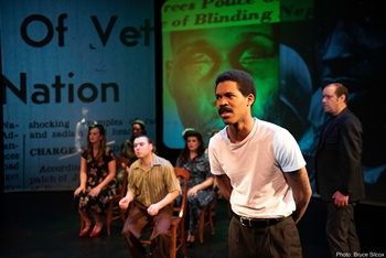 In 1990 I saw the film version, the one that won the Oscar for Best Picture, for Jessica Tandy, and for Uhry for his adaptation. It was the same story, and I had the same reaction. The fact that I am, like Daisy, white and Jewish didn't enter my thinking. Did it? In any event, I had not seen the play or the film again since, nor given it much thought. Springboard to 2026, almost forty years since the play's Off-Broadway opening in 1987, and things look a bit different. We now see things through the lens of Black Lives Matter, Barack Obama, white fragility, wokeness, and, at present, a war against wokeness. This draws a sharper focus on the relationship between Daisy and Hoke, as well as Boolie, Daisy's businessman son who hires Hoke to drive his mother after she, at the age of 72, crashes her car into the neighbor's yard. Daisy stubbornly refuses to let Hoke drive her anywhere, more because her pride is hurt than because of race prejudice, though there is a trace of the latter as well. Over the course of twenty-five years, Daisy relents, she comes to appreciate Hoke, and they form a bona fide friendship. At least, we hear Daisy say to Hoke, "You're my best friend." But I forget, what does Hoke say? That's where veteran Twin Cities-based actor James Craven enters. Craven, a Penumbra Theatre company member since 1981 who, within an impressive body of work, played Hoke in a 2012 production of Driving Miss Daisy at Jungle Theater in Minneapolis, winning an Ivey Award (along with the other two actors in the play) for his performance. He asked the director of that production, "How did Daisy feel about all the racial violence and segregation going on in Atlanta?," to which the director replied, "She didn't know." In 2023, Craven approached Kym Longhi, the artistic director of Combustible Company, with the idea of a play that continues that conversation, starting with the follow-up question, "Why didn't she know?" Waking Miss Daisy is the result of Craven's initiative, and it is now receiving its premiere in the intimate Frey Theater at St. Catherine University in St. Paul. Craven and Longhi collaborated as playwrights, and Longhi directed the production. Waking Miss Daisy runs just 80 minutes (without intermission) and does not make any attempt to capsulize the entirety of Uhry's play. It does use snippets from the play in rehearsal, as the actor playing the role of Hoke engages in a running dialogue with the playwright (not named Uhry, but a fictionalized rendering) raising such questions as "why didn't she know?." It begins as the Actor (Dominique Drake) auditions for the role, and he is not satisfied to passively accept the Hoke as written, but challenges the Playwright (Nick Miller) to make the character as full and important as Miss Daisy, with his own history, needs, and a life beyond his job. He wants to understand Hoke as more than a catalyst for Daisy's enlightenment, but as a full person, raised and living in a context far apart from Daisy's affluence and subject to the indignities of Jim Crow. As the play goes into rehearsal and the Actor assumes the guise of Hoke, playing scenes with Daisy (Barbara Berlovitz) and Boolie (Erik Hoover), we slide back and forth between those snippets and the Actor and Playwright debating why information about Hoke's life, and Black life in Atlanta, is omitted from the story. The script presents these two tiers very well, with smooth transitions between them. It does allow the Actor, as he embellishes on Hoke's part, to take the upper hand, as the Playwright tries to restrain him ("That is not the play I wrote!") but often finds that the Actor's arguments are sound. We, the audience as well as the actors, do need to know more. There can be more balance in the play, rather than allowing "She didn't know" to be good enough response. Combustible Company is very attentive to the physicality of performance. The principal actors and an eight-member ensemble change the settings by moving furnishings and props on and off stage, but not as one might carry a chair, held safely in front of the body. Rather, they carry each item with sweeping motions, essentially dancing, making transitions a space to adjust to the narrative shift, and through their movements, set the tone for the scene to come. This is especially effective in setting a scene that depicts the bombing of the Werthan family's synagogue (a true event), evoking the shock and mayhem of that incident. Dominique Drake is top-flight in the Actor/Hoke role, persuasive as the Actor making his case for full representation without becoming bellicose, and as Hoke, amiable, while finding ways to fill in the gaps the playwright has left in his profile. Nick Miller is excellent as the Playwright, defensive about his work and pushing back on the charge that he has a responsibility to go beyond the parts of the story that are within his comfort zone. Barbara Berlovitz is prickly, witty, and regal as Daisy, gradually removing the blinders that have kept her from seeing that racism is as real and as invidious as antisemitism. Erik Hoover is effective as Boolie, a smaller role that allows him to also be part of the ensemble. The ensemble is well integrated into the flow of the narrative. In a particularly well-conceived scene, three ensemble actors portray members of the Daughters of the Confederacy, who have invited Daisy to their meeting. Daisy is pleased to be considered for membership in that elite group, but is immediately disabused of the pleasure when she enters and finds the three pretentious ladies seated on comfortable chairs, and have left only a child-sized chair for her to squat down on. The set is nothing more than five floor-to-ceiling screens that form an arc across the stage. These are used to project video footage (designed by Jim Peitzman) of elegant Southern trees dripping with moss, neighborhoods of Atlanta, civil rights rallies and protests, lynchings, the torching of a synagogue, and anything els
