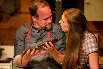 At the play's start, we meet The Man and The Woman in a rustic fishing cabin that had belonged to The Man's uncle, beside a river ripe with ocean trout. It appears that the two have not known each other very long, and The Woman's expectation is a secluded opportunity to become better acquainted. However, The Man has determined that this woman is the woman with whom he will share his life. His means of taking that leap of faith is to teach her the art of fly fishing for ocean trout, a pursuit he treats as a sacred ritual in this special place with its ancestral claims on his devotion, which he has never shared with another woman. The Man has chosen the darkest of nights for this occasion, with a moonless sky, the utter darkness being the best conditions for catching the wondrous ocean trout. Along with the act of fly fishing, The Man heaps praise upon this species, attributing almost supernatural prowess to it. He barely hears The Woman state that she'd rather skip the fishing, to nurse a sunburn and settle in with her book, so engrossed is he in preparations to wade into the rushing river. As he lures the trout by casting flies, he lures The Woman with a blend of poetry and chastening. The next scene begins with The Man storming into the cabin, frantically calling the police for help: The Woman has disappeared in the dark. In short order she turns up, unscathed; actually, she in terrific spirits. She hardly seems the same woman who earlier had resisted traipsing into the river to catch trout. In fact, by all appearances she is not the same woman. Nor, in her presence, is The Man the same domineering male. For the remainder of the ninety minute play The Man lays bare his desires, to these women, yet the more he states, the less certain we are. Everything about The Man begins to seem subject to question. Even the legacy of his uncle, who passed his knowledge and love of fly fishing on to The Man, begins to be suspect. This makes the play quite a head-scratcher, though no one is likely to scratch too rigorously, as it is hard to care about these characters. The Man is over stuffed with poetics and inept at forming real connections. He is unable to reveal truth, only to obscure it. Both The Woman and The Other Woman are seen only in relation to The Man's pursuit of them. Neither woman reveals any depth or distinction. The ocean trout's inborn instinct to swim against current to their spawning place year after year in a cycle of continuous regeneration may represent The Man's repeated encounters with women in this isolated cottage, the place that is his spiritual birthplace. But the trout need nothing more than to sustain the cycle of their lives and replenish new generations. What will be the outcome of this man's repeated forays against the current? In spite of The River being a rather unsatisfying play, Amy Rummenie manages to direct with flair, prompting the players on stage to behave as if nothing changes from scene to scene, even when what we see has completely changed. She also draws out heat and sexuality, particularly between The Man and The Other Woman. An extended scene in which The Man fillets a fish and prepares an entire dinner is almost balletic in its grace and precision, being perhaps the only time that The Man is his true self. Andrew Erskine Wheeler, who was brilliant in Walking Shadow's The Christians last spring, plays The Man, giving him the bloat of a person who believes that myth and poetry can substitute for one's true self. His oversized emotions conceal his true feelings, and Wheeler captures this essence. Emily Grodzik portrays The Woman as unprepared for the stakes that The Man has placed upon this weekend. She is reticent, unsure of her role in this encounter. Elizabeth Efteland reveals The Other Woman's self-confidence, with the strength to hold her own, or even take the upper hand, against The Man. She is uninhibited and comfortable with herself. The physical production is quite beautiful. The intimate space in Open Eye Figure Theatre, where Walking Shadow's production has been mounted, has been put to terrific use, with a handsome, realistic cabin setting by Steve Kath. Lighting design by Paola Rodriguez depicts the darkening of the sky through the cabin window, and the dimming of light within the cabin, while Katherine Horowitz' sound design, with a constant low chirping of crickets and rushing of water, brings the essence of the natural surroundings to the stage. Horowitz also composed lovely viola pieces as mood-heightening bridges between scenes. The River falls into the category of play that may have more value as one reflects upon it than during the initial viewing of it in the theater. It seems to have some deep themes and points of view on the way in which men and woman reiterate, or fail to reiterate, the process of coming together as a unit. The absence of names for its characters certainly gives the sense of aspiration to universality. However, to succeed in this lofty goal, a play needs to have a conflict that catches our breath, and characters that we can at least believe in, if not care about. Though Butterworth has fallen short in those ends, Walking Shadow Theatre Company has given The River an opportunity to shine by way of strong direction, performances, and design. The River, a Walking Shadow Theatre Company production, continues through September 17, 2016, at Open Eye Figure Theatre, 506 East 24th Street, Minneapolis, MN Tickets are $26.00 general admission, $24.00 for seniors, $15.00 for students, veterans and active military personnel, $10.00 economic accessibility program (limited number for each performance). For tickets and information go to walkingshadowcompany.org or call 612-375-0300. Writer: Jez Butterworth; Director: Amy Rummenie; Set Design and Technical Director: Steve Kath; Costume Design: Sara Wilcox; Light Design: Paolo Rodriguez; Composer and Sound Design: Katherine Horowitz; Props Design: Robert Bobbie Smith; Vocal Coach: Q