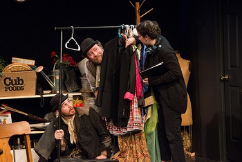 From the knowing smiles and nods in the audience at the Open Eye on Saturday night, it was easy to sense that there were more than a few long-suffering actors (and perhaps, long-suffering friends and partners of actors) present. On the one hand, we hear of the "Yes, and ..." response in improv, and the "miserly approach" (malapropism for the "Meisner Approach") which works like a charm every time. On the other hand, we hear of actors so desperate they get all their meals from soup kitchens while they wait and wait and wait ... oh, and wait for the big break they know to be just around the corner. While some of the jokes are edgy and possibly just a wee bit deflating for some thespian types, most audience members will appreciate that the show is ultimately good natured and not cautionary. Besides, misery loves company, right? The play's ingenious set-up involves two understudies waiting in the basement green room for their chance to perform inguess what show? The parallels with the real Waiting for Godot (which one sporadically hears from the "performance" taking place on the stage above) include the characters' names, with Ester (Sam Landman) and Val (Gabriel Murphy) substituting for Godot's Estragon and Vladimir, and an empty hat stand that is reminiscent of the bare tree which is the sole significant item on stage in Godot, while Ester's continual struggle to button his vest echoes Estragon's repeated efforts to take off his boot. Like Beckett's play, Hanson's has two acts where very little happens other than repetition, with slight variation, in behavior and dialogue. Technically, Ester and Val are waiting not for Godot, but for "The Director"whom they wrongly assume must be malebut are forced to settle for a visit from the assistant stage manager Laura (Sulia Rose Altenberg), just as Beckett's characters must settle for a messenger from Godot. Lastly, Godot famously ends with the exchange "Shall we go?" "Yes, let's go." followed by the stage direction, "They do not move." At this play's closeSPOILER ALERTthe characters similarly resolve to move, or specifically, to go onstage to to play their parts, but then remain in place as the lights go down. Murphy and Landman make a fine comedy duo with Landman as Ester playing imperious buffoon to Murphy's callow Val. Both are terrific as they engage in vaudevillian cross-talk and deftly executed slapstick bits, but Sulia Rose Altenberg as Laura almost steals the show, playing "straight man" to the two tramps. It's all positively absurd. Don't miss it! Waiting for Waiting for Godot, by Dave Hanson. Performed through October 2, 2016, by Loudmouth Collective, at the Open Eye Figure Theatre, 506 E 24th St, Minneapolis. To order tickets or find further information, visit www.loudmouthcollective.com. Directed by Matt Sciple