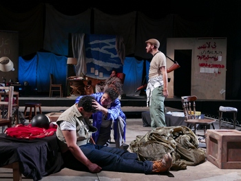 Sabra is also the name of a Palestinian refugee camp outside of Beirut, which (along with a camp called Shatila) was the site of a massacre by Phalangist forces supported by Israel during the Israeli invasion of Lebanon in 1982. Sabra Falling) by playwright Ismail Khalidi, now being given a world premiere staging by Pangea World Theater, is set in that refugee camp, specifically in the home of a Palestinian family inescapably caught up in the violence. The elder of their sons, a poet, was arrested and presumably killed for writings deemed to be seditious. His fiancée, an independent young woman named Dalia, moved in with his family. She is a medic caring for Palestinian soldiers. The younger son Hani is determined to avenge his brother's death, and joins the PLO forces. Their father Sofyan is a playwright who has seen theaters destroyed, his actors killed or fled, and spends day and night in his pajamas, coping poorly with the descent of the civilized world he knew. Leena, Sofyan's wife and former actress in his plays, maintains strength for all of them scraping together meals and trying to maintain a home. As the play opens, an attack has blasted a hole in the family's roof. Through this hole falls an Israeli pilot, stunned but not seriously injured. Hot-headed Hani wants to shoot the Israeli on the spot, but Leena forbids it. She insists on caring for their captive until his health is restored, will not allow killing in her home, nor allow her family to behave as the invading force has behaved toward them. All of them are struck by the soldier's resemblance to their missing son, and Sofyan believes it is their son, returned as he always believed he would, and gives the soldier their old typewriter to resume writing. The soldier, confused and uncertain how he arrived there, reveals his own past through fragmented memorieshis mother in Tel Aviv, the girl he left behind, and the fact that he, too, is a writer. He is also a Sabraborn in Israelbut not of Western descent. His family emigrated, under duress, from Iran, which meant that he was subject to discrimination by the more privileged European-descended Jews. He is also haunted by images of an Israeli general, dressed garishly, half clown, half demon, who speaks with a demented Eastern European accent and walks with a palsied goose-step. The general assails the soldier for remaining with the family, egging him on to kill them and return to his unit, just beyond the Sabra camp. Salah Fatah plays Palestinian music from the back of the stage, providing an atmospheric soundtrack that links this modern era story to a cultural legacy. Over two acts, the story unspools as each character must make choices as to how to face their dilemmas. Hani is certain that this soldier, this fallen Sabra, is nothing but their enemy. But the others see in him their lost son and lover, as he sees in this family his own people, more like him than are many of the Israelis he fights to defend. The premise, the characters response to the fate that is swallowing them, and the familial love that holds them together through the worst of times, are all well developed by playwright Khalidi. He brings them to a precipice and there it ends, leaving us to imagine what will happen in the next moment. Without allowing any spoilers, I can say that what I wish to have happen and what I believe will happen are quite different. The result is a deep sadness, all the more so when realizing that this story set in 1982 is being re-enacted in 2017 in so many parts of the world. The actors do well at relating the entrenched emotions that guide each of their paths in this journey. Adri Mehra is greatly affecting as the addle-minded Sofyan, reflexively chuckling mid-sentence as if to keep from screaming. As Leena, Adlyn Carreras, always a strong presence, conveys the strength of an unyielding moral compass, and the passion of a mother for her family. Lina Jamoul displays Dalia's fierce determination to stay the course, but reveals the vulnerability of her broken heart as she is drawn in by the soldier's looks. Michael Karadsheh is a believably strident Hani, young enough to see only one side of his march to take arms and become part of the fight. As the pilot, Jawdy Obeid has little to say; for a large part of the play, the soldier simply responds to the questions, concerns, threats and ministrations of others. Obeid does fine work building his character with facial expressions and body bearing. Only Mohammed Yabdri, as the General, is not compelling, though that might have been the result of the character being written as a grotesque burlesque of the war machine, a cartoon when all other persons in the play are achingly real. His Eastern European accent adds to difficulty understanding his lines, especially given the lack of enhancements to the Avalon Theater's acoustics. The Avalon, home to In the Heart of the Beast Puppet and Mask Theatre, offers a large playing space where seats have been removed in front of the stage, on which a disheveled, fragmented home, designed by Sadie Ward, is spreads out. A more compact pace might actually intensify the claustrophobic feeling of a refugee camp under siege. However, both the lighting (designed by Mike Grogan) and the sound (design uncredited) provided enhancements with the blaze and roar of war, and the fog of memory taking hold over these characters' lives. The production, overall, is directed by Dipankar Mukherjee with a nod toward the real possibilities that befall this family and their Sabra pilot. That the pilot survives the fall, and that he resembles so closely the elder son, are leaps of fantasy, but everything is presented as if it could happen, and most likely does happen wherever war is bringing havoc to people's lives. The history of this event, as of the entire Middle East, is terribly complicated, and all sides can make earnest cases for their actions. Sabra Falling is clearly sympathetic to the Palestinians in portraying the