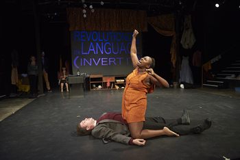 At the end of her introductory notes to Revolt. She Said. Revolt Again, Alice Birch writes: "Most importantly, this play should not be well behaved." It isn't, though performed an underlying discipline that is a tribute to its actors and director. Birch cites a number of radical feminist sources as her inspiration, in particular The SCUM Manifesto, a 1967 screed by Valerie Solanas (best known for firing shots at Andy Warhol) that called on women to destroy the male system of dependency on money, and assert the innate strength of the female character. Of course, I greatly oversimplify, but then, so did Solanas. Birch's play is a series of conversations and contexts that illustrate how this might look in practice. Revolt. She Said. Revolt Again is only about 70 minutes long, at least in Knox's rapidly paced production that feels like it is driven by a metronome, yet is devised by Birch to be broken into four acts. Act one is a series of short scenes that each play out one slice of the revolution she wants to illustrate, each preceded by a projected title: "Revolutionize the Language (Invert It)", followed by "Revolutionize the World (Do Not Marry)", then "Revolutionize the Work (Engage with It)" and fourth, "Revolutionize the Body (Make It Sexually Available Constantly)." It should be noted in each of these scenes, Birch's script provides lines, but does not indicate the number of characters, gender, or when one speaker stops and another speaker begins, leaving many possibilities for the way these mini-revolutions may be played. The choices that Knox made, as director, brings order and sense to each scene, while at the same time subverting the norms of status quo society. The last of these tears open the boundaries around female sexuality, empowering women to embrace, rather than defend, their sexual appetites, with frank exposition and physicality. Act two is an extended scene, and here Birch prescribes that there be three woman, whom she names Grandma, Dinah and Agnes, who are given specific lines. It begins under the title "Revolutionize the World (Don't Reproduce)." A distraught Dinah has brought her catatonic daughter Agnes to visit her Grandma, while Grandma denies knowing either of them, or ever having a daughter, let alone a granddaughter. When Dinah appeals to Grandma by saying "She is your flesh and blood. Your granddaughter. Agnes.," Grandma replies "My flesh and blood are all contained within my body." As the scene continues, additional titles are projected above the actors, changing at an accelerating rate until they barely register. Act three takes place under the title "Galvanise" and is a madhouse of short snippets of conversation and action with the play's six actors changing character from one moment to the next. Characters enter and exit, engaging in playfulness, sullenness, generosity and greed, depicting absurd actions one moment, dramatic realism the next. It is rather like the old "Rowan & Martin's Laugh-In" TV show, as if scripted by Ionesco. It is impossible to see and hear everything going on, but the whole thing makes an impression of banality spiraling out of control. Act four is a brief scene that may be seen as an attempt to draw coherence from everything that precedes it. Birch specifies that this scene be played by four women, who are gathered to reflect on where they have been, on the victories and defeats of the revolutions they have endured, and, with determination, to move forward. The six actors form a brave ensemble, drawing out the many humorous notes in the script, raising emotional heat when anger, frustration and desire are unleashed, engaging in the show's physicality with uninhibited bravado, and moving through this pinball whipping script with amazingly adroit timing. All deserve credit: Charla Marie Bailey, Joy Dolo, Jane Froiland, Emily Grodzik, Grant Henderson and Gabriel Murphy. Special notice must go to Charla Marie Bailey, Jane Froiland and Emily Grodzik as Grandma, Dinah and Agnes, respectively, in act two, and to Joy Dolo in a spectator turn as a woman found exposing herself having erotic encounters with produce in a grocery store aisle. Frank Theatre is presenting Revolt. She Said. Revolt Again. in the playhouse recently opened by Gremlin Theatre, played on a bare thrust stage with props and costume changes visible just behind the back wall. Accoutrements of traditional women's roleshigh heeled shoes and boots, tea cups, pots and pans, silverware, and other kitchen wareshanging from the ceiling, the witty work of properties designer Kellie Larson. Kathy Kohl's costumes, Dan Dukich's sound design, and Mike Wangen's lighting design all contribute to the feeling of the play teetering on the edge of madness. Revolt. She Said. Revolt Again is not a play for which the question "what is it about?" can be easily answered. What it is about depends on what you bring in to it, and what you are open to taking away. While it does not have a story in any traditional sense, there is a narrative, a sense of loosening and loosening and loosening the dominant male-ness of society, the ensuing chaos, and the charge to bring forth new order, wiser order, womanly order. One may embrace or rabidly oppose this view, but it is there to be considered, discussed and, hopefully, contribute in positive ways to new thoughts and feelings for its audience. Revolt. She Said. Revolt Again, a Frank Theatre production, continues through October 22, 2017 at Gremlin Theatre, 550 Vandalia Street, Saint Paul, Minnesota. General admission: $25.00; seniors (age 62+) and students with ID: $22.00. For tickets go to franktheatre.org or call 612-724-3760. Writer: Alice Birch; Director: Wendy Knox; Costume Design: Kathy Kohl; Light Design: Mike Wangen; Sound Design: Dan Dukich; Prop Design: Kellie Larson; and Stage Managers: Rachael Rhoades and Glenn Klapperich Cast: Charla Marie Bailey, Joy Dolo, Jane Froiland, Emily Grodzik, Grant Henderson and Gabriel Murphy |