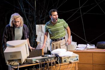 To be precise, the year is 1994, and we are on a university campus in a snug dorm room shared by two very different freshmen students: computer-obsessive Brill and party-hearty Nessa. Each had expected to have a single, but an administrative snafu, which is revealed to us later, has brought them together. Nessa is actually delighted. She always wanted a roommate, someone to become an automatic best friend, to go to parties and moon over boys with. You see, Nessa is less concerned about her studies than the "full college experience," which will be lubricated by use of her fake ID. Brill, however, is worriedly glued to her computer screen, which is hooked up to a monitor and several other devices by enough cords to run the holiday lights at a Christmas tree lot. She groans and gasps in despair over her read-outs, and has a bulletin board saturated by lists of online sites, which she is using a "wiper" to remove. Brill is the one who tells Nessaand, by extension, the rest of usthat if she doesn't keep on top of this mission, everyone in the world will go berserk. It is hard to take this premise seriously. If Graber had set his play in the future and suggested advancements to the internet as we now know itdemanding of our attention as it isthat raised its already-dangerous attributes in a way that would drive people berserk, there would be something to work with. Jennifer Haley's The Nether, still running at The Jungle, is a great case in point. But the status of our technology in 1994 is known to us. The idea of a network connecting data of computers from a distance was proposed at least as early as 1960 (by J.C.R. Licklider), with variations of that concept under development ever since. The World Wide Web was created in 1989 and went live in 1990. In 1992, Congress passed the Scientific and Academic Technology Act, which defined the internet and laid parameters for its uses. In 1994 there was no Facebook, no Twitter, no iTunes, no Hulu, no Expedia; Amazon was a start-up founded that year. Yet, we are asked to imagine that the technology in 1994 beheld a monster with the power to drive humankind berserk, and that an 18-year-old lone wolf with zero social skills (natch) was the only one who knew this, making her responsible for saving humankind. Actually, Brill is not the only one in the know. Monster's third character is Greg, a 21-year-old dorm Resident Assistant. Greg is handsome and attentive to the students in his charge, which draws Nessa's interest (she announces to Brill, "Roommates! We're going to do everything together! Except Greg, I saw him first. Cool?"), but Greg has some unspoken connection to the mysterious workings of Brill's computer. In the course of the play's ninety minutes, his involvement in Brill's obsession becomes known to us, which is not to say it becomes clear, as not much in Monster is ever really made clear. The ending, in which the three characters have all gone through major changes, leaves each of them no more believable than when we first met. Jamie Fields is a hoot as Nessa, a terrific caricature of the type of student who goes to college raring for sex and booze, yet nice and chipper as she can be. Fields exudes comic energy and great physicality as she restlessly rolls around her bed, obsessively changes outfits (which look straight off the rack at Forever 21), and chatters endlessly about nothing. Kelsey McMahon also does a good job as Brill, actually believable as a young adult enmeshed in what she believes is the most important thing ever, unable to turn from it. McMahon plays the part well, anxiously drawing her fingers through her hair and rubbing her eyes to stay awake (she has a regimen of sleeping 20 minutes every four hours), not meaning to be rude, just not bothering to be otherwise. Avi Aharoni is less successful in depicting Greg. He is too nervous and officious at the start to convincingly be an R.A., then suddenly becomes a sly manipulator, with nothing to bridge these two faces. Director Meg DiSciorio no doubt has confidence in the material at hand, but there is little she can do to bring sense to this story. Sean McCardle designed a great dorm room facsimile, with wires sprouting up from it in all directions, embodying the emergent web. Kevin Springer's sound design provides the electronic noises associated with the technology. The light board malfunctioned just before the performance I attended, so the play was performed with the work lights on, without the benefit of Jessie Cogswell's lighting design. Unfortunate as this was, it is hard to conceive that nuanced stage lighting would have brought logic to Monster. Are there real threats in the omnipresence of the internet and its ability to convey falsehoods, foment hate, trigger disorder, normalize evil, and generally bring out the worst in human nature? Clearly, yes. One has only to look at its use in recruiting terrorists, undermining confidence in democratic institutions, disrupting financial systems, and sexually preying upon underage browsers to know this is true. Are there plays to be written and produced to put these concerns out on the public forum? Sure. In fact, there have been such plays, going back at least to Patrick Marber's Closer in 1997, some forgettable, others brilliant (see: The Nether, above). Let's have more, especially as the issues evolve and the stakes seem to grow more urgent. But let's not have them devised with imagined bogeymen set in what, in the digital era, is ages ago, in implausible circumstances and outcomes. There are real online fires burning right now, and visible up the road crying for our attention. Monster, a Swandive Theatre production, playa through October 7, 2017, as part of the Art Share series at The Southern Theater, 1420 Washington Avenue S., Minneapolis, MN. Tickets: $20.00, Students with ID: $12.00; Art Share members, free. For tickets go to southerntheater.org. For information on Art Share go to southerntheater.org/home/artshare/. For i