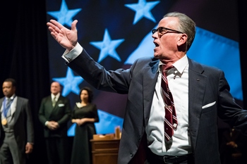The action runs from the day of President Kennedy's assassination, which made Johnson the "accidental president," through election day 1964, when LBJ won a landslide victory (but lost five states in the Deep South, an area that had been solidly Democratic until that election). We are shown LBJ as the consummate political strategist, working to get a civil rights bill passed despite intransigent opposition from entrenched Southern politicians on one side, and criticism from civil rights activists and liberals on the other side that he was doing too little. The bill is ultimately passed, but with the crucial voting rights protections left out. President Johnson promised activists and liberals that voting rights would come, but only after the 1964 election (when "All the Way with LBJ" was the motto), and only if he won. Along the way to passing the Civil Rights Act of 1964, he also has to deal with crises caused by the murder of three Freedom Riders in Mississippi, and a delegate challenge by the Mississippi Freedom Democratic Party at the 1964 Democratic Convention. It is clear that everyone around Johnson doubts what he saysboth when he offers support for civil rights, and when he tells Southern politicians that his support for civil rights is just a ploy to keep liberal support. The audience could reasonably be equally doubtful. We are meant to be convinced of his sincerity based on a story he tells of having been a teacher in an area full of Mexican Americans, describing his despair in seeing how society treated the children he taught. Also, he reminds us of how much he personally sacrifices to get the bill passedincluding the political losses, as when he loses Southern support (and accurately predicts that the South will remain hostile to Democrats in the future). The play itself is a masterful work of ensemble acting, with many actors taking up multiple roles. The leads are excellent. Though Pearce Bunting does not greatly resemble Johnson, he effectively mimics many of his mannerisms and ways of speaking. Shawn Hamilton brings great nuance and quiet dignity to the role of Dr. Martin Luther King, Jr., and J. C. Cutler offers an appropriately slimy J. Edgar Hoover. Only one caution: Andrew Wheeler may play hometown favorite Hubert Humphrey as too much of a nebbish for audience members who are old enough to remember Humphrey somewhat differently. We see multiple sides of the struggle. We go from LBJ negotiating, cajoling, and threatening other politicians, to Dr. King's often tense negotiations with movement allies, who arduously debate the best way forward. The play also provides us with a glimpse (albeit a brief one) into the domestic affairs of Johnson and Martin Luther King, Jr. We watch a mostly self-effacing and desperate-to please Lady Bird Johnson (Jennifer Blagen) deliver a heartbreaking "yes but" type of rationalization of why she puts up with Johnson's adulteries (after all, "he chose me."). Jamila Anderson's Coretta Scott King has few illusions about men or human nature, and she supports her husband's historic work without diminishing herselfor compromising her agency. Her world perspective still cannot save her from being crushed by the revelationcourtesy of MLK-obsessed J. Edgar Hooverof her husbands' dalliances. Anderson gives us a subtle and elegant performance as both Coretta Scott King and Fannie Lou Hamer; as usual, she leaves you wanting to see more. Except in the company of his young assistant and friend Walter Jenkins (Peter Middlecamp) or Lady Bird, LBJ seems always in control. However, later in the play, as the pressure from all sides mounts, we are also shown private moments when the great manipulator curls up, literally in a fetal position, bemoaning the fact that he is unloved and unappreciated. Schenkkan packs an enormous amount of information, and at least two dozen characters, into the three-hour play, somehow weaving it all together into a seamless and often suspenseful narrative. And in current times, it is particular refreshing to find a playwright who consistently displays respect for historical details and recorded facts. Schenkkan tries hard to give us a balanced view of Lyndon Johnson. Inevitably, his portrait remains incomplete, and his legacy complex. The play does not make the mistake of sanitizing the president's disastrous myopia about Vietnam, and Schenkkan is wise to include Johnson's most egregious and unforgettable decisions in the Gulf of Tonkin Incident. All the Way does not try to simplify, though it seems clear that the playwright wants the audience to come away from the play with some admiration for Johnson. And, because of the role he played in ushering the Civil Rights Act through Congress despite enormous obstacles and tremendous pressures, we do. Primary credit for the progress in civil rights is properly given to Dr. King, the other leaders of the Civil Rights Movement, and all of their followers, but President Johnson used everything he had"all his facets," as my grandmother used to sayto make equal rights the law of the land. I had Ken Burn's Vietnam War documentary series fresh in my mind when I saw the show, and when the lights came up, I found myself telling my friend that I wished the play had gone further into that part of Johnson's story "Yes, but that's not the story this play is about," he replied. And he was right, but it made me think about how much our reception and appreciation of a play is shaped in part by all the works we have seen or read before, and particularly by those that touched us most. I saw Christina Ham's excellent play about Nina Simone last year, and this play about civil rights history brought up the memory of that one, and it made me wish that All the Way portrayed more about the role black women played, and sometimes were restricted from playing, in that history. That said, I learned a great deal about Johnson and American politics in 1963-1964 that I didn't know before, and I enjoyed the all-around