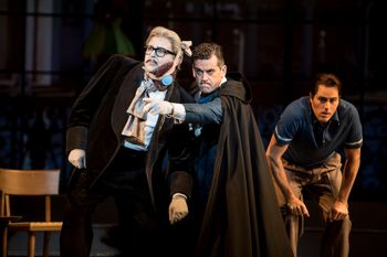 Don Pasquale premiered in 1843 in Paris and was an immediate success and hailed as Donizetti's comic masterpiece. Along with The Barber of Seville by Rossini and The Elixir of Love, also by Donizetti, Don Pasquale was considered the apex of the late 18th and early 19th century comic opera style known as Opera Boffo. These drew upon the structure of commedia dell'arte, with its four recognizable comic character types: a buffoon with a bloated sense of self-importance; a heartsick young man who pines for the object of his love; a wily, high-spirited woman; and a schemer who orchestrates the action. Hudson transported these characters closer to an era that today's audiences can identify with: 1950s Hollywood. He has made Don Pasquale (the buffoon) an over-the-hill star of silent movies, always scheming for his big comeback, a la Norma Desmond. Extending the motif, Hudson framed the opera scenes with footage of Don Pasquale's faux screen careerhis biggest hit, The Sheik of Arabia and other early triumphs, and disastrous later works, with failed attempts to score big in science fiction and westerns that only made him look more obsolete. These were filmed in black and white with the jerky camera work typical of early cinema. The hilarious film clips served to a) entertain, b) let us know everything to follow was meant as a lark, and c) establish Don Pasquale as the buffoon of the piece. The motif of early film even extended to the stage that greeted the audience upon entering the Ordway. Rather than an actual stage curtain, projected on a screen spanning the wide stage was an image of a silver-grey theater curtain, like those in the movie palaces of earlier eras. The curtain undulated where it met the floor as if ready to fling open, creating heightened anticipation for the magic of the movies to capture our hearts. Hudson first staged this vision of Don Pasquale at Arizona Opera in 2014, and again last season at The Atlanta Opera. Minnesota Opera's production benefited from Hudson's continued refinement of his concept, as well as from the costumes, scenery, film projections and props that travelled here from Arizona. The costumes included outfitting the sixteen-member chorus to resemble popular entertainment figures of the 1950s who would be likely to hob-nob with a showbiz luminary like Don Pasquale. Some of these were a little harder to place than others (hey, I was just a wee child in the 1950s), but easy to pin down were Groucho Marx, Clark Gabel, John Wayne in western cavalry garb, and Jackie Gleason and Audrey Meadows in their signature roles as Ralph and Alice Kramden. The plot of Don Pasquale is both convoluted and simplistic. The aging film star has chosen a wealthy bride for his nephew and intended heir, Ernesto (the heartsick young man). However, Ernesto spurns the match, for he is in love with a Hollywood starlet named Norina (the wily, high spirited woman). Considering Norina unsuitable and angry at his nephew for refusing to obey his wishes, Don Pasquale cuts off Ernesto's support and decides to produce his own heir by finding a bride of his own. He consults his physician, Dr. Malatesta (the schemer), who thinks Don Pasquale is being extremely foolish and unfair. To make that point, Dr. Malatesta concocts a plot to trick Don Pasquale by inventing a woman so perfect, Don Pasquale will be ready to marry her sight unseen. The doctor then recruits Norina to play the part of this fictional "perfect" woman. She is presented at first as a virginal, compliant maiden. Dr. Malatesta also has in tow an actor to play the part of a notary who conducts a sham wedding ceremony. As soon as the marriage is sealed, the "bride" transforms into a willful, extravagant reveler. She redoes the Don's darkly subdued home to resemble a Miami Beach hotel lobby, spends recklessly on clothes, jewelry, and entertaining (hence the chorus of celebrities), belittles the Don's aging masculinity and insists on going out on the town with handsome Ernesto as her escort. Things finally become intolerable for Don Pasquale, who begs Dr. Malatesta for relief. Without completely giving away the ending, I can assure you that it concludes happily for all four principals. Bass-baritone Craig Colclough, who played Don Pasquale, has a majestic voice. Moreover, his performance was sublimely comic, preening with vanity as he prepared to seek a bride, taking delight in besting his recalcitrant nephew, and suffering all kinds of agony under the thumb of his willful and demeaning wife. Andrew Wilkowske was deliciously devious as Dr. Malatesta, exuding delight in putting the pompous old codger in his place, and energized by his mischief-making. A scene in which he flourished a long cape in order to hide Ernesto from Don Pasquale was terrific physical comedy. Wilkowske, too, has a phenomenal voice. A comic duet sung by Wilkowske and Colclough was one of the highlights of the evening, leading to a break in the fourth wall as they returned to stage coaxing the obliging audience to request an encore. Susannah Biller played Norina, her powerful soprano beautifully delivering her character's part while she had a field day switching personas between her roles as the demure maiden, the shrewish wife, and her free-wheeling actual self. As Ernesto, tenor David Walton has the most glorious voice of the fourwhich is really saying something. He sang his part with passion, conveying Ernesto's indignation at being disowned by his uncle because of the woman he loves, and his romantic yearnings for that woman. Walton and Biller shared a love duet that was another of the opera's stand-out moments. Unusual for an opera, Ian Christiansen played Max, a character that is completely silent, the head of Don Pasquale's household staff. In his program notes Hudson related the opportunity he had to study with the great mime, Marcel Marceau. The use of stylized movement, with exaggerated gestures and responses to people and events, so central to Marceau's wo