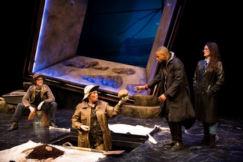 That's the story in a nutshell, and in a nutshell is an apt description of Park Square Theatre's current production. Hamlet is Shakespeare's longest play, running four hours if played in its entirety. For this reason, it is typical for productions be somewhat edited. Joel Sass, who adapted the play for Park Square, and directs as well, has cut it down to under two and a half hours, with twenty minutes of that taken up by the intermission, making it a swift piece of storytelling. To Sass' credit, the narrative and relationships among characters are clearly depicted, though whole swaths of the story have been exilednothing of Hamlet's schoolmates turned spies, Rosencrantz and Guildenstern, nor of the ongoing war between Denmark and Norway, including the character of the Norwegian Prince Fortinbras, and scenes are edited throughout. Purists are likely to miss the missing pieces but there is much to be said for a Shakespearean tragedy moving with speed and clarity. However, Sass goes a step further, staging Hamlet in a peculiar setting (which he designed) that includes a large neon-rimmed rhomboid funnel through which characters sometimes enter and exit. This creates a sense of a zoom-in, as if when characters stand within the cube we see them in close-up. There are also video projections of iconic backgrounds and dissolves that look like blood dripping down a pane of glass. Booming musical notes signal foreboding between scenesreminiscent of the drumbeats between scenes on "Law and Order." There are updated details, such as Hamlet carrying a revolver and the guards carrying machine guns, as well as a joke that uses a fistful of condoms to nail its punchline. With these and other snazzy effects, along with the show's rapid pace, Sass seems to be aiming for a digital age Hamlet. There are gains to be had from this, no doubtespecially in terms of reaching the students who form a large share of Park Square's audience. Park Square prides itself, with good cause, on serving more students than any other theater in Minnesota (drawing also from western Wisconsin and northern Iowa)30,000 school visitors last year. The current run of Hamlet includes 15 student group matinees. We want those young audiences to enjoy and relate to Hamlet, and leave the theater wanting more. However, in this drive to trim, hurry and digitize the play, it loses some of its heart. The technology and speed frequently overwhelm the feelings attached to the words. I found it difficult to attach emotions to the characters, to be moved by Hamlet's crisis of faith and confidence, or to be disturbed by any of the deaths. Hamlet's greatness stems in part from the depths of its ideas, as well as its glorious language and brilliant speeches. But without heart, that greatness is diminished. This is in no way the fault of lead actor Kory LaQuess Pullam, taking a great leap forward in stature with this performance. Pullam has been a strong presence on Twin Cities stages for several years, with wrenching turns in Pillsbury House's Prep and the Guthrie's Choir Boy. The man knows how to draw forth emotions. His Hamlet conveys the agonizing confusion, unsteadiness, fear and abandonment of the prince. He shifts seamlessly from Hamlet's torturous self-loathing to outrageous grandstanding. But those around him do not meet his lightning bolts to create completed emotional circuits. His electric charge dissipates in the still air around him. Sandra Struthers has a suitably royal bearing as Hamlet's mother Gertrude, but in the pivotal scenes between them, does not catch fire. She does, however, succeed in conveying the sense that Gertrude was not aware that her late husband was murdered by her present one. Maeve Coleen Moynihan is sweetly adolescent as Ophelia, but seems no match for Hamlet. It is hard to believe he has abandoned her, for it is inconceivable that he ever was hers, and there is little spark between them. Kathryn Fumie plays Hamlet's loyal friend Horatio, a gender change in casting that makes little difference to the character, but the fact is this staging gives Horatio little to do but deliver messages. His loyalty to Hamlet is stated, but not portrayed. Charles Hubbell comes across more strongly as Claudius, the murderous usurper of the King's throne and wife. His soliloquy in prayer is a high point. Wesley Mouri is effective as Laertes, Ophelia's steadfast brother who conveys an honorable nature as he seeks justice for his sister and mother. I say mother because, though Shakespeare wrote the part of the prime minister as Polonius, father to Ophelia and Laertes, Sass has changed the character's gender, naming her Polonia. In this case, the gender change makes a striking difference. The scene in which Polonia orders Ophelia to disavow romantic feelings for Hamlet comes across differently spoken by her mother than were it by her father. Tinne Rosenmeier is wonderful in this part, embracing the Prime Minister's overly fussy and officious demeanor while conveying a mother's love for her two children. She is also very good as Gravedigger 1, bringing out the earthy and ironic humor intended for that scene. Thought the physical production concept exchanges heat for heart, the lighting design by Michael P. Kittel and the sound design by C. Andrew Mayer do excellent jobs of making the contributions asked of them. Alice Fredrickson designed costumes in more or less contemporary mode, excepting the ghost of King Hamlet's garishly green regal robe. Ophelia's wardrobe emphasizes her youth and innocence, while Hamlet's highlights his muscular strength, widening the gulf between them. Gertrude sports stylish, expensive-looking numbers fit for a queen. Fight choreographer Aaron Preusse has staged the swordplay with verve and verisimilitude. Park Square's production of Hamlet certainly presents Shakespeare's timeless story of moral ambivalence and the price of uncertainty. It delivers the best known speeches, each a touchstone of our culture, and