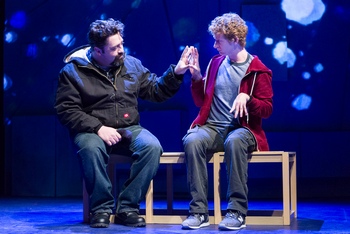 Christopher Boone is a most unlikely heroa fifteen-year-old boy who appears to be on the autism spectrum (though his diagnosis is never mentioned), gifted in mathematics. The play begins in the mid-size city of Swindon, eighty-some miles west of London, with Christopher grieving over the body of his neighbor's dog Wellington, who has been murdered with a pitchfork. Christopher decides to track down the murderer, despite a "caution" filed by the local police after Christopher hits an officer who attempts to lift him off of Wellington. His father Ed, a plumber, has his hands full raising Christopher on his own and firmly directs his son to let the matter drop. Siobhan, Christopher's teacher at the special school he attends, suggests that he turn it into the story, but Christopher cannot abide fiction, which he equates to lies. He can only write what he knows is true. Drawing on his prowess as a logician and summoning unexpected courage, he pursues the case. Along the way he discovers surprising things about his father, his departed mother, and himself. Curious Incident is one of the most successful dramatic plays of the past couple of decades, both critically and commercially. On Broadway it played nearly two years, the longest run of a non-musical play since Proof opened in 2000. It won the 2015 Tony Award for Best Play, having taken the 2013 Olivier Award in that category for its in West End production. The New York production also won awards for its director, scenic and lighting designers, all of whose work was seen by those fortunate enough to catch the national tour that played at the Orpheum just over a year ago. Much of that production's genius was its use of extensive scenic, lighting and sound elements and an ensemble of ten actors beyond those in the main roles, to simulate the workings of Christopher's mind, making visible to the audience the way in which he processes such puzzles as moral dilemmas, detective work, the chaos of a busy railroad station, and the frenzied of travel through the London underground. In the far more intimate confines of Mixed Blood's Alan Page Auditorium, and under director Jack Reuler's inventive hand, sight and sounds are still used extensively, abetted by the use of video projections on the rear of the open stage, but not of the magnitude seen in the original work. Rather than illustrating the workings of Christopher's mind, they seem to establish his mood and the physical context of his experience. There is also an ensemble who depict the boisterous crowds Christopher must navigate, but it comprises only five actors. With the production's effects dialed down several notches and the audience physically closer to the play, this production draws viewers more fully into Christopher's world, so that, rather than merely observing his story, we viscerally experience it. Notwithstanding the greatness and genius of the larger productions, Mixed Blood's rendition delivers its own brand of genius, with a more emotional connection to our hero's journey. Aside from a clear-eyed director who can balance the physical hardware with the tenderness of the material, and a top-notch design team (with praise for Karin Olson's lighting, Andrew Meyer's sound, Kathy Maxwell's video), The Curious Incident of the Dog in the Night-Time demands an actor who can believably portray a fifteen-year-old like Christopher, maintaining the low-effect delivery of highly emotional circumstances, revealing his challenges as both a burden and a gift. MacGregor Arney accomplishes just that in a wonderful performance, unselfconscious and authentic throughout. Arney's performance has Christopher being a bit more physically agitated, with elbows and shoulders seeming to have minds of their own, than others I have seen, but it is all of a piece that works beautifully, and establishes without a doubt that Christopher is a true hero. As his father, Zack Myers does a beautiful job of displaying Ed's deep love for his son, along with his always-on-the-brink frustration with the challenges of coping with Christopher's behavior, and meeting his distinct needs, which includes going to the mat to allow Christopher to take the national math exam three years early. When some poor choices and impetuous acts cause Christopher to lose trust in his father, Myers portrays Ed's earnest efforts to rebuild a bond with a child who has no sense of nuance, measuring everything in absolutes of good and bad. Regan Linton is warmly wonderful as Siobhan, a teacher who ought to be on the short list for Teacher of the Year, able to draw Christopher out of his inner world, to build his confidence in himself, and most importantly, totally accept him as he is. In scenes in which she does not take part, Linton sits on the side, watching her student take charge of his life, and beaming with teacherly pride. Miriam Laube plays Christopher's mother. Seen in flashback early on, I found her overly flourished, trying too hard to find joy in a disappointing life. As we see more of her, she wins us over with the painful restraint she must show in withholding physical affection for her son, and in rising to the occasion when he needs protection. The rest of the cast members, who form the ensemble in crowd scenes, also take on small roles, all performing their parts well. The precision movement required to enable those crowd scenes to be seen from Christopher's mind's eye is no small matter, the contribution of movement director Brian Bose. The cast maintain convincing English accents throughout, with support from accent coach Cheryl Willis. Having experienced The Curious Incident of the Dog in the Night-Time as a book, as a National Theater live broadcast, as a Broadway hit, via the excellent touring company, and now as an intimate drama in the abundantly talented hands of the cast and creative team at Mixed Blood, it has not diminished, only gains more in its power to display a triumph of spirit with heart, humor, and a generous s