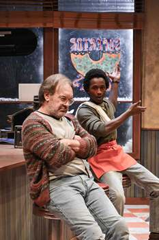 Superior Donuts is a good, if not great, play, with a pair of highly likeable lead characters, and a satisfying, if somewhat formulaic, storyline. It has taken nine years for Superior Donuts to land on the stage of a Twin Cities theater company. While not quite a "stop the presses" event, it is well worth taking the opportunity to see it, especially as Lyric Arts Main Street Stage has assembled a winning cast, a firm directorial hand, and provided a handsome physical production. The play takes place completely in the confines of the titular donut shop, a small operation in Chicago's Uptown neighborhood handed down to Arthur Przybyszewski by his Polish immigrant father. Arthur grew up in the Polish-American enclave of Jefferson Park, but his father setup his business in Uptown, a once thriving neighborhood now on the skids that offered low rents. In 2008 gentrification has come to Uptown, and Arthur, now in his early 60s, faced with rising rent and flagging energy, struggles to keep up with the Starbucks across the street. If Arthur feels strongly about anything it is to avoid change. By his very appearance we see that he is stuck in the long hair and torn jeans wardrobe of his youth. His business neighbor Max, a gregarious Russian, begs Arthur to sell the shop to him so he can expand his video store into a full-line electronics mart. Arthur refuses, more to avoid the uncertainties of change than out of any loyalty to his father's legacy or joy in his daily work. Enter Franco Wicks, a 21-year-old African-American who comes about the help-wanted sign Arthur has posted in the shop window to replace his sole employee who recently bailed out. Franco's entrance establishes him as a bright, funny and ambitious young man, and he bowls Arthur over into giving him the job. Immediately, Franco proposes changes to bring new life to the shabby donut shop, like adding healthy food choices, putting up art work, getting a radio (Arthur really keeps the place spare) and playing music, and holding poetry readings. Franco reveals himself to be an aspiring writer with the first draft of his self-proclaimed great American novel. Arthur and Franco make an odd, but touching and quite funny pair, and the shop seems to be hanging on, if not quite thriving. We also meet a loan shark who promises to cause trouble, and a sweet homeless woman called Lady, a pair of beat cops, James and Randy, who may be nurturing a crush on Arthur, who, for his part, is terrified of taking a chance on happiness. Between the play scenes, Arthur offers soliloquies in which we learn about this life up to this pointhis childhood in the working-class mecca that was Chicago in the 1950s, his political awakening in the 1960s that caused a falling out with his father, a period of drift, a failed marriage, and an estranged child. Two dominant themes emerge: the father-son dynamic between Arthur and Franco, and the futility of resisting change, along with the gains and losses change can bring. There is nothing very deep or revelatory in these, but the points come across through dialogue that rings true, a believable storyline, and a winning balance of sharp humor and tenderness. It is all very nice, if less than compelling. Director Matt McNabb pumps up the production at Lyrics Arts by giving it a steady pace, fast enough to hold interest, but with time enough to see past the barbs in the dialogue to sense the character's motivations and feelings. Arthur's soliloquies seem to be an awkward ploy used by the playwright to provide background not delivered through the narrative, but McNabb manages to integrate these seamlessly into the flow of the play. Jeffrey Goodson is terrific as Arthur, creating a fully believable man who was worn down early in life and never found a way to regain a sense of joy or purpose, but keeps going for lack of anything better to do. In his relationship with Franco, Goodson reveals the glimmer of pleasure Arthur can take in finding something of value in his life. Malick Ceesay is equally fine as Franco, animating the young man with a confidence and intelligence, but also showing us his prideful vulnerability. Among the other actors, Jamie White Jachimiec nicely plays Randy as a tough gal able to hold her own among fellow cops, but who is awkward with facing softer feelings. Her partner James is played well by Richard "Doc" Woods, a good cop with long ties to the neighborhood. Bill Williamson as Luther, the loan shark, does a swell job as a lout who has carefully polished his good-guy persona. Martha Wigmore creates a poignant image as Lady, the homeless alcoholic adrift in her own world. Only Peter Aitchison, as Max, is off-key, pushing the Russian's bravado and bluster to the point of caricature. Gabriel Gomez has beautifully imagined Superior Donuts with his stage design, putting in all the details to make the long-lived establishment feel like the real thing, down to such minutia as an "Employees Only" sticker on the metal swing door between the shop and the kitchen in back. Jim Eischen's lighting is superb, with outside lightsunlight by day, streetlight in the eveningshining into the interior space through the large plate glass window, and smoothly transitioning back and forth to spotlight Arthur's monologues. Lucas Skjaret's costumes are just right for each character. A highly unlikely fight that is a pivotal moment for the play is grippingly staged by fight director Aaron Preusse. Dialect donsultant Keely Wolter has done excellent work coaching the cast in their respective Chicago-Irish, Polish-American and Russian accents. There is so much good work on the Lyric Arts stage that one wishes the play were a bit stronger. Some elements seem tossed in without any reason, other than to add a bit of humor, such as one character's secret life as a "Star Trek" loyalist, while others that cry for more understanding, such as Arthur's relationship with his daughter, are left untapped. Tracy Letts' earliest plays, such as K