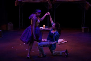 Cardboard Piano's first act takes place on New Year's Eve, 1999, in a rural township in northern Uganda. The church is led by a white missionary and his wife. Their teenage daughter Chris looks forward to leaving the territory wracked by civil war and anti-western factions. However, Chris will not be leaving with her parents. Instead, she plans to escape with Adiel, a township girl with whom Chris is in love. This very New Year's Eve they conduct a secret wedding ceremony, pledging themselves to one another. Having discovered this plan, Chris' parents have turned her out, unable to accept her love for another girl. Adiel's parents have been killed in the fighting, so why not leave together for a place where they can be safe, safe from war and from hateful judgments? Their ardor is interrupted by a 13-year-old boy soldier, seriously wounded and seeking shelter from the fighting. Pika was forced to serve in a rebel group, forced to do horrendous things. He wants to get away and is now being hunted down himself. Their encounter seems like a godsend, a gift that will help them cast off the fears and shame they bear. We learn about a cardboard piano that becomes a metaphor for hope and healing, uniting Pika with the girls. But in a time and place like this, can they really escape the grip of hatred? Act two is set in that same church fourteen years later. The community is calmer now, at least not in outright civil war. No longer are there white missionaries. The church, nicely restored, is now led by Pastor Paul, who in turn is led by his wife Ruth, an outspoken woman from the city who followed her heart to marry Paul and live in this remote district. They are about to celebrate their anniversary when Chris enters. She has returned to the church for the first time since her escape to honor her father's dying wish that his ashes be scattered there. For all these years, she and her father remained estranged, so this is her last chance to make peace with him. Ruth warmly welcomes Chris but Paul is uneasy with her request. Another man from the village, Francis, shows up. Together they discover things about the past and the present, challenging things that force each to face the choices they must make, and the reality that there are no easy solutions. Playwright Hansol Jung writes with insight into the conditions of life under siege, of a country gone mad with rage masquerading as ideology, and of a society that has absolutely no tolerance for same-sex love, with lovers forced into hiding, with their very lives at stake. Jung is from South Korea and from the sources I have found, most of her plays to date include Korean characters, or have some reference to her homeland. She is affiliated New York-based Ma-Yi Theater Company whose primary mission is to develop and produce new plays by Asian-American writers and shape the national discourse about what it means to be Asian American today. With Cardboard Piano, she seems to have set aside those aims, though she still addresses the theme of "otherness" that Asian Americans often face. In spite of the territory being far from Jung's base, she skillfully delineates the place and the characters that bring Cardboard Piano to forceful life. Adelin Phelps is excellent as Chris, impulsive and headstrong as the teenager in act one, weighed down by the harsh experiences of life fourteen years later in the second act. Phelps adeptly conveys the loss of joy and onset of despair, while still holding on to a shard of hopewhy else return to Uganda? Kiara Jackson is completely winning as Adiel in act one, somewhat naïve but committed to the love she has claimed. There is sparkling chemistry in the early scenes between Phelps and Jackson as two teenagers in love, especially when they sing "Unchained Melody" together. In act two, Jackson ably plays Ruth, a worldly, confident pastor's wife, sure of her status until the light of truth brings about a fall. Jackson shows finesse in differentiating the accents between the speech of rural Adiel and sophisticated Ruth, though those accents sometimes make it difficult to catch every word. Michael Jemison is heartwrenching as Pika, the boy soldier, forced into degrading his own spirit, and desperate for a path to redemption (setting aside the quibble that Jemison seems tall for a 13-year-old). In act two he conveys Francis' dignity, strength, and righteous outrage. Ansa Akyea is appropriately menacing in the role of a solider hunting down Pika in act one. In aact two he has much more to do, superbly depicting the affirmative pastor Paul who is unstrung by his encounter with the truth that Chris carries with her. Director Signe V. Harriday does not shy away from the strong emotions embedded in the play, both the erotic pull of love between the two teenage girls, the graphic description of atrocities committed in war, and the inflamed hatred toward those who have been decreed as evil simply by virtue of who they are and who they love. Harriday uses these emotional surges to move the play forward, making each moment seem the natural, inevitable result of what came before. She draws upon sound (Jacob M. Davis, designer) and lighting (Michael P. Kittel) to intensify the feelings of danger and fear that occur, especially as a rising arc in act one. The play is well served by Sarah Brandner's set design, with the shelled out church nicely restored for act two, and by Sara Wilcox's costumes. The leap between act one and act two prompts questions unanswered by the playwright. How did Chris live for those fourteen years, as a teenager apart from her parents? Nothing is ever said about that which might strengthen the moral authority Chris carries on her return to Uganda. Of course, we have to take life based on what knowledge is given to us, not based on speculation of the unknown. Still, one can't help wondering how those fourteen years had impacted Chris. In spite of these gaps in the narrative, the gripping circumstance Jung invents 