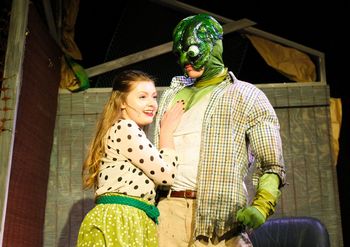 In fact, The Toxic Avenger turns out to be a great idea for a musical. While, like the film, it makes a modest statement about the evils of toxic waste and collusion of big business and politics (still sadly pertinent 34 years its release), it is mostly a good-hearted, snarky and giddy send-up of creature-features and super-hero flicks. The book and music were created by Joe DiPietro and David Bryan, respectively (they collaborated on lyrics), who went on to win Tony awards for the score and book of Memphis a few years later. The director of the show's first appearance at the George Street Playhouse in New Brunswick, New Jersey, was John Rando, who knew his way around off-beat material after winning a won a Tony directing the similarly toned Urinetown. Armed with a crackerjack team, The Toxic Avenger emerged as a delightful, goofy, slightly ghoulish romp. None of that is wasted by Minneapolis Musical Theatre, whose production now playing at the Phoenix Theatre in Uptown is a blast in every way. The five cast members all are terrific and throw themselves 110% into their performances; the four-piece band sounds great (and, positioned center stage amid the fun, do a yeomen's job of keeping straight faces); the show is swiftly paced by director Ryan McGuire Grimes, leaving little dry air between the sea of jokes, lively musical numbers, and inventive staging; and the design crew has provided just the right look and sound. This is way more fun, and more polished, than an arch musical about a slime creature has any right to be. The audience is greeted by the sounds of an industrial Jersey harbora medley of machines, trucks, ships' horns, waves lapping, and gulls cawing. The show opens with an introduction to Tromaville, New Jerseythe most polluted in New Jersey, which is saying something ("Who'll Save New Jersey?"). Sarah, a blind librarian, would-be writer of best-selling novels and otherwise typical "Jersey Girl," is aghast at the destruction of her hometown. Melvin, a sweet-faced dweeb who is in love with Sarah, vows to end the pollution to win her heart, even though sheafter feeling his facedecides that his isn't much to look at, so her interest is purely platonic. When Melvin confronts Tromaville's ambitious and corrupt Mayor Babs Belgoody, who is taking pay-offs to let outsiders dump their toxic waste there, she deflects his accusations with a bogus appointment as her deputy. Thus caught off guard, Melvin is snatched by the mayor's goons who "Get the Geek," tossing him into the contaminated harbor. They leave him for dead, but Melvin emerges, transformed by the stew of chemicals bubbling in the waters of Tromaville, into the title character. He intervenes when those same goons are about to molest Sarah, earning her adorationand lust (there's the cue for "Thank God She's Blind"). He tries to tell her he is toxic but she interrupts, thinking that is a French name, making his appeal all the greater. She calls him Toxie for short, waxing romantically about "My Big French Boyfriend." For Melvin's long-suffering mother, his transformation into a monster is par for the course, another disappointment ("Big Green Freak"). Between the mayor's plot to stop this new green hero from foiling her plot, Melvin's mother's attempts to find a cure for his condition, Melvin/Toxie's fear that he will lose Sarah's love all over again if she feels his monstrous face, and Sarah's attempts to lure him into a more physical relationship, things keep hopping, leading up to a dazzling confrontation between the mayor and the motherdazzling because the same actor (Kim Kivens) plays both roles. They hold back nothing in their vitriol for one another: "Bitch/Slut/Liar/Whore." I won't reveal how it all ends, but I can tell you I left the theater feeling greatnot just about the outcome of the show, but about the abundance of joyful energy, talent and affirmation that we can have fun at the theater. Tristen Sima is pitch perfect as Melvin/Toxie. He is seriously dweeby before his transformation, pining for the undeserving Sarah, and becomes a brave, though humble, people's hero, aided by chest padding to create the requisite physique. His singing is a bit strained, but one would not expect either Melvin or Toxie to be much in the way of a crooner. As Sarah, Rachel Schmidt draws out the ironic humor in her shallow perspective on life, most fully displayed when she has finished her novel and begs her idol to "Choose Me, Oprah!" Both Sima and Schmidt are new faces on the Twin Cities theater scene, and I anticipate we'll be seeing more of them. Back to that mother/mayor face off. Kim Kivens has been marvelous in many comic rolesher Muriel in Minneapolis Musical Theater's Dirty Rotten Scoundrels and her turn as a mother Sneetch at Children's Theatre Company are two prime examplesbut here she is simply incredible. Her shtick as Melvin's mother and her tough-as-nails mayor are each greatly crafted comic gems. When she combines the two, with the help of Christian LaBissoniere and Jordan Mitchell in wigs and look-alike outfitsand quick off stage costume changes (props to the backstage crew)she raises the bar for musical comedy performance. She is also swell trying to convince Sarah not to give up on Melvin/Toxie, because, after all, "All Men are Freaks." The aforementioned Christian LaBissoniere and Jordan Mitchell are listed in the program as "White Dude" and "Black Dude" respectively, which means they play all the other partsthe mayor's thugs, a doctor, and a scientist treating Melvin's condition, Sarah's bubble-headed be-wigged best friends who serve as her back-up singers, a folk singer (LaBissoniere warbling "The Legend of the Toxic Avenger"), and various citizens of Tromaville. Both gents do a grand job of switching gears and costumes, throwing themselves into each part with top-notch song and dance moves. And, speaking of dance moves, choreographer Emily Madigan has been remarkably inventive with a cast of only five, creating