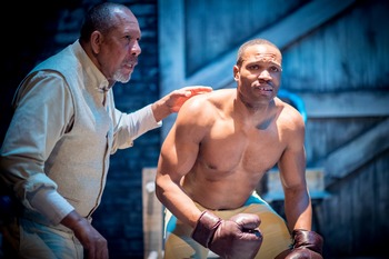 The Royale takes place over a year in the life of Jay Jackson, a black boxer in early 20th century Jim Crow. The fictitious character is based on the real Jack Johnson who, in 1908, became the first African American to win the title as Heavyweight Champion of the World, defying the Jim Crow restriction on matches between black and white boxers. Johnson had held the title World Colored Heavyweight Champion, but that was viewed as a lesser rank. Johnson beat the de-facto world champion, Canadian Tommy Burns, in 1908, but was decried by some as a false champion, as the previous official world champ, Jeff Jeffries, had retired undefeated. For two years Johnson hounded Jeffries to return to the ring so that Johnson could once and for all prove himself Champion of the World, while a host of white boxing fans searching for a "great white hope" to take the title away from Johnson, also urged Jeffries to return. In 1910 that match, dubbed "the fight of the century" took place. Johnson won, proving himself indisputably the Heavyweight Champion of the World, a title he retained for five years. Ramirez combined those two historic matches, inventing World Colored Champion Jay "The Sport" Jackson who demands that his promoter Max draw the retired world champion, here named Bernard Bixby, out of retirement. Jackson contends that Bixby is not the world white champion, but the champion of the world, period. That's the title The Sport wants, knowing it challenges Jim Crow and the deliberate barriers holding African Americans back. He believes he can be the first to break through those barriers, and will not be stopped. To prepare for the match he hires one of his toughest opponents, called Fish, as his sparring partner, and the two become fast friends. Jackson's trainer Wynton believes The Sport can take the title, but also knows it will come with a heavy price, including the possibility of violence against a black man audacious enough to claim the highest title. Jackson's sister Nina travels from their Mississippi home to urge her brother to reconsider, yet she is part of the inspiration that drives him to persevere. There is no actual boxing on view in The Royale. Instead, Jackson and his opponents enact the intense and strenuous moves of boxing facing the audience rather than each other, thrusting their fists forward, indicating the jabs that connect with a mighty stomp upon the wood-planked boxing ring that in the elegant set designed by Katie Phillips, and the recipient of those blows recoils backward, expressing with the face and voice the degree of pain they absorb. Aaron Newman's sound design provides percussive beats, augmented by other characters' hand claps that give each match a rhythm and pulse, with two combatants racing against the clock to knock their opponent out. Cast member Santino Craven is credited with coaching the actors in these choreographed segments, and the effect is mesmerizing. David Murray (Coalhouse Walker in Theatre Latté Da's Ragtime) returns from his New York City base to play Jay Jackson. He delivers the character's confidence, intelligence and swagger, convincingly determined to be "the first," not for fortune but as a matter of principal. He is also charming and articulate with the press that follows him everywhere (lighting designer Courtney Schmitz uses flashbulbs popping to great effect in marking Jackson's celebrity status). Twin City acting veteran James Craven is a perfect voice of experience as Jackson's trainer, pushing his man to grab the ring but all too aware of the pitfalls ahead. Charles Fraser as the promoter conveys the difficult balance between being a "good" white man, making Jackson's career his own life's work, with having to do business in a world where whites hold all the cards. Santino Craven (James' son) gives a moving depiction of Fish's devoted friendship and support for Jay. Tamala Lacy, as Jackson's sister, makes an impassioned case for accepting a status quo that may hold her people back, but at least allows them to live. Music is used effectively as a backdrop to The Royale with obscure roadhouse blues tunes greeting the audience in the theater, and maintaining the connection between scenes. As mentioned, light, sound and set all converge to create the environment to support the text and performances, and Aaron Chvatal's period costumes contribute as well, including a gorgeous dress worn by Nina, ivory in color, as if that is as close to white as she dares. The design elements are all seamlessly integrated into heat of the play, with such details as Nina stopping to remove her hat pin before taking off her hat. The real Jack Johnson's story was no slight footnote in sports history, but a major step in the slow progress toward equality among the races. Incidentally, Howard Sackler's 1967 play The Great White Hope and the 1970 movie based on it, also draws from Jack Johnson's saga, with its protagonist named Jack Jefferson. If Sackler's play is closer to a biography of Johnson, The Royale is conceived more as an allegory, providing a way of understanding the inner drive and courage, along with a large dose of egotism, to look squarely at a wall and declare that the wall is coming down. The Royale is one of the very best Twin Cities productions mounted so far in the 2017-2018 seasondare I say, a total knockout. I will happily return to Yellow Tree, but they will be hard-pressed to match the caliber of this production any time soon. The Royale continues at Yellow Tree Theatre through March 4, 2018, 320 5th Ave SE, Osseo MN. Tickets $23.00 - $27.00; $10.00 rush tickets starting 30 minutes before each performance, pending availability. For information and tickets call 763-493-8733 or visit YellowTreeTheatre.com. Writer: Marco Ramirez; Director: Austene Van; Scenic Design: Katie Philips; Costume Design: Aaron Chvatal; Lighting Design: Courtney Schmitz; Sound Design: Aaron Newman; Prop Design: Abbee Warmboe; Fight Choreography: Santino Craven; Sta