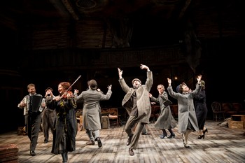 Polish-Jewish writer Sholem Asch was born at the tail end of the "enlightenment" of central and eastern European Jews known as the Haskala. In 1906, Asch, already known for short stories and novels, wrote his first play, God of Vengeance. It involves a brothel operated by a Jewish man named Yekel, married to Sarah, a former prostitute. Yekel desperately seeks respectability, a wish he projects onto his daughter, Rifkele. To this end, he fervently keeps her away from the working women in the basement below the family's apartment, commissions an ornate Torah scroll to serve as a sign of her virtue, and arranges her marriage to a respectable young man. However, Rifkele had fallen in love with one of the prostitutes, Manke, a relationship that is both tender and frankly physical. Indecent imbeds excerpts from Asch's play into an account of its creation by the idealistic playwright, encouraged by his forward-thinking wife, its success in Berlin, and other progressive Yiddish cultural hubs in eastern Europe, to Asch's immigration to the United States in 1910 and the successful staging of God of Vengeance amid New York City's flourishing Yiddish theater scene. God of Vengeance is translated into English and presented at the Provincetown Playhouse in Greenwich Village where it reaches new, approving audiences. But in 1923, producer Harry Weinberger pushes too far by opening the play on Broadway, where it faces a much broader public. The play is shut down and the cast and producers arrested on charges of indecency. If this sounds like a full disclosure of the plot of Indecent, I assure you it is merely the frame upon which Vogel laces her characters, both imagined and historic, with their own struggles and desires in relation to Asch's play, both to the storm surrounding its production and to the content embedded within. Vogel layers so many themes that it kept my mind engaged long afterward. Among these are the inspiration that moves an artist to create and its counterweight, the burdens that deflate creative drive, as Asch's relationship with the fruit of his own fertile mind is markedly altered as it advances up toward mainstream success. We see the challenge facing artists trying to shift from their spoken language, Yiddish, to ply their art, whether on page or stage, in strange foreign tongue: English. We witness the nourishment that art provides and the inextinguishable urge to create, in even the worst of times. We are moved by an image of pure and innocent love, debased by a society fixated on laws beyond the control of mortals. All that, and more. Director Wendy C. Goldberg presents Indecent as a non-stop journey, cradling us through the troubling and hopeful paths taken by Asch, his actors, and his creation. The setting designed by Arnulfo Maldonado is a wonder in its own right, using the thrust stage to create a dusty wreck of a once grand theater, with red velvet seats facing us, ornate plaster work, and a dome overhead from which a chandelier most likely once hung. Anne Kennedy's perfectly rendered costumes span the traditions of eastern European Jewry and the stylish look of 1920s theater folk. Josh Epstein's lighting uses shafts of light to represent the anguish of waiting, be it for a new life or the end of life, while Alex Basco Koch provides projected titles in English and Hebrew that eloquently identify the language characters are speaking (we hear it all in English), their location, shifts in time, and historical context. The cast of seven actors is sometimes joined by the three onstage musicians in playing some forty roles. The musicians are fully integrated into the storya violin (Lisa Gutkin), clarinet (Pat O'Keefe), and accordion (Spencer Chandler), creating traditional Klezmer sounds as a backdrop to the play, as well as performing some full-out numbers, including a ribald Berlin cabaret scene, a swath of the sound of Broadway to contrast God of Vengeance's arrival uptown, and a heartbreaking lullaby, "Wiegala," composed by Ilse Weber, a nurse who cared for Jewish children at Theresienstadt and Auschwitz. Gutkin, who co-composed the original music with Aaron Halva, was music director of the Off-Broadway and Broadway productions, a role she repeats at the Guthrie. The actors form a seamless ensemble, casting light on the joys and sorrows of each character they play. Ben Cherry seems most central as Lemml, a young Jewish man from rural Poland who attends the first reading of God of Vengeance and is stage struck, attaching himself to Asch and becoming stage manager of all future productions of the play, which has forever changed him. Cherry captures Lemml's passion for art and for truth, which becomes a constant chord running through Indecent. In the play-within-a-play scenes of God of Vengeance, Robert Dorfman is Yekel, Sally Wingert is Sarah, Miriam Schwartz is Rifkele, and Gisela Chípe is Mankeall four giving Asch's original work powerful interpretations that lend credence to the sensation the play caused. The actors playing the two older characters, Dorfman and Wingert, exhibit the more exaggerated gestures and declamatory style of that era (think of the actors in silent movies), while Schwartz and Chípe, as the two lovers, are more natural and lyrical. The contrast drives home the old and new order of morals and desires. Hugh Kennedy plays Asch, authentically conveying his transition from idealistic upstart playwright, to disillusionment with the commerce of the theater, to despair for the fate of his people. Steven Epp stands out as a stuffy old-school actor and as the show-boating producer, while Gisela Chípe's portrayal of an actress who makes a career of playing Manke is wrenching. Miriam Schwartz is especially moving as an actress unable to transition from Yiddish to English. As for Sally Wingert, her proven ability to shift, chameleon like, from character to character, is put to wonderful use. It is easy to surmise that Paula Vogel took the name Indecent from t
