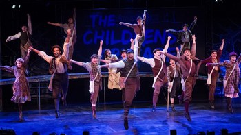 Newsies started life as a 1992 Disney musical movie. It was a box-office dud but acquired a cult following through home video, no doubt abetted by the strong dance numbers, catchy tunes by Alan Menken and Jack Feldman, and a winning performance by a young Christian Bale as Jack Kelly. With a book by Harvey Fierstein that streamlined its plot, Newsies opened on Broadway in 2012 and was a major success, winning Tony awards for its choreography and for the six additional songs Menken and Feldman added to beef up the movie's score. Chanhassen Dinner Theatres has mounted the musical's first local production, lavishing its usual high standards to casting, staging and production values. For those who couldn't make it during the one week the national tour spent at the downtown Orpheum two years ago, and for those who did make it and want another jolt of this phenomenal entertainment, the six-month run at Chanhassen should be welcome news. Newsies is based on an actual 1899 event, a thirteen-day strike by newsboys against the Joseph Pulitzer owned New York World and the William Randolph Hearst owned New York Evening Journal. Jack Kelly, the show's charismatic and handsome hero, is a fictional character who survives by his wiles and bravado, but dreams of getting away from the grime and crime of the city. He fantasizes an idyllic life in Santa Fe, even though he has never been there. Pulitzer decides to boost The World's profits by raising the price the company charges the newsies for each bundle of papers they sell, meaning they will have to sell more just to make the same paltry amount. Jack and the others, who already work as hard as they can with little to show for it, are outraged and a strike is called. Mixed into the plot is Jack's secret artistic talent, the flamboyant operator of a popular floor show featuring leggy showgirls wearing very little (but enough to keep the musical family friendly), a corrupt agent for a gruesome orphanage set on catching Jack, and a feisty young woman resolved to break away from her duties as a society page reporter to cover hard news. The book is well crafted, with tangents that intersect and come together nicely by the final curtain, and enough laugh lines to balance out the newsboys' heartstring-tugging plight. If anything, the script could be accused of soft-peddling the hardships those children faced. Chanhassen wisely uses projections of archival photos of actual newsiesmuch younger than the twenty-something actors on stagewhich helps to place the horrible conditions of their lives in front of mind. We can enjoy the bright music and lively dancing, while remembering that it is all in service to a serious cause. Mencken's music makes no effort to reflect turn of the century New York. With the exception of a throw-away number for Medda, the music hall hostess. it is full-tilt Broadway musical theater, with a balanced mix of upbeat songs that invite waves of dancing feet ("Carrying the Banner," "Seize the Day," and "King of New York"), full-chorused anthems ("The World Will Know," "and "Once and for All"), a couple of plot-driven numbers ("The Bottom Line," "I Never Planned on You," and "Watch What Happens"), and a sweet romantic ballad that serves as a reminder that Menken's greatest success has been writing award-winning songs for animated Disney movies. Jack's soaring expression of yearning, "Santa Fe," tops them all, delivered by Knezevich with an open heart and beautiful voice. Knezevich has had major roles in other Chanhassen productionsDanny Zuko in Grease, Lancelot in Camelot, and Gaston in Beauty and the Beast. However, in Newsies, he has establishes himself as a major presence on the Twin Cities musical theater scene. His performance persuades us that he is seventeen-year-old Jack Kelly, caught between the struggle to improve life for himself and his friends on the street, and his desire to run away and have a clean, fresh start in life. He acts with conviction, sings beautifully, and moves with grace. His key partners in the strike are Alan Bach as Davey, Lucas Wells as Crutchie andon opening nightTanner Zahn Hagen as Les, and all give terrific performances. Bach's Davey is the voice of reasoned change, Wells' fully conveys Crutchie's tender heart and his resolve to overcome the handicap of a lame leg, and Hagen is poised and hilarious, as needed, as nine-year-old Les, who could step in and take charge any time. (Hagen alternates in the role with Jon-Erik Chamberlain.) As Katherine, the reporter whose instincts bring her into the fold of the newsies' crusade, Ruthanne Heyward acts well, creating believable romantic sparks with Knezevich's Jack. Unfortunately, her singing seems hampered at times, as if searching for the music, but the nervous energy in her delivery of "Watch What Happens" is spot-on. Thomas Schumacher is easy to despisewhich is the intentas Joseph Pulitzer and Kersten Rodau plays Medda with a bountiful heart and about a shot-glass full of naughtiness. Andre Shoals is impressive in a throw-away role as Wiesel, who distributes the papers to the newsies with menace in his eyes and disdain for their ragged lives, a fate he probably barely escaped, and Keith Rice gives a delicious cameo as Governor Theodor Roosevelt. The only off-base characterization is Daniel S. Hines as a Jewish deli proprietor, played as an extreme caricature. The newsies each have their own name and distinctive personality, which greatly enriches the interactions among them, and they are all champion dancers. As newsies, flunkies, showgirls and nuns (at a soup kitchen), the ensemble members all do splendid work. Director Michael Brindisi manages the essential balance in Newsies between incredibly spirited entertainment and a story that relays an important chapter in history that still carries relevance today, in our treatment of those on the lowest rungs of the employment ladder. He has assembled his usual cohort of creative team members to craft a production tha