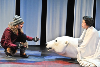 A year later, Pillsbury House is presenting The Great Divide II, another collection of five short plays to once again take our national temperature as we journey through what feels like a new era in the way politics and public discourse are taking place. Given more lead time to prepare, the second edition of The Great Divide feels more polished than the first, both in the writing and execution of the work. The result is artistically satisfying, stimulating, andgiven the task at handunsettling. Happily, the four actors from last year's The Great Divide have all returned: Tracey Maloney, Audrey Park, Mikell Sapp and Ricardo Vázquez. Each is a talented and versatile artist in his or her own right. Together, they have become a close-knit ensemble who play easily off one another, and are able to draw unspoken meaning from their scripted text. The first of the plays, The Journalist's Creed: Actual Emails from a (Brief) Career in News is Jessica Huang's account of her experience as a journalist, from graduating with a degree in journalism in 2002 through several career changes and a prestigious fellowship, ending in 2010 when she abandoned the field to focus on writing plays. Most of the dialogue is in the form of emails spoken by Huang (as portrayed by Audrey Park) or her correspondents, played in rotation by the rest of the cast. Many of them end with "dot, dot, dot", as if they are eager to move on before finishing their thoughts. Actual headlines from the era are interspersed throughout, meshing personal and world events together. These communiques reveal Jessica's idealism as a fledgling journalist, sullied by disappointments with unethical behavior (a reporter brags about making up quotes for the mayor), unreliable sources that cannot be named (every person and organization throughout the piece is referred to as "redacted"), colleagues interested only in career advancement, and limitations on what she is permitted to say in print. Her account puts into question the reliability and evenhandedness of the news we receive, though it is clearly only her singular experience set, not a condemnation of journalism writ large. The second and most amusing of the plays is Stacey Rose's Sven, Ole & the Armageddon Myth. Three office workers gather in the apartment of a fourth co-worker, Wendell (Mikell Sapp), to get stoned and drunk as they await what they believe to be a nuclear attack. Audrey Park plays a lesbian who gives straight sex one last try via a quickie with her host, confirming that she had not been missing out on anything all those years. Ricardo Vázquez is distressed that cell phone service has been lost and he cannot contact his wife, even though that morning he had been ranting about what a bitch she is in the company break room. Tracey Maloney appears as the most innocent of the group, coping with the crisis by reciting lame Sven and Ole jokes, as repeated air-raid alarms ratchet up the tension every couple of minutes. Though these people are boorish, the banter Rose has written for them is pretty funny. Then Wendell turns on the other three, condemning them for their human failings and administering his own deranged form of justice against them. His assumption of moral superiority is revealed as the greatest threat of all, as we see that nothing is as it seems. Play three, Wild Creatures, by Tim J. Lord, is the most abstract of the five. Opening with Sapp and Park warming themselves over a campfire, Mikell tells a dark story, with a hand puppet to assist him. The scene shifts to Vázquez, protagonist of Mikell's story, addressing a crowd, pumping up his importance in their eyes. He is suddenly back in the heights of a wilderness where his heroic deed occurred, overlooking the city, when a woman (Mahoney), a strange mix of witch, nymph and goddess, appears behind him to assert her dominance over this domain. She seems wise but unyielding, a source of eternal truths not always easy to abide. His challenge to her reign prevails, for he knows what the people want: Jobs! But as he descends, she remains in her loft above the people, knowing that his sway over them will not last. Now we look back at Sapp and Park who leave their storytelling circle and traipse off to find the mystery woman for themselves. For what it's worth, this is set in southern Illinois, a region beset by shuttered coal mines and factories, the kind of region primed to respond to promises to bring jobs back to America. Also, the unseemly "conquering hero" of the piece could be seen as a stand-in for Donald Trump. It has elements of allegory, and elements of satire, but Lord throws in too many stray pieces, and the result is not particularly lucid nor compelling. In the fourth play, Mt. Rushmore by Christina M. Ham, two couples vacationing together are at the Mount Rushmore National Monument. One of them (Vázquez) is singularly unhappy to be there, railing against the commercialism, the high prices at the gift shop, the follies committed by the four men honored by the monument (from a revisionist, politically correct perspective, of course), and his wish that they had gone to the Crazy Horse monument instead. He comes across as the a-hole in the group. At the end, after a major storm breaks out, the reverence for our nation's forefathers proves to be the undoing of this crowd. Our ranting man may have been on to something. In contrast to Lord's play, Ham's is totally direct, and brashly delivers on its theme. The final and most moving play is Breathe by Andrew Rosendorf. Maloney is walking through the Minnesota north woods, coming from her recently deceased father's hunting cabin. She is heavy with feelingssentiment, misgivingswhen she encounters a polar bear sprawled on the ground and unable to move. The bear's head is beautifully crafted by Masanari Kawahara, truly a master of the art, and operated by Park, who also speaks for the bear. Park's body, along with Vázquez and Sapp's, are covered by a large white sheet,