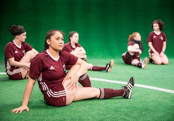 The play takes place on Sarah Bahr's sea of green AstroTurf set, with each of the girls in their Wolves uniform, but with enough oh-so subtle variations (also Bahr's work) to say something about their individuality. The undefeated Wolves are determined to take their conference title and make it to nationals in Florida. Some are counting on sports scholarships to fund their college plans. The first two conversations we hear, simultaneously, are about menstruation (pads versus tampons, the fear of blood running down their leg while on the field) and whether or not a recently tracked down perpetrator of the Khmer Rouge genocide, now in his 90s, should be granted forgivenessthis, an extension of a discussion in their social studies class in school. Conversations in this and other scenes leapfrog around, from whether or not there is internet in Cambodia to griping about their (unseen) hungover coach, to Harry Potter and "Lord of the Rings" fandom. One girl knits scarves for an Amnesty International project, to help Central American "kids in cages." Another talks about diedinhouse.com, a website that can tell you if anyone has ever died in your home (I checked, it's a real thing, but paid service). The team captain struggles to maintain authority, addressing her collective teammates as "ladies," while she clearly has some deep insecurities of her own. A new girl on the team stands out not only by her newness, but a pronounced social awkwardness (e.g., clueless as to when to speak and when to refrain, blurting out personal information about herself or others), and also by a set of life experiences very different from the other girls who have grown up in the same middle American community. When she hears girls behind her back say that she lives in a yogurt, she corrects them, telling them it's a yurt, and tries valiantly not to be crushed by their smirks. None of the girls are named during the scenes, being referred to by their player number, but we come to know their temperaments, get a sense of their differing histories with one anothersome go way back to elementary school, some more recent, some close friends, others sniping back and forth. Director Sarah Rasmussen takes DeLappe's rapid fire dialogueoften peppered with the profanity of kids trying adulthood on for sizeand manages to facilitate our awareness of who is talking to whom, even as individuals sometimes shift from one conversation to another. There are also the silences, when these young adults don't know what to say, when they are shocked or saddened or uncertain about the next step they need to take. Along with the fierce dialogue and precise direction, the cast ensures that each of these girls stands out as a unique individual, making this one of the strongest ensemble pieces in memory. Most of the nine young actors have not been seen very much on Twin Cities' stages, but all are welcome back, often. As the new girl, #46, Megan Burns creates a fascinating and painful picture of a young person trying to maintain her identity while also trying to fit in. Meredith Casey painfully portrays #2, the girl who is eager for womanhoodto a faultand Isabella Star LaBlanc (#00) is stunning in a solo scene, working out almost to the point of madness. Shelby Rose Richardson, as the captain, #25, is near heartbreaking as she tries to piece the private parts of her life into her public sphere. Added to these nine wonderful actors is veteran Jennifer Blagen as a Soccer Mom, mother of one of the players who, in her lone scene, reminds the audienceand those girls as wellof the adults caught between encouraging the girls' bravado and ambition, and cherishing their childhood. Not only do these performances communicate, both in words and non-verbally, with laser-sharp range, they are physically masterful in handling the required skills. The cast began play rehearsals in February to prepare for The Wolves' March 30 opening, but began working with a pair of soccer consultants last fall, developing knowledge of the game and the ball handling skills to appear natural on stage. In one sequence they do a drill called "spider web," intricately passing the ball by foot as they change places with another player in their circle. This scene might appear improvised, but is fully choreographed, and not one of the actors misses a beat. The Wolves has a semblance of plot, as certain relationships and future prospects for some of the girls develop during these few weeks of their indoor season. What is really at stake, though, is the balance of exhilaration and terror that are the dual companions to girls on the cusp of wommanhood, where being strong, smart, funny, attractive and popular are like Himalayan peaks to be conquered. We know, from what they say, that there is more to their lives than these soccer games, but DeLappe has been able to draw all of those facets of each girl into the face, posture and words they bring to the field. It is a marvelous feat of writing, performed with breathtaking authenticity. The Wolves deserves mighty howls of praise. The Wolves, through April 29, 2018, at the Jungle Theater, 2951 Lyndale Avenue S., Minneapolis MN. Tickets are $30.00 - $45.00. Seniors (60+) and students, through undergraduates, $5.00 discount. $25.00 public rush and $20.00 student rush (1 ticket with ID), for unsold seats two hours before performance at box office. For tickets call 612- 822-7073 or go to www.jungletheater.com. Playwright: Sarah DeLappe; Director: Sarah Rasmussen; Set and Costume Design: Sarah Bahr; Lighting Design: Karin Olson; Sound Design: Katharine Horowitz; Wig Design: Robert Grier; Properties: John Novak; Dramaturg: Michaela Johnson; Soccer Consultant: Jennifer Larrick; Assistant Soccer Consultant: Kyle Johnson; Stage Manager: Amanda K. Bowman; Technical Director: Leazah Behren; Production Manager: Matthew Early; Assistant Director: Cara Phipps. Cast: Chloe Armao (#14), Jennifer Blagen (Soccer Mom), Megan Burns (#46), Meredith Casey (#2), Mic