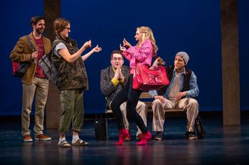 That heroine, the titular blonde, is Elle Woods: Malibu fashionista, Delta Nu sorority president and fashion marketing major with a 4.0 GPAclearly smart, but with a focus that was never much broader than her walk-in closet. It is senior year at UCLA and Elle has her life happily mapped out, with her impending engagement to boyfriend Warner Huntington III, well-tailored and headed to Harvard Law School. That is, until Warner dumps her. His aggressive ambition to make it to the Senate by the time he is 30 requires a more serious spouse at his sideas he puts it, "less of a Marilyn, more of a Jackie." Elle is despondent until she conjures up the perfect solution: get into Harvard Law so Warner can see that she is indeed serious, putting their future together back on track. Easy peasy, right? Elle's regimen of test prep and her admission "essay" are, let's say, nontraditional, but she makes the cut. Warner is shocked to see her at Harvard on the first day of class as she feigns nonchalance, exclaiming "Oh my god, Warner. I totally forgot that you go here." Warner sorely underestimated Elle, but the crux of the story is how much she undervalued herself. Faced with snooty, self-important classmates and the wrath of powerful Professor Callahan, she remains true to herself and her valueswhich turn out to have more depth than appeared at first blushand learns that what she really wants is to be the best possible Elle Woods. Along the way she gets help from gawky law school teaching assistant Emmett, kindred spirit hair stylist Paulette, and a trio of sorority sisters who appear in her mind as a Greek chorus. The novel Legally Blonde and its movie version both appeared in 2001. Even then, the theme of a young woman in a society that judges her by male chauvinist criteria, who discovers her true worth and proves the old adage "you can't judge a book by its cover," was familiar ground. And yet, seventeen years later, continued discrimination in hiring and employment, and harassment of women in the workplace keep the show sadly relevant. One scene in particular aptly illustrates the #metoo movement. Granted, Legally Blonde may have its sights set more on entertainment than social activism, and its perspective runs both ways, with Elle tutoring Paulette on the "bend and snap" move to draw the attention of a hunky UPS delivery man. Still, the show makes an overall positive statement that a woman can be strong, independent and successful, without having to trade in her signature pink for navy blue. Artistry continues its run of high quality musical theater that makes the best case for each show. Its last production, Follies, perfectly captured the dark, dreamlike state of times remembered doing battle against the present. With a full 180-degree turn, Legally Blonde's director Angela Timberman has mounted a highly animated production, paced as briskly as a Delta Nu field trip to the outlet mall, that hangs the show's message from the light and airy trellis of its narrative. Choreographer Heidi Spesard-Noble gives the enthusiastic ensemble delightful dance routines that capture the irrepressible energy bursting out of Elle and her friends, as well as having fun in scenes that call for a marching band, an exercise studio, and Irish step-dancing. Artistry's resident music director, Anita Ruth, once again contributes immeasurably by providing great-sounding accompaniment with a synthesizer-heavy thirteen-piece orchestra. The role of Elle Woods is played by Angela Steele (Janet Van De Graaff in The Drowsy Chaperone and Amber Von Tussle in Hairspray, both at Artistry), who commands attention with a full-throated, triple threat performance. Steele sings with heart and can raise her voice to a belt when called for, moves with grace, and portrays the roller coaster of emotions Elle Woods rides over the course of the show. She soars above a euphoric chorus of sorority sisters in the giddy opening "Omigod You Guys," makes a power statement in the first act closer "So Much Better," and delivers a touching introspective moment with the title song. I anticipate seeing more of Ms. Steele in leading roles on our stages. Benjamin Rubenstein, who plays Emmett, comes to Legally Blonde with less experience, but performs handsomely, giving his character the spine needed to stand up against the darker elements of Harvard Law School. Rubenstein and Steele have a warm chemistry together that grows organically through the course of the show, featured in "Chip on My Shoulder" and "Take It Like a Man." The villain of the piece, Professor Callahan, is played by Paul R. Coate, an Artistry stalwart, who delivers his philosophy about the legal profession and profit with evil panache in "Blood in the Water." Mary Palazzolo is well suited to play the good-hearted, salt of the earth hair stylist Paulette Bonafonté, delightfully breaking into a reverie imagining the perfect life to be had in "Ireland." Alec Leonard is a suitably clueless heel as Warner, laying it on thick in "Serious," and Maggie Mae Sulentic is convincing as Vivienne Kensington, Elle's law school nemesis. Dorian Brooke, as exercise queen Brooke Wyndham, has just the right jaded and sassy air, and takes charge demonstrating how her devotees get "Whipped into Shape" while she is being brought up on murder charges. Joel Sass' set uses a central playing space surrounded by columns out of an Ivy League campus, and uses descending frames and flats gracefully sliding on and off to seamlessly transition from a sorority house, to a fashion boutique, to a posh restaurant, to the Harvard Law campus, to Elle's apartment, to a gym, and to a courtroom. Ed Gleeman's witty costumes affectionately exaggerate the fashion savvy of the Delta Nus, and especially Elle, without ridicule. The sound design provides a balanced delivery that keeps voices clear and allows them to rise above the orchestra. Legally Blonde is not an important musical, not a game changer or exemplar of the state of the