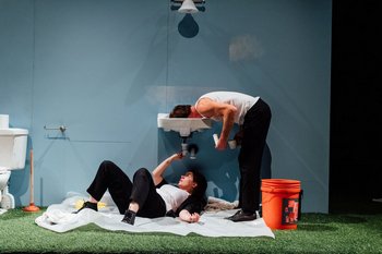 These unnamed characters, played by Moving Company actors Heidi Bakke, Joy Dolo and Steven Epp, work as laborers at an upscale hotel. At various times they make beds, vacuum, deliver room service, repair plumbing, and do other tasks. We also see them during breaks: those scheduled by management and those they seize for themselves, like using the hotel swimming pool when there are no guests around. They make idle chatter which invariably leads to expressions of despair over the monotony of their workaday lives, the futility of any effort to change the recurring pattern of their existence, and their feelings of oppression at the hands of those who wield power. Yet, for all their wailing, they seem to find a safety net in the immutability of their designated roles, as if familiar forms of misery are safer and more secure than stepping out into the unknown in search of happiness. They are prone to long monologues, rants really, on a point that troubles them, spouting out to one or both of their comrades who dutifully absorb the deluge of words with little in the way of response They are not a cheery threesome, though they findand provide us withsome moments of amusement that help them endure their existential pain. Some of these are quite clever indeed, such as a bit with Epp kibitzing while Bakke repairs a clogged toilet, or Dolo's balletic persistence in vacuuming a hallway in spite of various intrusions, or the three tossing soiled linens in rapid fire. Moving Company productions always make sublime use of physical imagery, finding comedy, poignancy or both in movements and gestures, and those talents are certainly put to splendid use by this cast, under the guiding hand of director Dominique Serrand. In addition to the meteorological seasons, The 4 Seasons draws its title from two compositions that provide a soundtrack to the transit from spring to summer to fall to winter and back to spring. Baroque composer Antonio Vivaldi's well known quartet of concerti, "The Four Seasons," is heard extensively throughout most of the play. Its stateliness serves to anchor the ricocheting emotions of the three workers onto a landscape of civility. At times it is used with great wit, as when Epp finally unclogs the toilet Bakke has been struggling withinstead of the sound of flushing, we hear a piece of Vivaldi. Near the end of the play, Astor Piazzolla's set of tango compositions known collectively as "The Four Seasons of Buenos Aires," provides an atmosphere of intrigue and melancholy as the trio complete a full ride around the cycle of the year, facing yet another spin. However, the familiarity they both dread and rely upon is blocked by a shocking turn of events, which forces the threesome to reconsider their positions on the wheel of life as for the first time in memory they are faced with making decisions about what comes next. All three actors excel at The Moving Company's brand of quirky narrative that takes scenes of mundane life and draws abstractions from them that make something universal out of small, specific moments. They also are adept at the physical comedy and the wordplay that inflates The 4 Seasons with buoyancy to counteract the dreariness it depicts. Each of the cast members presents a persona throughout. Steven Epp is whiny, ruminating about the past and loathe to consider anything better for the future. In one intense monologue, Epp talks about what a great kid he was, then bit by bit lets us know how that "great kid" became the miserable man we see before us. Joy Dolo is the activist of the group, railing against injustice, such as a fairly straightforward diatribe that invoked testimony lodged against Supreme Court Justice Brett Kavanaugh at his recent confirmation hearings. Heidi Bakke tries valiantly to be optimistic, and find way to declare her cup as half full, but time and again, dissolves into despair. Her pals are no help to her: at one point she wonders, in all sincerity, "What if I'm already happy?" to which Dolo and Epp respond in unison, without skipping a beat "You're not." Serrand creates wonderful stage imagery using the spare but ingenious set (which he designed with Safa Sarvestani), props, and his actors. A hotel swimming pool and its surrounding deck arrive almost by magic, with the actors convincingly swimming and splashing with utter delight. Sonya Berlovitz' costumes provide just enough alteration from scene to scene to acknowledge the passing seasons. Marcus Dilliard's lighting design and Justin Burk's sound design, including the use of the Vivaldi and Piazolla musical "Four Seasons", contribute to a vibrant theatrical work that is crisp and clean, seesawing between wit that is sometimes loopy, and introspection that scrapes against the pain of lives without meaning. These two elements continuously spar with one another. The despair is made to seem comical, while the humor is a desperate effort to heal the wounded spirits. The 4 Seasons provides a constantly engaging procession of images and witticisms, but the piece lacks a sense of purpose. We are soon very familiar with the desperation felt by these three characters, and we just as soon recognize their foolishness. They are not given any context that would allow us to think that any one of them might actually be capable of change. Their misery becomes tiresome when there is no impulse to rise above it. In actual human society, change is possible and people can break away from treadmills of unhappy thinking and co-dependent relationships. That is, for me, the disappointing aspect of this work: for all the intelligence, creativity and artistry that went into its formation, the outcome is nil. I did not find myself moved by these characters, certainly not delighted by them, nor did I learn anything from them. I did, however, greatly enjoy watching them display the wit and theatrical gifts shared by the director, actors, and creative team that devised The 4 Seasons. The Moving Company's The 4 Seasons, thro