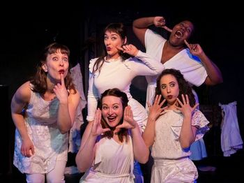 The long gestation and many hands and voices that created Velvet Swing have yielded an exciting new work that is provocative, entertaining, timely, and ingenious both stylistically and in drawing connections between a sordid century-old scandal and today's obsession with celebrity news and tabloid headlines. Velvet Swing is the true story of Evelyn Nesbit. You may know here as a minor character in the book, film, and stage musical Ragtime. Born in the 1880s to a poor family, as a child she becomes a highly sought after commercial artist's model. By the turn of the century her face was emblazoned on merchandise of every kind, epitomizing the ideal of youthful feminine beauty. Still poor, however, Evelyn used her famous face to find work as a Broadway showgirl, where she attracted the attention of two men: Stanford White, famed architect and socialite, and Harry K. Thaw, mentally unstable son of a Pittsburgh family made newly rich from coal and railroads. The suave White groomed Evelyn to trust him, then seduced her in a fabulous penthouse atop one of his buildings where a red velvet swing hung two stories down from the ceiling. Evelyn was 15 or 16 and White was 47. Thaw aggressively pursued Evelyn as well, his offers more honorable, but his coarse and belligerent manner put her off. Still, she would never wind up with White, who was not only married but had numerous other teenage mistresses secreted around the city, so Evelyn finally gave in and marries Thaw. By then, however, Thaw had learned about White's despoilment of his beloved and vowed to ensure White would never get near Evelyn againan obsession that led to Thaw murdering White and facing murder charges in what became known as "the trial of the century." The public followed it with the same rapt attention as the O.J. Simpson trial, melodramatic headlines pouring out of the courtroom. More than for her beauty or questionable talent on stage, Evelyn became best-known for being in the middle of this sordid affair, the girl on the red velvet swing, setting the mold for that great American phenomena, a celebrity who is famous for being famous. Evelyn's relationships with both men, her notoriety, Thaw's trial and its outcomethe first ever case of innocence by virtue of "temporary insanity"along with her ongoing attempts to reinvent her life in the public eye until her death in 1967, are all well documented, so a mere dramatization of the story would be a simple affair. What Umbrella Collective adds to Velvet Swing to makes it so fascinating, and also highly theatrical, is to cast not one, but five Evelyn Nesbits. All dressed in lacy white, designed by Josie Everett, like turn of the century chorines caught in their backstage dressing room, at times the five Evelyns performed in unison, emphasizing a strong uncontestable aspect of the story. At other times they competed for attention as conflicting feelings, or memories as to what actually happened, keeping in mind she was at times drugged, at other times beaten, so she really was often unsure. The different voices sometimes argued over whose memories were correct, whose feelings more compelling, while at other times they almost amused one another, as if Evelyn enjoyed her disparate voices making her a more interesting whole than any of these focused parts. Each of the five actresses brought her own flair to Evelyn, and they played off each other with humor, each having sympathy for the others' afflictions. They also each played the other characters who inhabit Evelyn's tale, mostly portrayed as caricatures that felt appropriate given the ballyhoo world in which Evelyn lived. Among them, Mickaylee Shaughnessy offered a frightening take on Harry K. Thaw, Jessie Scarborough-Ghent masked Stanford White's malevolence in a haze of gentility, and Natavia Lewis drew out the pathos in Evelyn's widowed mother. Michelle Hernick was the sixth performer on stage, accompanying the action almost continuously on an upright piano, most of it in a ragtime vein, and throwing in a full-blown musical number, "No Man's Momma," that provided a sample of Evelyn's meager skills as a stage performer, but was a hoot as framed by the show's directors Megan Clark and Alana Horton. Clark and Horton made astute judgments as to how much silliness to allow before pulling back the reins and reminding us how brutal a life Evelyn lived. Throughout the show there were pauses when a character referred to contemporary terminology for the abuse rendered by both Thaw and White, the psychological understanding of victim-abuser relationships, and the legal constraints in effect, only to be reminded by another that it was 1906, and none of these understandings or laws existed. Heck, women did not yet have the vote, nor were they allowed to serve on juries. And Harry K. Thaw's trial for murder was the first to admit women journalists in the courtroom, known as "sob sisters" for their overly melodramatic reporting style. The relevance of Evelyn Nesbit's life was easily made evident, given the continued revelations of the abuse of women by men who yield great power, and the abuse of children by menand womenwho occupied positions of trust in their communities. We have laws against these behaviors, if it can be proven they occurred, but only recently have begun to forge the social mettle to bring perpetrators to justice, and establishing new norms where such behavior is not tolerated. At the same time, our society's fascination with celebrity life, with a fixation on the tawdry underside of the rich and famous, can be traced back to Evelyn Nesbit and the trial of the century. Velvet Swing played only a handful of performances, gone too soon, but Umbrella Collective has in the past revived some of their productions. Hopefully, Velvet Swing will return so a larger audience can take in the insights and provocations imbedded in the play, and to absorb the rich artistry borne out of the company's collaborative process. Velvet Swing played