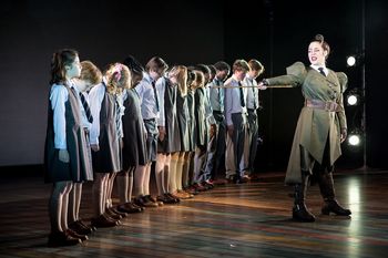 The question, though, for those of us who did see that tour, with dazzling and expensive staging associated with a Broadway pedigree still fairly fresh in their memories, is can the industrious folks at CTC hope to measure up? The answer is a euphoric yes! Director Peter C. Brosius and his team have whipped up a production of Matilda every bit as entertaining as the visitor from Broadway, its staging every bit as slick, with performances every bit as terrific. Moreover, there is a lightness to CTC's production that makes it feel more accessible than the Broadway edition, especially for younger audience members who fill many of the seats at the UnitedHealth Group Stage. For all its bright entertainment value, there is a darkness to Matilda that is inherent in Dahl's book. Matilda Wormwood is a very young girl whose parents did not want her, who neglected her, treated her with disdain, and are especially mortified by her propensity for reading. These poor excuses for parentsMr. Wormwood is a used car salesman forever scheming to swindle Russians into buying his fleet of clunkers, while Mrs. Wormwood spends her days practicing for international ballroom dancing competitions with her slithery dance partner Rudolphohappily send Matilda to a school run by the ferocious Agatha Trunchbull, a former Olympic hammer-throwing champion who calls her students "maggots." Mr. and Mrs. Wormwood count on her to cure Matilda of her horrid interest in books. Pity for them that Matilda's teacher, Miss Honey, views the girl's intelligence and love for learning as gifts to be nurtured. Miss Trunchbull, however, will not have her standards of total discipline and absence of all joy be compromised by making an exception for that little Wormwood girl, whom she calls a "gangster." Interspersed with Matilda's story is a story she makes up, telling it in installments to her friend Mrs. Phelps, the local librarian. Her devised tale has meteoric highs and lows, great joy and tragic loss, rapturous love and demonic revengenot what you would expect of a first grader. As Mrs. Phelps listens with rapt attention, the story is stunningly illustrated by projections that bring Matilda's words to life. Dahl's narrative, crisply and wittily captured in Dennis Kelly's Tony Award winning book, ingeniously intertwines the events of Matilda's life and the story she creates, giving her a pathway out from the shadow of her horrible family. As I said, while this is a great story, it also has a very dark streak. On the CTC website, it is described as being "for fearless 6 to 96-year olds," with the word fearless being a bit of a jokebut not really. In some way, CTC has diffused this darknessnot so much as to rob the story of its bite, but enough to make it a bit easier to take for those 6-year-olds (and even some older kids ) who are not quite so brave. This is not, by the way, an abridged, or "junior" version of Matilda, but the full show, running two and a half hours, with intermission. That means missing none of the highlights, including the brilliant use of swings hanging all the way from the rafters on which the ensemble of school kids (both the eight played by children and the six "big kids" played by adult actors) in the joyous "When I Grow Up." Brosius' directing keeps it moving swiftly and smoothly, with seamless transitions that never allow interest to flag. Tim Minchin's score is engaging throughout, including star turns for Matilda to be brazen in "Naughty" and poignant in "Quiet," Miss Honey's lovely ode to the comforts of her simple life, "My House," a musicalized scene involving much too much chocolate cake ("Bruce"), and a blistering anthem sung by the students, small and big, "Revolting Children." Choreographer Linda Talcott Lee provides constant motion for the ensemble, animating each of the dance scenes with high-test energy. Along with heaps of talent, the part of Matilda calls for enormous stamina and so is triple-cast with three young actors rotating in the role. On opening night, Sofia Salmela played Matilda, knocking the roof off the house with phenomenal singing and acting, winning our hearts even as she gave in to the temptation to be naughty, her mischief always played upon adults who hurt her much more deeply than she could possible hurt them. In Matilda's original staging by the Royal Shakespeare Company in England, in its transfer production on Broadway, and in the tour that visited Minneapolis, the role of Miss Trunchbull was played by a male actor, to great effect. Children's Theatre Company has not followed that path, casting Emily Gunyou Halaas as Trunchbull, and it turns out to be a great choice. Halaas plays the child-hating, self-aggrandizing headmistress to perfection, raising a storm in two big numbers, "The Hammer" and "The Smell of Rebellion," and convincingly terrorizing the students as well as their teacher. China Brickey is lovely as the tenderhearted Miss Honey, with a voice well suited for her sweet numbers. She conveys the meek teacher's growing confidence as she is determined to help Matilda realize her gifts. Dean Holt as Mr. Wormwood, and Autumn Ness as Mrs. Wormwood are superb, each competing to be the greater slimeball and less competent parent, with Ness pulling out all stops in demonstrating to Miss Honey, by way of her ballroom-dancing routine, her credo "looks are more important the books" ("Loud"). Tony Vierling puts his notable skills as a dancer to great use as Rudolpho, and Reed Sigmund, who plays several small parts, is a hoot as a Russian mafia chief. Alejandro Vega, who had a lead role in CTC's Last Stop on Market Street, stands out among the extraordinary ensemble of young actors as the cake-eating Bruce. The creative team match the cast in the excellence of their work. Above the stage is an archway of books, their different colored spines creating a rainbow of color that embraces all of the action. Scott Davis' sets are simple, but evocative of the primal feelings at play