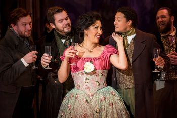 Minnesota Opera has done no such tampering in their current mounting, giving full force to the lush, romantic score, with mesmerizing performances by its lead singers. The Minnesota Opera Orchestra, conducted by Christopher Franklin on opening night (chorus master Andrew Whitfield conducts at several performances), play the rhapsodic score with clear tones that emphasize the strong interplay between melody and text. If there are fewer themes in La Traviata that are recognized independent of the score, the integration between the music and narrative thrust in this opera is all the stronger for it. Verdi and his librettist Francesco Maria Piave based La Traviata on the French play La dame aux camélias, adapted by Alexandre Dumas from his own novel. The same novel is the source of several film versions called Camille, the best-known directed by George Cukor, starring Greta Garbo and Robert Taylor. The play premiered in 1852 in Paris where Verdi saw it, and he must have been greatly inspired by the subject to have his opera open just a year later in Venicethat, and the pressure to deliver on a contract to produce a new opera for the Venetian opera after his success with Rigoletto. The initial 1853 production of La Traviata suffered from poor casting choices and drew mixed notices, but a remount in 1854 drew praises which have met the opera ever since. La Traviata translates as "the fallen woman," or in today's parlance, "the prostitute." Violetta Valéry lives as a "courtesan," supported by wealthy men in exchange for her favors, with Baron Douphol being her current benefactor. Having been afflicted with consumption, she throws a party to celebrate a bout of improved health. Here she meets Alfred Germont, an ardent admirer, who had watched over her from afar during her illness. He declares his love in the beautiful "Un di, felice, eterea" (One day, happy and ethereal), but Violetta has long since given up the notion of true love, settling on enjoying the freedom to pursue what pleasures life can offer. Yet Alfred's love touches her in ways she has never known, certainly with more tenderness and passion than her Baron. After Alfred leaves, her conflicted feelings are passionately expressed in intertwined arias, "Ah, fors' è lui" ("Ah, perhaps he is the one") and "Sempre libera" ("Always free"), while Alfred is heard singing from offstage, underscoring the purity and wholeness of his love for her. The scene is both musically and dramatically enthralling. Three months later, Violetta has chosen love and is living outside Paris with Alfredo. Her bliss is disrupted when Alfred's father Giorgio arrives and beseeches Violetta to break off her relationship with Alfredo for the sake of his sister, whose engagement is jeopardized by knowledge that her brother lives openly with a "fallen woman." Violetta, at first aghast, is won over by Giorgio. For the sake of Alfredo and his sister, she leaves him. Alfredo is heartbroken, believing she has left him to return to the Baron. Violetta's health declines further and only when she is on the verge of death does Alfredo learn the truth, rushing to her side, followed by Giorgio, who begs forgiveness for his part in separating the two lovers. The opera ends in one of the most impassioned death scenes to ever grace a stage. La Traviata has only three roles that must carry the lion's share of the narrativeVioletta, Alfredo, and Giorgioand Minnesota Opera has double-cast all three roles. On opening night, Nicole Cabell played Violetta, realizing the role beautifully in her lush soprano, her exquisite acting, and the grace of her movement, seesawing between the strength of her passions and the fragility of her ailing body. Jesús León has a glorious tenor, brilliant singing the role of Alfredo, expressing his earnest love for Violetta, heedless of her tarnished past, with complete conviction. His anguish and humiliation after her return to Paris is palpable. As Giorgio, Joo Won Kang's strong baritone expresses the gravity of his fatherly role, compelled to do what he believes best for his children even as he sees the pain it inflicts. In smaller roles, Nicholas Davis does justice as the Baron, asserting his dominance over Violetta with a growling bass, while Bergen Baker is highly spirited as Violetta's pleasure-loving friend Flora. The entire cast and chorus sing beautifully, doing honor to the glories of Verdi's score. Stage director Louisa Muller keeps the movement of the narrative flowing, with crowds of reveling partygoers appearing and retreating in what feels like a finger-snap, while placing the principals in positions that underscore their relationship to one another. When, in act one, Violetta and Alfredo are alone having their first moments together, we can spy couples dancing through open doors, reinforcing the atmosphere of pursuing pleasures in which this couple try to stake out something more meaningful. Wonderfully done! As for those dances, the large ensemble dances are choreographed by Heidi Spesard-Noble with wit and energy that conveys the spirit of a crowd dedicated to enjoying themselves. The only disappointment with this production is in the setting. Each of the four sets use the same floor to rafter walls, painted to appear decayed, like the debauchery of people they enclose, but with no differentiation between among the settings, nothing to distinguish the simplicity of Violetta and Alfredo's life in the country from the opulence of the high-rolling city dwellers, nor from the chamber where Violetta will breathe her last. The costumes, however, are gorgeous (both sets and costume designs are the work of Isabella Bywater), with outrageously rendered gypsy and matador costumes worn by the attendees at Flora's lavish party. Marcus Doshi's lighting creates evocative moods on stage, with a breathtaking effect of morning light pouring through an open window in the final scene. If you among the legions who love La Traviata, this beautiful produ