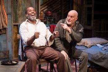 Pillsbury House Theatre has mounted a bravura new production of Blood Knot, affirming the searing power and timeless incisiveness of Fugard's work, amplified by towering performances from James A. Williams and Stephen Yoakam. Two high-test talents collaborated to bring this production to the stage: Stephen DiMenna, director, and Marion McClinton, listed as creative consultant. Both gentlemen have prestigious credentials as directors in New York theater, as well as locally and around the nation. Their combined efforts yield a beautifully wrought stage work that places full confidence in the heat of Fugard's script and their gifted actors, who, for the duration of two acts, disappear as performers and exist only as the characters spawned from Fugard's inspired mind. Fugard has a gift for creating characters who are believable human beings, formed of whole cloth, and also take on the mantle of symbolism, representing a significant theme or aspect of society. Blood Knot is built around two brothers, dark-skinned Zachariah (Williams) and light-skinned Morris (Yoakam). Both are black under South African law, but Morris has the ability to pass for white, which has created a gulf between them. Until a year ago, Morris had been wandering the country while Zach toiled as a gate boy at a rich white man's estate. Since Morris resurfaced in his brother's life, he keeps their space as orderly as possible, produces meals from what little they have to eat, and prepares salted soaks to sooth Zach's aching feet when he returns from work. Among Morris' few visible possessions are a bible, from which he attempts to find words of wisdom suitable for each upheaval that comes along, and an alarm clock that seems to provide the primary structure in his life. Zach anticipates his life going on this way, unchanged, but Morris has a plan: he is saving up, eking out a pittance from Zach's meager earnings, to buy a farm so the two can provide for themselves. He stashes the money in a metal box he calls "the future." Zach, however, sees little hope in the future. His concerns are for the present, specifically his carnal desire for a woman, a need that has gone unmet since Morris reappeared a year ago. Morris consents to help Zach, turning to advertisements in the newspaper posted by women to be pen pals. The pen pal will be for Zach, but only Morris can read or write, so it by necessity is a collaborative effort. What starts out seeming to be good fun spirals out of control, culminating with the two brothers acting out the roles of dark skinned and light skinned men so ingrained in their society, imbedded with condescension, scorn, and violence. The behaviors so deeply imbedded in the two brothers flare up in ways that may shock audience members, and that depict the worst elements of social conditioning, aspect of society, whether in South Africa or in our own nation, that those of good will have struggled mightily to abandon, to turn over new leaves in the story of human relations. Have we moved beyond the bifurcated society Fugard depicted 58 years ago? Is Blood Knot a historical record of how hopeless things once were? Sadly, the news every day testifies to the fact that these demons lie within our social fabric, perhaps dormant, but with the potential to be rekindled by inflammatory rhetoric or abandoned standards of decency. From the moment we lay eyes on set designer's Joseph Stanley's stunning vision of a wretched one-room shack, patched together with sheets of corrugated metal and scrap wood, we are drawn to another world, to a very specific location that, by necessity, is home to two these two men, with Kellie Larson's props adding the bare-bone tools and trappings that allow Morris and Zach to meet their most basic needs. Trevor Bowen's costume designs feel completely organic to the setting, and in the course of the play provide support for the adage that "clothes make the man." Michael Wangen's lighting accentuates the paltry man-made illumination, with day and night following the arc of the sun, while Katherine Horowitz's soundscape places these humble dwellings within context of the forces of nature all around. Morris or Zachariah are neither good men nor bad men, merely men who live in a society that challenges even brothers to live together in peace. They have not chosen the roles that history, biology and culture have conspired to assign them. They can willfully set those roles aside in order to attain a harmonious existence, but the roles will still lurk within. Perhaps better to acknowledge and manage those forces, and perhapsin timefind a way to dismantle them, rather than force them to fester until they explode, leaving a landscape of devastation and heartbreak. In this regard, Blood Knot is not a story of life in South African, but a story of life on Earth. Blood Knot, through June 16, 2019, at the Pillsbury House Theatre, 3501 Chicago Avenue South, Minneapolis MN. Regular price tickets are $25.00, Pick-your-price tickets are $5.00 to $24.00. For tickets call 612-825-0459 or visit pillsburyhouseandtheatre.org. Playwright: Athol Fugard; Director: Stephen DiMenna; Creative Consultant: Marion McClinton; Assistant Director: Carlyle Brown; Set Design: Joseph Stanley; Costume Design: Trevor Bowen; Sound Design: Katherine Horowitz; Light Design: Michael Wangen; Props Design: Kellie Larson; Fight Choreography: Annie Enneking; Production Stage Manager: Elizabeth R. MacNally; House Technician: Katie Deutsch; Producing Directors: Faye M. Price and No?l Raymond Cast: James A. Williams (Zachariah), Stephen Yoakam (Morris) |
