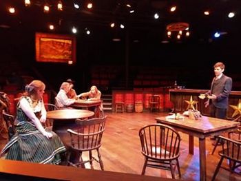 In 2014, British stage writer, director and producer Jethro Compton directed his own adaptation of The Man Who Shot Liberty Valance at the Park Theatre, a small but well-regarded London company. How this iconic story set in the mythic old west became Compton's first professionally produced work as a playwright is anybody's guess, but the Brit did a mighty fine job, bringing multiple conflicts to rip-roaring life. Theatre in the Round Players has lassoed this play for a few weeks, and given it a production that shoots from all barrels, directed with a master storyteller's touch by Brian P. Joyce. Set in the fictitious town of Two Trees, in an unnamed western territory, the play opens in 1910 in a saloon that has been made into a funeral parlor to bid farewell to rancher Burt Barricune. U.S. Senator Ransome Foster arrives, having travelled all the way back from Washington D.C. for Burt's funeral. The senator explains who the deceased was to him, going back twenty years when, as a New York law student, he set out to wander the west with his satchel of law books, searching for something, though he knew not what. We see Burt find Ransome near death after being beaten on the open range, carrying him back to the saloon where the proprietor, Hallie Jackson, agreesagainst her better judgementto allow the stranger to stay until he recovers his health. She fears that the man who had Ransome beat up is likely to come back to finish the job. That man is the nefarious Liberty Valance, who keeps the entire populace of Two Trees quaking, and Hallie wants none of that kind of trouble. Hallie is one of those strong-willed frontier gals from every western movie and TV show, who tends to run a saloon or some other business dealing with rough trade. Jim is an African American man who works for Hallie. Hallie's parents took him in as an orphan and he grew up like another brother to her, though their different skin tones mean they will always occupy different stations in life. Jim is called "Reverend" because of his amazing ability to remember the exact words of anything he hears. Ransome resolves that with such a gift, Jim must learn to read. Liberty Valance finds out that Ransome is teaching a black person to read, which adds to his determination to snuff out the unarmed New Yorker who thinks law can be dispensed from books. Hallie and Ransome find themselves drawn to one another, much to the dismay of Burt, who has long harbored special feelings for Hallie. The romantic triangle, Liberty's demonic quest to mete out his own brand of justice through the barrel of a gun, and Ransome's determination to provide education to the eager students who join Jim at a makeshift school, combine to form a story that holds interest throughout, offering a few surprises along the way, and a conclusion that satisfies both emotionally and in bringing the narrative full circle to its starting point. Compton took some of his plot points from the original story, some from the movie, and added a helping of his own, including a much more significant role for "Reverend" Jim. Both Thompson's story and Ford's film lay out their narrative in the context of the territory's upcoming vote on statehood, with Liberty Valance working against statehood, preferring the lawlessness of the territorial status. None of this is in Compton's play, though there is enough plot material to easily fill the two acts, without anything feeling like filler. (For fans of the movie, Compton reverts back to names Thompson used in her story, all of which were changed in the film with the obvious exception of Liberty Valance.) Between scenes, a recorded narration (voice by director Joyce) sets the stage for the next scene with an old west twang that adds to the flavor of a tale told around a campfire of saloon gunfights between men who are 100% villainous and men who, though flawed, stand for virtue and decency. It also covers some of the lag time in changing settings on Theater in the Round's stage, done with lights dimmed. The play has been very well cast. Scott Pearson is completely believable as naïve Ransome Foster, a city slicker way out of his element in sagebrush country who manages to make his mark. His blend of urban confidence and self-deprecation is completely charming. Laura Hoover is divine as the tough-as-nails Hallie Jackson, who calls the shots among the rough riders who frequent her saloon with acid-sharp wit, while harboring within a sense of a better life, both for her and for her life-long friend, Jim. David Tufford is perfectly cast as Burt Barricune, a confident cowboy who knows his way around the range but completely flounders when trying to connect with the object of his affection. As the evil Liberty Valance, John Goodrich seeps sinister intentions with every line he speaks, in spite of his gentlemanly demeanor. The only question about his performance is whether his accent is intended to sound like a southern rascalsomething like John Wilkes Booth in Assassinsrather than a bandit of the wild west. All other accents, with Foster Johns acting as dialog coach, are spot on. Co-designers Latoya Dennis and Sadie Ward have done an excellent job of conjuring an old west saloon setting, especially given the limitations of the in-the-round staging, and Robert J. Smith, as prop designer, has come up with an amazing array of gizmos that add authenticity in terms of time and place. A. Emily Heaney's costume designs likewise work well to create a holistic sense of being transported to the 1890s American frontier, with notable attention to details, such as the dirt ground into Ransome's coat when he is carried in after being beaten and left for dead on the open range. Jeff Musch provides sounds that further add to the show's appeal, including the well-timed howl of an alley cat. Having seen another play dealing with villainy in the old west just a few weeks ago, Nimbus Theatre's thoroughly enjoyable The Pathetic Life and Remarkable Afterlife of Elmer