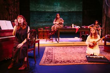 Sea Cabinet has a slender thread of a narrative, with its book by British writer Heidi James, whose novels ("So the Doves," "The Mesmerist's Daughter," "Carbon") lean toward dark and ephemeral subject matter. In Sea Cabinet, a woman's beloved, perhaps fiancé, left to pursue his calling upon the rough seas and never returns. The woman wanders the craggy coast collecting and cataloging various items that wash ashore. These vary from the expectedsea shells, bottle caps and fragments of fishing netsto such treasures as an automobile steering wheel, a bit of amber, and a shattered violin held together by its strings. Through the cataloging of these items, the woman revisits her former happiness and her grief. The songs also give an account of the role the sea has played on the British character, whose civilization was built upon constantly casting off to seek bounty in some form, and which led to lives fraught with uncertainty, making joys and pleasures all the more precious. The score, mainly by singer-songwriter Gwyneth Herbert, with Fiona Bevan co-composing "I Hear the Bells" and "The Kings Shilling," are gorgeous, with melodies conveying emotional arcs that match their lyrics, in tones ranging from mournful to ecstatic. The melodies bring to mind the songs of Sara Bareilles, but with a greater leaning toward folk and away from pop music. The piece is performed by four singer-actors, with voices that can whisper a line or give it a full-throated holler in equally lovely tones. Each of these fourEmily Dussault, Vanessa Gamble, Bex Gaunt and Christine Wadehave a distinct persona on stage, and they switch off taking lead in the songssometimes paired togetherwith none dominating over the others. When they sing together, their harmonies add vivid coloration to the essence of each song. Their four differing hair colorsblack, brown, blonde and redand similar simple shift dresses in ivory, periwinkle, lilac, and plum shades create a sense of sisterhood of diverse moods. Along with their beautiful voices, these four singers play a multitude of instruments that are set about the stageviolin, guitar, piano, all manner of percussion from maracas to old-style washboard, accordion, and good old pucker-your-lips whistling. Just off stage are other talented musicians providing backing bass, drums and piano, with the mellow tones of a clarinet added in just the right places. So much for Theatre Elision's interest in story and music. The visual art component of Sea Cabinet is in the form photography by St. Paul-based artist Jessica Holleque, black and white images of non-distinct women standing where the land meets the sea, some close-up shots, some wide-range vistas, curated to match each scene of the cycle. Alternating with the photos are videos of surf rushing in to shore and retreating again, capturing the constantly changing plane of the sea. The photos and the video footage are projected across the rear wall of the Southern's performance space, creating a continuous shifting environment for the songs and the stories they tell. Director Lindsay Fitzgerald keeps the 75-minute long program moving with fluidity, unrushed but seamless in transitions from on scene to the next. Sea Cabinet establishes hold over the audience from the first notes, the hummed "Sea Theme" that opens the show, and never lets attention flag. That is a measure of success in any performance, even more so in one with such a quiet and tender presence. Theatre Elision has acquired its own performance space in west suburban Crystal, and announced a 2019-2020 season that will include such highly regarded intimate musicals as Ghost Quartet, First Lady Suite and Annie and Will. Based on the sensitive treatment of the material in Sea Cabinet and the artistry with which it is performed, I eagerly look forward to seeing more of their work over the coming months and years. Sea Cabinet, through June 9, 2019, by Theatre Elision at Southern Theater, 1420 Washington Avenue S., Minneapolis MN. For performance schedule and tickets, visit www.southerntheater.org. For information on Theatre Elision go to www.elisionproductions.com. Music: Gwyneth Herbert and Fiona Bevan; Book: Heidi James; Director: Lindsay Fitzgerald; Music Director: Harrison Wade; Vocal Director: Christine Wade: Photography: Jessica Holleque; Video: Cindy Polich; Stage Manager: Megan Gooden; Technical Director: Jake Otto Cast: Emily Dussault, Vanessa Gamble, Bex Gaunt, Christine Wade. Musicians: Spencer Becker (bass), Lars Johnson (drums), Eric Schee (drums), Harrison Wade (piano, clarinet, accordion). |
