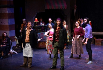 The irony in the title lies in the swift transition from the opening scene's joyful depiction of people of all ages and walks of life dining, drinking, conversing and dancing at the Kafé Heaven to the living hell depicted throughout the remainder of the play, set in Bosnia-Herzegovina during the war that raged from 1992 to 1995. Bosniaks (who are Muslim), Bosnian Serbs, and Bosnian Croats fought one another for what each faction believed to be an existential hold on the homeland they had shared for centuries, resurrecting hatreds dating back four hundred years to the wars between the Austrian and Ottoman empires for control of southeastern Europe. After a welcome from Chvala, in guise of the proprietor of Kafé Heaven, we are propelled into the maelstrom of the war where Peter Adamson, an American freelance photo journalist, is on the verge of going home after losing faith in his belief that documenting the horrors taking place will stir humane intervention from the United States and other nations. Peter is lured by one last shot at still making a difference, offered by Faruk who will guide Peter to an incriminating photo subject in exchange for Peter's help finding his wife Almira. Almira was thought to have fled to safety when enemy soldiers massacred the Muslims. On their perilous journey, Peter and Faruk encounter dangerous groups of men, empowered by guns and the belief that their cause justifiesno, demandswiping out former neighbors with cruelty and abandon. They also meet Lejla who, with her sister, is leading their blind father to safety. Unwilling to abandon the defenseless sisters and old man, Peter allows them to travel with him and Farukagainst the latter's judgement. Peter at times speaks directly to the audience, confessing his own flaws, questioning his motivations, while struggling during each encounter with deadly force to maintain a steady hand as well as his honor. The other characters reveal different aspects of suffering and ways of coping with conditions none of them imagined could so inflame their beautiful country. Heaven veers between the narrative of Peter and his band, each searching for some form of deliverance, and depictions of the war all around them, brutal views of battles, mass-murders, hunger and want, presented through Chvala's compelling choreography, the stirring score that blends folkloric motifs with the bracing clash of men at their worst, intensified by Marcus Dilliard's dramatic lighting and sharply realized sound design by Cody Anderson and sound effects by Sean Healy. From a creative standpoint, we are watching truly beautiful artistry, combining the elements of stagecraft with élan. At the same time, we feel the deeply tragic consequence of these actions, and the futility of war as a means of solving conflicts and making life better. The work leaves us uplifted, by its sheer grace, beauty and insight, and crushed by the harsh realities of our species' capacity for cruelty masquerading as righteousness. Riley McNutt gives a compelling performance as Peter Adamson, struggling to be honest with himself while holding out hope of doing something to make things better. He is given several songs, delivered with a heartfelt voice. As Faruk, Eric Webster (a holdover from the 2011 production) creates a sharp image of a man who is good at heart, but willing to do or say what he must to keep what is most precious to him. Jessica Staples conveys Lejla's conflicted desires with both strength and tenderness, a desire to seek safe refuge and a desire to find a life where happy dreams, including love, can blossom. Lara Trujillo is riveting as Almira, a survivor who endures unrelenting loss. When you arrive, take your seat early to enjoy and be immersed in the atmosphere of the Kafé Heaven, as the musicians and dancers create a mood that captures both the culture and happiness of Bosnia at peace. Vocalist Natalie Nowytski has a beautifully tuned voice that communicates rich meanings even with lyrics in a language unknown to us. Other standouts among the excellent cast include Mary Gantenbein as Kimeta, an aging woman who cannot understand how the children she helped care for in her village are now her enemies, Nicolas Sullivan as Darko, a particularly sadistic enemy officer, Peter Coburn as the authoritative Radoslav, and Kevin Dustrude as Saa, who shows hints of uncertainty beneath his soldierly bravado. All of these last named actors and the rest of the cast play multiple roles throughout the play and join in the ensemble for the dance pieces, gliding from character to character, scene to scene, with seamless grace. Along with astonishing choreography, Chvala shows a steady hand with the book scenes and with transitions, giving the entire work a sense of constant motion, and the fluidity of a dream, albeit an uneasy one. The characters speak in a number of languages (with supertitles projected to translate all into English), and the difficulty they often have understanding each other becomes emblematic of the difficulties that turn neighbors against one another. Poling's score is beautifully played, led by music director Jake Andres; in several scenes, actors pick up instruments to add enriching tones and bring the music closer to the action. Cindy Forsgren's wardrobe of atmospheric costumes depict the folk-styles of rural Bosnia, the Euro-sophisticated look of urban life before the war, and the varying uniforms of different factions in the warsome quite official looking, others makeshift and grungy. Robin McIntyre's set provides just enough realistic suggestion of buildings that have stood for centuries, now beginning to crumble. Videos created by Steve Campbell provide additional backdrop glimpses of the village life, the pastoral landscape, and the terror wrought by war. Heaven has a long running time, two hours and 45 minutes, but every moment matters, giving testimony to the joy that is possible, underscoring the hopefulness of the show's title, and 
