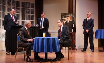 Old Log Theatre has mounted a thoroughly winning production of Five Presidents, Rick Cleveland's play that speculates on what might have been said among these former commanders-in-chief on this occasion. Holed up in a conference room at the Nixon Presidential Library & Museum in Yorba Linda, California, as they await the ceremonial procession that will be part of the funeral service, they exchange pleasant inquiries about family and personal pursuitsfor Ford, golf, for Carter, international relief mission workalong with the challenges and privileges inherent in being what they refer to, more than once, as the "most exclusive club in the world." Cleveland is primarily known as a television writer, an Emmy winner for his work on the politically trenchant "The West Wing" and contributing to such successful series as "Six Feet Under," "Nurse Jackie," "Mad Men," and "House of Cards," another series steeped in politics. As Five Presidents was first staged in March 2015 (a commission by the Milwaukee Repertory Company), it affords Cleveland the benefit of hindsight to insert coy foreshadowing into the script, with references to Clinton's ambitious wife and Bush's hope that "Junior" is getting his act together and will follow in the footsteps of his more responsible brother Jeb. Attention is given to Reagan's encroaching dementia, eroding his ability to live up to the sobriquet he had earned as "the Great Communicator." With Clinton being the last to arrive, the others all speculate on how the "new kid," whom they also refer to as 42 but never by his name, will make out facing demands they each know all too well. In spite of their aim to be affable, disputes among these five are expressed, sometimes bitterly, over both policy and politics. It is clear that there is anger among them that will never be totally abated. Yet, there is also a brotherhood, a sense that each recognizes that in spite of political machinations taken against them, in spite of being saddled by problems created by their predecessor, they are honor-bound to the dignity and immense power of the office of the president, and at the end of the day, place that ahead of personal accolades and partisanship. In 2015, Cleveland could not have known that less than a year later, the sanctity of that office would be put into great jeopardy by the man voted into the Oval Office, a president unlike any other who has come before him. At the same time, social media has greatly reduced the presidency's seclusion from the public eyes and ears, making it more difficult for any leader to reserve their private thoughts and ambitions for the members of their exclusive club. The opportunity for Cleveland to write a sequel that incorporates both Barack Obama and Donald Trump into the club is intriguing, to say the least. While there is nary anything resembling a narrative arc in this 85 minute playwalking in, we know that nothing about the status of these five men will be different at the close of the playCleveland has crafted smart dialogue that captures the spirit of each of these five men, and has done his research in terms of unearthing open sores among them. Five Presidents passes quickly, providing some insights into each man, his presidency, and his place in the greater pageant of America's story, while also showing each to be fully human, with flaws and regrets easily spotted. That any humanman, woman, or gender-fluidcould rise up to shoulder the burden of the position of President of the United States becomes an astonishing act in itself, building an understanding of the inevitability of each of them falling short. Martin L'Herault has directed Five Presidents with a sense of panache, giving in to the larger-than-life quality of each of these men, and allowing for the awkward moments that greet each new arrival to the room as conversation stalls and then shifts to include their presence. The moments of heated angerwhich come close to physicalare made totally believable, as are the moments of concession from individual positions to what serves the greater good. He sifts humility from the pride and ego that stoke these past and current presidents, making it a means of lifting leadership from power only to a form of nobility. There are four available chairs in the room so that once all five presidents are in the room, at any one time at least one of them must be standing, which provides for movement and rearrangement of the men among themselves and keeps the talky play from ever feeling static. L'Herault also acts the role of Jimmy Carter, capturing Carter's crisp fundamentalist mannerisms as well as his gentlemanly conduct, but also his tenacity at holding tightly to principles that guided his presidency and guide him still (starting August 14, Pat O'Brien replaces L'Herault as Carter). James Ramlet portrays Gerald Ford. He is first to enter the room, taking great interest in the fully stocked bar available to him and his fellow club members. Ramlet convincingly conveys Ford's ambivalence about being presidentthe only man ever to hold the office without ever running for itand the frustration of being known only as the president who pardoned Nixon, and the false assumption made by most of the public that he had cut a deal to promise a pardon in exchange for the presidency. As Ronald Reagan, Steve Sheridan makes the strongest impression among the all-around excellent cast, starting out with the scent of his Hollywood roots, a glib, well-oiled politician straight from central casting, but holding his own under attack, then slowly revealing his losing battle with dementia. Casey E. Lewis is a stalwart George H. W. Bush, still angry 18 months after losing his re-election bid, his pride caught between his legendary predecessor and upstart young replacement. William Gilness gives a fully credible portrayal of Bill Clinton as a the newest "inductee" to the club, unsteady on his feet at first, but gradually loosening up, revealing a naivete about appr