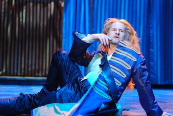 In her Servant of Two Masters, Gardiner draws heavily upon the Italian comic style in which Goldoni wrote the piece, known as commedia dell'arte. That style was in common use in Italian theater as far back as two hundred years before Goldoni himself coined the phrase, uttered by a character in his 1750 play The Comic Theater, written after his first production of The Servant of Two Masters in 1746, but three years before he offered a revised version, in 1753, which is the one in common usage today. Gardiner makes heavy use of the stock comic characters that are the hallmark of commedia dell'arte, especially the central title character, Truffaldino, based on the Italian archetype Arlecchino (or Harlequin, in English), a zany comic servant who is lighthearted but clever, physically agile, and who often thwarts the plans of his masteror in the play at hand, his two masters. The play is set in Venice and begins with the merchant Pantalone (another of those stock characters, the well-to-do merchant concerned with social status and ego, but easily deceived) celebrating the engagement of his daughter Clarice to her young suitor Silvio, son of Doctor Lombardi. The young lovers are also stock characters, enthusiastically in love and a bit naive. The engagement was made possible by the fact that the man to whom Pantalone had betrothed Clarice, Federigo Rasponi of Turin, was recently killed, freeing Clarice to pursue her heart's desire. All is brought to a halt when the servant Truffaldino appears, requesting permission for his master Federigo Rasponi to enter Pantalone's home, creating the illusion that Federigo still lives. In fact, it is not Federigo but his sister Beatrice Rasponi, disguised as her late brother. She is after the dowry that was to be paid for his marriage to Clarice, then plans to escape with the ill-gotten wealth and marry Florindo, her true love. It was Florindo who had killed Federigo, who was trying to keep him from marrying Beatrice. Pantalone calls off the wedding of Clarice and Silvio to honor the betrothal he had earlier brokered, leaving the two young lovers in despair. Beatrice retires to an inn, leaving Truffaldino, who cares more about affairs of the stomach than of the heart, for he has an insatiable appetite. Another man approaches the inn and, spying Truffaldino standing alone, offers him employment as his servant. With the chance to double his meal ticket, Truffaldino accepts the offer, thus becoming a servant to two masters. Adding to the mayhem, Truffaldino's second master is none other than Florindo, who has fled Turin after killing Federigo, unaware that his own beloved Beatrice is under the same roof, as Truffaldino uses all his wit to keep his two masters apart. The servant's crafty and hilarious efforts to conceal his duplicity reach a frenzied peak when he must serve a lavish dinner to both masters at the same time, culminating in a hysterical juggling act both figuratively and literally. In her adaptation, Gardiner inserts pop culture references, ranging from Harry Potter to The Princess Bride, which fit well within the framework of this play being a lark. She melds the character Smeraldina, a serving girl who becomes a love interest for Truffaldino in Goldoni's original, into the character of Brighella the innkeeper, so that ever-famished Truffaldino is comically smitten by Brighella's incredible artistry in the kitchen rather than the allure of a young coquettish maid. Gardiner jettisons the part of Silvio's father, the Doctor, completely, or almost so. It becomes a merry opportunity for an audience member to join the cast, with specific instructions as to when to speak and what to say. Gardiner keeps everything moving at slapdash pace, barely allowing time for laughter from one scene to subside before the next set of comic hijinks rolls in. Silas Sellnow is a splendid Truffaldino. Sellnow is a young actor appearing for his sixth consecutive season at Great River Shakespeare Festival, appearing on Twin Cities stages during the rest of the year. He has grown into a versatile performer who easily commands the stage with lithe physicality, bright line delivery, boyish good looks, and a mastery of all things goofy. He makes splendid use of the insertion of food items in place of curses, crying out such phrases as "Fish sticks!" and "Holy guacamole" with aplomb, and his servile courtesy is endlessly endearing. As Florindo, Andrew Carlson is hilarious, appearing with a Fabio-like cascade of hair that he tosses about with manly abandon, adroitly blending physical comedy, faux masculinity, and a dim wit throughout his performance. When he realizes a portrait mistakenly given to him is of himself, Carlson exclaims "Why, that picture is of me! I'd know it anywhere!" without betraying the doltish mind that would utter those words. Leah Gabriel is striking as the determined Beatrice, who has taken it upon herself to make it possible for her and Florindo to live happily together. Gabriel handles well the task of performing as a woman disguised as a man in a disguise keen enough to fool the others on stage, but to be transparent to the audience. Christopher Gerson, a festival veteran who might himself have been a triumphant Truffaldino ten years ago, brings out the humor in Pantalone's fustiness. Gracie Belt and Daniel Stewart are adorably in love as Clarice and Silvio, respectively, each a bit whimpering and light in the noggin, but wholly sincere. As the innkeeper Brighella, Victoria Nassif makes a striking impression, being the most astute among the characters, while also bringing sass and sexiness to her portrayal. The setting is a simple but functional affair, with drapes hung on curtain rings from an overhead catwalk pushed to one side to indicate Pantaloon's home, another to become Brighella's inn. Two rows of seats for audience members to sit on stage face the players from the left and right, creating a thrust-stage effect that suits the frequent movement am