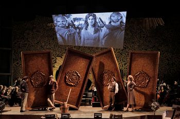 Any traditional staging of the opera will focus on the title character and her obsession with avenging her father Agamemnon's death at the hands of her mother Klytaemnestra and her mother's lover Aegisth. Elektra's brother Orest was years before banished from the kingdom. Her sister Chrysothemis shares Elektra's grief over their father's murder, but wants to escape the violence and mayhem that has infected their family; she wants to marry, bear children and know a decent life. That leaves only Elektra to seek blood justice, intent on using the same axe that was used to kill her father. For the Minnesota Opera's production, stage director Brian Staufenbiel has devised a way to place the heroine's obsessive rage in a context of melodramatic storytelling, using a technology that was just emerging when Elektra premiered in 1909. Staufenbiel places the opera in a silent film studio where the eminent director Fritz Lang is making a grand-scale movie of Elektra, with its jarring score performed by an in-studio orchestrameaning, on stage, visible to the audience. Performers enter through a gaping mouth cut into a wall of gold filigree, and down an aisle that wends through the orchestra. The pit is filled in to furnish the space from which the director, the cameraman, and other functionaries shoot the film. During some scenes, as we watch the performers live on stage, the camera shows them on a screen cleverly positioned in front of a mammoth studio set, with their tortured faces in close up, mirroring the hyperbolic emotional images silent movies used to compensate for the absence of the human voice. The effect does not diminish the beauty of the voices that rise up to deliver Strauss's powerful score, but rather adds a visual element that draws parallels between the necessary excess of emotion in both media. It is enriching, enthralling and entertaining. Making more use of the silent film concept, Staufenbiel opens the production with a screening of a short silent film, The Fall of Agamemnon, that furnishes the backstory behind Klytaemnestra's murder of Agamemnon. This background is found in Sophocles' play but was left out of the opera in order to focus solely upon Elektra's obsession. We learn that Klytaemnestra was driven to kill by her fury against her husband for sacrificing their youngest daughter, Iphigenia, to appease the goddess Artemis, who was impeding the Greek army from going to battle in the Trojan War. This does not make Klytaemnestra's murder of Agamemnon any less heinous, but places it in a chain reaction where one violent act triggers another, and another, and in which Elektra's vengeance is just one more. With the camera showing them in close-up, the principal cast members in Elektra must not only sing Strauss's challenging score with force and clarity, but must also show the intensity of their passions on their faces. Foremost, Elektra must be a tigresscunning, strong, willing to slink through the most debased conditions to satisfy her need for revenge. Sabine Hogrefe, performing on opening night, indeed conveys all of this, not only when singing but while lurking about the corners of the palace courtyard, awaiting a chance to pounce into action. When she does raise her voice in songwhich is a good deal of the timeher gorgeous soprano delivers the heartrending lyrics with the force of a typhoon, modulating tones to convey the depth of her feeling. As Klytaemnestra, Jill Grove's lush mezzo-soprano provides darker tones as the self-righteous queen who lives in fear of being punished for committing murder, even though she has no remorse for having done it, and shows no sympathy for the trauma it has brought upon her daughters. Marcy Stonikas gives a tender performance as Chrysothemis, terrified by all that has befallen her family and wanting only to avoid any more. She wants to comfort Elektra, but cannot be her comrade. Stonikas' soprano is beautifully rounded, conveying more heart-felt yearning as opposed to Elektra's strident call to action. Craig Irvin, as Orest, has a powerful baritone to match his physically robust bearing, leaving no doubt that he is up to the task Elektra lays at his feet. Irvin achingly shows Orest's pained reaction as Elektra describes the abuses she has been subjected to since their father's death, with every one of her words seeming to strike a blow upon his heart. Elias Grandy conducts the on-stage Minnesota Opera Orchestra, giving a vigorous, full-throttled presentation of the score, which, along with Salome, is considered Strauss's deepest foray into atonal modernism. There is little here in the way of lilting melody, but this is soaring, emotive music that commands attention while perfectly matching the sorrowful narrative. Director Staufenbiel also created the production design, in which his sound stage concept meshes with the opulent palace courtyard at ancient Mycenae. David Murakami created the brilliant video and projection designs so thoroughly integrated into the production. Mathew LeFebvre's costumes are inventively elaborate, ranging from the ragged gown worn by Elektra to a homely dress for Chrysothemis to the garish apparel for Queen Klytaemnestra, with a headpiece of bejeweled projectiles surely meant to instill fear in all who lay their eyes upon her. Lighting designer Nicole Pearce provides the appropriate shifts between despair and hope, though the occasion leans more heavily on the former. As written by Strauss, Elektra is performed in one act of 100 minutes. Arrive early and you will see the cast and crew going through the motions of setting up a silent film sound stage, a twenty-minute long pre-show that embellishes the production's ingenious concept. Knowing that Elektra is a grisly story that deals with some of the human species' most vile and dangerous instincts, I cannot say I was looking forward to it with joy. However, I found that the inventiveness of the production concept, the stirring grandeur of Strauss's score, the 