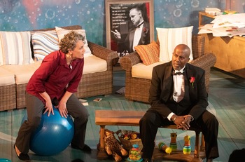 O My God! was written in Hebrew by Anat Gov, a prolific Israeli playwright who died in 2012, just a few days shy of her 59th birthday. It premiered in 2008 in Tel Aviv, and since 2011 its English translation has been making the rounds of regional theater companies in the United States, now happily arriving in the Twin Cities. There is a lot more to the play than a setup and a punchline. It offers a series of arguments about what God expects of mankind and what mankind expects of God, trying to sort out the reasons neither party in the relationship has been terribly satisfied. The therapist God selects to bare his soul to is Ella (Laura Stearns). Ella is a secular Jew, the type of atheist who nonetheless looks up at the sky and complains, jokingly, to God for not coming through with sorely needed rain. She is also a single parent whose husband left after the birth of their son Lior (Sean Carroll), who is diagnosed on the autism spectrum. Lior is in his early teens and clearly intelligent, with musical giftswe see and hear him play the cello for ourselvesand artistic talent, but his behavior is that of a much younger child, his motor skills are awkward, and he is completely non-verbal. He appears to understand his mother but has never responded with even a single word. Apparently, Ella sees patients at her home while Lior is at school. She has made an exception today because the gentleman who called sounded so desperate, and so mysterioushe would only identify himself as "G." When God (James. A Williams) arrives, he continues to withhold his identity, and when Ella finally gets him to reveal who he is, she responds "That's alright, I've had a lot of patients who feel that way." God is insistent, stating that "I don't feel like God, I am God!." Once she is convinced, Ella is not at all confident that she, of all people, will be able to help him, but God prevails  (well, c'mon, he's God, and in the person of James A. Williams, a smooth talker and mighty presence). The play continues in real time, as Ella allows a standard fifty-minute therapy session to run just a bit over time, prodding God to lay his cards on the table. He has a lot to sort through: what prompted him to create the heavens and earth, why he felt compelled to create man, and how the introduction of women into the scene changed God's dynamic with his creation. Some topics are explored with depththe expulsion from the garden, Cain and Abel, and particularly Job. Other's are tossed in to provide one-line jokes. The focus is on God of the Old Testament, with the briefest mention of Jesus and Muhammad. Ella proposes several theories about where things went wrong, and bluntly points out God's own failings to him. God pushes back and gets Ella to own up to having strayed off of her own path, but she is undeterred from peeling back the multiple layers of God's defenses. The play is consistently engaging, with commanding performances by Laura Stearns and James A. Williams. Robert Dorfman has directed the piece to be played straight, never treating the surreal premise as if it were anything other than real, never suggesting a wink, which makes both the humor and the heart within the piece all the more potent. Early on, Stearns conveys her deep love, edging on awe, for Lior, along with her natural feistiness. Her earnestness, without a trace of artifice, makes the absurdity of sitting face to face with someone she doesn't believe exists, and being able to engage with him, not as an awesome and all-powerful presence, but just another client, feel weirdly plausible. Sean Carroll's role as Lior is very small, but he plays the part with great authenticity. Williams struts in with the arrogance of a Greek or Roman god, a god with all manner of human faults, and suffering the despair of a human whose heart has been broken. He speaks persuasively of the God he was, all powerful and all knowing, while demonstrating a God whose powers are waning, to the point that he turns to this mortal who does not even believe in him for salvation. Stearns and Williams have a great chemistry that makes them delightful intellectual sparring partners. Michael Hoover designed the patio behind Ella's home, and it is busy with wicker and wrought iron furniture, a large stability ball which both Ella and God sit upon in the course of God's therapy session, a framed poster from the Godfather movie, and varied clutter. The wall behind it is painted in a sweeping blue, and pink, with bubble-like patterns, and several of Lior's paintings are taped upon the wall. The lighting designed by Matthew Gawryk and sound designed by Adam Wernick bring a sense of the real world to this vibrant and somewhat surreal setting. For all of the spark and wit in the script, and fascinating discussion of portions of the Old Testament, I was less than fully satisfied with the ending of O My God!. God's decisions and responses across the millennia had been inconsistent, more dependent on his mood or feelings for a particular person than a belief or values system. At the play's end, as the therapy clock runs out, Ella forms a conclusion, but my sense is that if they kept going another thirty minutes, a different conclusion might be reached, and in thirty more, yet another. After all, how could anyone unravel all the emotional turmoil dispatched by God in fifty minutes? I found the ending to be "feel good" more than "feel right." The play was originally titled Oh God!, and that title is still used in some productions, while others, as at Minnesota Jewish Theatre Company, have used the title O My God!. I could not find a reason for the use of slightly different titles, but I rather prefer O My God!. It implies a personal relationshipmy Godas opposed to an impersonal deity. If nothing else, at the end of the play, Ella, who scoffed at the notion, has a vividly personal relationship with God. Perhaps all the wrangling over God's despair was really meant to provide Ella with a light that bright