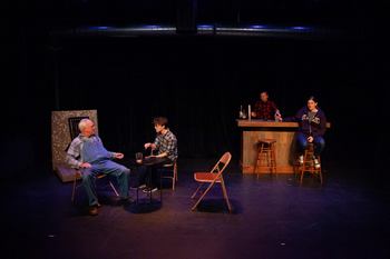 The play opens with Ben and Amanda on their porch, with the sound of chirping crickets letting us know they're in a small town, having moved here from Minneapolis. Ben loves it. They can afford their own home here and he can walk to the town tavern and drink among folks who all know and care about each other. Amanda does not share Ben's enthusiasm. She misses the city and has a long commute for her job as a nurse in the county seat 40 miles away. But she loves Ben, and loves that he is happy here. In the next scene, Ben is on trial for murder. Ben confesses to the crime, claiming he killed Joe in self-defense. Knowing this early on, the play is not a whodunit, but a why-dunit. Through Ben's testimony, we see his friendship with Joe, an old-timer who grew up in this town somewhere in outstate Minnesota and never lived anywhere else. He and his wife live in the house his father built, on property that has long been in their family. He likes his town the way it's always been and doesn't like change. Ben's friendship with Joe is forged at that local bar and as co-workers in the factory that employs most of their town. Their rapport is built on complaining about factory cutbacks, their mutual love of hunting, and their zeal for small town life. Then Liam shows up. Liam's hair and attire identify him as something other than a rugged all-American male. Joe is openly rude to Liam, leaving no question that he feels that the sooner Liam gets out of his town, the better. Liam is a community organizer, assigned to bring out the votespecifically Democratic votesin rural communities. This makes him no friend. Liam is not in fact a gay man (as Joe assumes) but a transgender male. What's more, Liam and Ben knew each other in Minneapolis where they were both in a support group for people in early stages of transgender transition. Thus, we realize that Ben is also transgender malesomething that neither Joe nor anyone else in their small town knows, excepting Amanda. And Ben is determined to keep it that way. It also helps to know that Joe carries a hand gun with himalways hasand he keeps his hunting rifle, that once was his father's, on the porch, leaning beside the front door. By now we have a pretty good notion, if not how, at least why things go wrong. While it is true that Joe is shot to death and that the casual availability of firearms is what enables that death to occur, the argument over access to guns is almost shoe-horned into the play. In one scene, Liam argues the issue with Ben, with Liam taking an "any gun is a bad gun" point of view. This does not address the nuance of our current policy debates. Neither Joe nor Ben would be denied legal ownership of their respective firearms even if the most stringent of proposed policies were enacted. The issue of community is more clearly and consistently presented. Ben loves the simplicity of small-town life, having fled the city when things went wrong (in ways that are never fleshed out, a weakness in the play if we are to truly understand Ben). Yet to achieve that simplicity, he allows his life partner Amanda to compromise her happiness and completely submerges the core of his own identity. For all his appreciation for the way small-town folks care about one another, he fears that if they knew the truth they would feel very differently. Further, he underestimates what it takes to be viewed a part of that community. Ben and Amanda have been there five or six years, a far cry from those like Joe who have been there generations. Liam, on the other hand, tries to remind Ben of the community they had in the support group, and the strength that Ben seemed to draw from that community. Ben never denies the value that afforded him, but for someagain, unidentifiedreason, it all fell apart for him. His answer seems to be a retreat to the other extreme, without a game plan other than to remain totally hidden. In a Stand of Dying Trees rakes in other issuesunion organizing, capitalism, corporate health care, and sexism among themintertwined in ways that work well from a narrative perspective, but end up being a lot for the play to sustain. The play succeeds in showing the intersectionality of these issues and of individuals affected by them, but with so much on the plate, we get only a few bites of each. Director Emily England manages the transitions between scenes well, working with the stage configuration at the Off Leash Art Box, so that the bar in which most of the action occurs, the porch outside Ben and Amanda's home, and a courtroom witness chair that spins around to become a deer stand in the woods, stretch out along the narrow playing area. Set designer Maggie Mae Sulentic has a rare combination of talents, as she is also the fight choreographer, staging a heated scene that threatens to erupt into full scale violence with keen authenticity. The play's four actors all earn high marks. Jeff Miller plays Ben, the character whose values are most challenged and whose efforts to conceal his truth end up backfiring tragically. Miller is excellent in the role, smugly complacent drinking with the good ol' boys, like Joe, then struggling to rein in encroaching anxiety as Liam's presence and Amanda's rising need for his support threaten his "safe" existence. Mike Novak is terrific as Joe, a wide-grinning good neighbor who will give you the shirt off his back, unless you offend his sensibilities by being anything other than what he has always known. And if you do, he knows how to get mean. I know guys like Joe, and Novak nails the character. Novak also provides the authoritative voice of the off-stage court interrogator. Carey Morton makes a solid impression as Liam. Though the character, as written, is terribly annoyingreally, with a graduate degree as a community organizer, he ought to have a better idea how to go about things without alienating the whole townMorton makes him believable, and shows us the strength he exudesin contrast to Benby living with his truth.