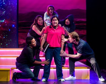 Good Asian Drivers developed a strong online following that drew large audiences to their concerts and fueled sales of their recorded work. They offered a lifeline to queer youth, Asian-American youth, and especially those whose lives intersect both worlds. And, importantly, their music and words were great. Some years later, having given up their Good Asian Drivers persona, it occurred to Li and Yan that the whole experience had the making of a powerful story that should be told. Since music is in their blood, the story would need to be told through music. That turns out to have been an inspired idea. The result is Interstate, a two-act rock musical that is gripping, insightful, moving, lyrical, infuriating, funny, tenderhearted, sexy, and just about perfect. A developmental workshop production at the New York Musical Festival in 2018 led to further development last year at the Johnny Mercer Colony at Goodspeed Musicals. Twin Cities audiences now have the privilege of seeing the world premiere production of Interstate at Mixed Blood Theatre, with Jesca Prudencio driving from the director's seat. Here, the performers are called Adrian (Rose Van Dyne) and Dash (Kai Alexander Judd), and their act is called Queer Malady. Interstate takes its name from the interstate highways the musical partners drive on their tour from their New York City home to San Francisco, by way of numerous gigs and out of the way stopovers. Interstate can also refer to the transitional places people often land in, between clearly cut gender distinctions and roles. Adrian is enthusiastically a lesbian, with a girlfriend named Carly. Dash has been injecting testosterone long enough to have come a long way toward becoming the man he was meant to be, even if he arrived on this earth in a female body. Dash embarks on the tour with loving support from his father, who is a champion for Dash to be true to himself, asking only that his son bring him back a 49ers jersey. For Adrian's mother, leaving home is an act of rebellion. She thinks Adrian should spend the summer polishing up her applications to law school, with such undercuts as "When this music thing fails you'll be glad you did." On the road, Dash and Adrian are adored by fans but encounter prejudice and threats of violence as they traverse middle America. Also, their different approaches to touring grate on each another. Adrian worries the venue arrangements while Dash scopes out the best local food joints in each town. Most concerning, though, is a call Adrian receives offering her a shot at a recording contractnot for Queer Malady, but as a single act. Dash's spoken word rants, it seems, are too politically abrasive for a broader, more mainstream audience. Will Adrian take the bait and abandon her musical partner, as well as the many fans following every day of the duo's interstate journey? One of those fans is Henry (Sushma Saha), a trans teenager in a small Kentucky town, named Priya as a baby girl by South Asian parents. The notion of being trans isn't even on the radar of the bullies at school, who assume the boyishly dressed student is a lesbian. This would be hurtful enough, but all the more so because no one sees Henry for who he is. He tries to reach out in every way he can, but finally the only thing left is to leave home and connect with his hero, Dash. Henry boards a bus and heads for San Francisco to catch Queer Malady on their last tour stop. Interstate is as much the story of Henry's journey, both his personal odyssey to grow into himself, and his trek to California, as it is about the struggles Adrian and Dash encounter in negotiating their friendship, their diverging personal needs, and their sense of responsibility to their fans who draw sustaining strength and courage from Queer Malady. The two narrative strands come together in a logical way that brings the show to an empowering and uplifting conclusion. The songs in Interstate are great, with catchy, melodic tunes and thoughtful lyrics that verge on poetryno surprise, considering that Kit Yan is a poet. The opening, "Hello Open Road," sets the stage for our two-hour journey on the interstate. "Hero" is a heartrending paean from Dash's fans, trans teenagers who see him as someone who made it happenespecially meaningful for Henry. "Not My Gay Pride" is a lilting number that humorously makes the point that being "gay" isn't just one thing. "Why I Share," is a moving statement about pouring your heart out to an electronic device when there are no people to listen to you. "Man Up" is Dash's quandary: does wanting to be a man mean acting like a man in the way popular culture conceives it? "Everything Changes," elaborates poignantly on its title, and "These Hands" is the background for one of the most vividly arousing sex scenes I have ever seen on stage. There are others, and not a clunker among them. Eight terrific performers bring Interstate to life. The three leadsJudd as Dash, Van Dyne as Adrian, and Saha as Henryall impress with strong voices that pour feelings into the delivery of their songs, while having the acting chops to create whole and authentic characters, each with their own reason for drawing our support. If Saha seems to give the strongest of all the performances, it may be a function of Henry being such a sympathetic and deeply conceived character. Five actors play multiple roles, switching parts with aplomb. Lily Tung Crystal is effective as Adrian's demanding, unsympathetic mother, and Brian Kim is delightful as Dash's kind, albeit naive, father. Zeniba Now makes a strong impression as Carly, Adrian's girlfriend and a total straight-shooter, pardon the expression. Tom Reed is excellent as wrong-minded Pastor Fred and Meredith Casey does well as Madison, a girl in school who comes closest to understanding Henry, and as a snarky record executive. Jesca Prudencio moves Interstate with smooth transitions between the two main narrative strands and clear use of the cast to fill scenes b
