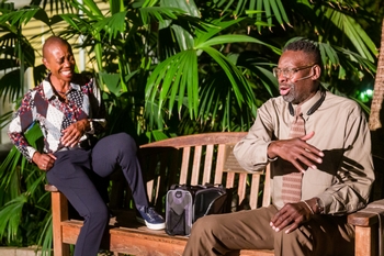 Animate is not just performed at the zoo; the zoo is its primary thematic element. The play is presented as promenade theater, with audience members walking from location to location witness different scenes with, in this case, seals, gorillas, polar bears, a giraffe, a sloth, and a tiger looking upon the proceedings as if to authenticate them. Reuler has had great past success with plays in promenade style: 2017's Safe at Home was set in a variety of behind-the scenes spaces at CFS Field, home of the Saint Paul Saints baseball team; in 2019 Autonomy ferried audience members riding on golf carts through a circuitous route laid out at the River Center exhibition hall in downtown Saint Paul, pausing for scenes along the way. In Animate, the large audience starting out together for an opening scene that establishes the narrative, set in the fictional Jackson Kennicott Zoo (what a great and believable name!), before dividing into six groups that each are led to one of six scenes (each in the company of one of the above named animals), cycling through all six as they uncover different facets of a crisis facing the zooalong with a few lesser but still compelling conflictsbefore gathering back at the zoo's outdoor amphitheater for the resolution. The play opens in spectacular fashion with a helicopternot an elaborate stage effect, thank you Miss Saigonbut an actual chopper landing outside the open doors of the assembly area where a courier (Randy Reyes) hops out with an urgent delivery for the zoo's keeper of pangolins (Kevin Kling). He barges in on a briefing by Jackson Kennicott's executive director (Regina Marie Williams), assembled with the zoo's board chair (Sally Wingert), head curator (Bruce A. Young), an officer from the Coca Cola foundation, a key funder (Jevetta Steele), and the mayor's chief of staff (Warren C. Bowles). They are gathered in advance of a major announcement: the zoo will be the home of a prestigious new rhinoceros habitat with the mission of bringing the northern white rhino back from extinction. The announcement is derailed by a revelation that the wealthy donor funding the center is a racist and that an anti-racism activist (Taj Ruler) is determined to shut the project down. Based on the caliber of actors cited above, it's easy to discern that Reuler assembled a cream of the crop cast for Animate, and they all glow. This entire enterprise has the sheen of a labor of love. In addition to the eight actors named above, eight other actors appear live, three appear on screens as Wingert's feisty board chair strives to keep the rhino project alivehere, Barbara June Patterson offers an exquisite portrait of an old-moneyed doyenne whose mind is beginning to go, but whose grace remains solidly intact, and Joe Minjares epitomizes a mayor whose leadership takes the form of counting votes. And yes, that really is Don Cheadle narrating a video created to promote the rhino center. In addition to the central crisis over the fate of the rhino center, the zoo faces the separation of a pair of gorillas who have been mates for life in order to advance their breeding program; whether or not to euthanize a beloved giraffe who has outlived her role at the zoo and thus deemed a "surplus animal"; and the pangolin keeper's conflict, this last being a comical break from the more serious issues, with Kling most amusing as a nerdy animal lover and long time bachelor on his wedding day, while Khamara Pettus charms as his bride. In the manner of such Robert Altman films as Nashville, Gosford Park or Short Cuts, the large cast comprises an embarrassment of talent, but with so many characters it is hard to find a center. In the end, it is Regina Marie Williams as the driven zoo director Keisha Hardeman. Her character articulates the hard choices that have to be made, both on the crisis facing the Jackson Kennicott Zoo and more broadly in life. We observe Keisha at lunch break with the head curator, an old hand at the zoo, endowed with well-earned perspective in Bruce A. Young's performance. He encourages Keisha not to push so hard, to take things easierall in the company of Chloe (her real name), the tree sloth perched above them, the slowest, most sedate animal imaginable. Playwright LaZebnik and director Reuler use the animals almost as a Greek chorus, commenting on the narrative by their mere presence. Similarly, two primatologists, one well beyond reason in her devotion to the gorillas, played with palpable passion by Kate Fuglei, the other her level-headed former partner, a born-again pragmatist played by Stephen Yoakam, argue their cases in front of the gorilla enclosure, with the magnificent primates looking on. When the fiery protest leader Tamar, given a persuasive edge by Taj Ruler, and the foundation officer representing the power of corporate wealth, played with steadfast dignity by Jevetta Steele, face off, these two forceful women stand in the large cats building, with a glowering Bengal tiger pacing in its enclosure. Lipica Shah, as the giraffe keeper, makes a passionate plea for the life of the giraffe she has cared for since its birth as a fifteen foot giraffe in the enclosure next door chomps at the leaves of a tree branch swinging from the ceiling, testifying on behalf of its vitality. Abbee Warmboe, premiere prop designer for many Twin Cities theater productions, handles props as well as scenic and costume design. Scenery is minimalthe zoo is the set. Costumes, on the other hand, are exceedingly well chosen, with each character's garb in perfect sync with their role in the story. Keisha, the heavily burdened director, dresses just like directors dress: stylish, expensive, but ready to work. Kiki the primatologist gone rogue dresses just as such a character would dress, while her opponent Jonah has traded his field gear for the trappings of academia. I am positive I have seen the nubby wool jacket Geraldine the foundation officer sports at numerous board meetings I've attended. A