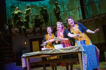 Still, I can't say that that this cavalcade of Andrews Sisters' hits, a pair of vintage 1940s stage acts, Christmas songs, and testimonies from a sampling of menand one womanwho sacrificed so much defending our nation during World War II, makes a whole lot of sense. The show places sisters Patty, Maxine and LaVerne in a rehearsal studio on Christmas Eve, 1944, readying to perform for servicemen back from war duty at a USO club. Guest stars slated to appear in their show are Bing Crosby and the comedy team Abbott and Costello. This is not as random as one might think. The Andrews Sisters performed and recorded frequently with Crosby, making a whopping 47 records together, 23 of which hit the Billboard charts. They appeared in three movies with Bud Abbott and Lou Costello, including Buck Privates, which launched the trio's all-time greatest hit, "Boogie Woogie Bugle Boy." However, the sisters are not content to just sing their popular songs and mug with their guests. To make the USO show more meaningful for their audience, they've solicited letters sent home to loved ones from those fighting in the war, intending to read the letters aloud during the show and link a song selection to each one. Their manager, Lou Levy, is dead set against the idea, saying it will slow down the show's pacing and bring down the mood. Nonetheless, the letters pour in and as Patty, LaVerne or Maxine read them in their dressing room, the letters' authors takes over, with actors conveying the fear, the loneliness, the drudgery, and sometimes the ambivalence they feel. That last point is made with letters voicing such concerns as a Japanese medic whose parents are in an internment camp, a female bomber pilot dealing with the incredulity of her male peers, a Black tank gunner chomping at the injustice of fighting to keep America free while knowing how his freedom back home is curtailed, and likewise Native American and Hispanic soldiers. Other letters, written by white servicemen, deal with family issues, the pain of separation from a sweetheart, and other more universal concerns. While all of these elements have their merits, putting them all togetherseasonal songs to set the tone for the arrival of Christmas, a glimpse into the heyday of the Andrews Sisters' storied career, a recollection of the sacrifices made by those on the frontlines, and a probing consideration of the contradictions between our fight-to-the-death for freedom and the reality of racial and gender injustice still entrenched in the United Statesis a lot. With so much baggage on stage, it's amazing the cast has room to do their routines, with much credit going to director Ron Peluso, who keeps the shifts from the rehearsal hall to those at warfor the most part, positioned on a balcony that arcs around the back of History Theatre's thrust stagemoving with coherence and grace. The lead performers also make these disparate ingredients into something approaching a whole. Jen Burleigh-Bentz has been with Christmas of Swing since its first run in 2004, so her performance as LaVerne is highly polished, projecting the sense of the oldest of the sisters who exercises a steadying influence. Elena Glass as Patty and Julia Ennen as Maxine are both new to the show, but each brings a clear voice and sparkling presence, with Glass projecting Patty as the risk-taker in the family, and Ennen conveying Maxine's personal pull on manager Lou Levy. The three sing in lovely, syncopated harmony, which of course is imperative when portraying the Andrews Sisters. Ryan London Levin is excellent as Levy, whose hard-nosed approach has kept the Andrews out in front for many years. Max Wojtanowicz channels a good facsimile of Bing Crosby, not only in voice but in his faux laid-back demeanor. Tom Reed as Bud Abbott and Brendan Nelson Finn as Lou Costello manage to make the comedy legends' resurrected routines entertaining, if not hilarious, and offer a swell version of "Oh, How I Hate to Get Up in the Morning." Allison Vincent scores points as the grouchy stage manager trying to keep the rehearsal moving. The entire cast is affecting in their turns as soldiers and pilots baring their souls through the letters sent home. Thomas Draskovic is especially moving as a member of the Ojibwe, trying to parse together his convictions about fighting for his land when that land is, in a real sense, no longer his. He expresses his deep pride in his native culture in an endearing bit as he teaches another G.I how to say "blueberry pie" in Ojibwe. Peyton Dixon hits the mark head-on as he bristles at General Patton's urging the troops to win it for him, when he knows, as a Black soldier, that nobody is fighting on his behalf back home. The onstage band led by music director David Lohman consists of just piano, bass, drums and reeds, but provides a full-sounding accompaniment to the many songs on the program. Kathy Kohl has dressed the sisters, their guests, and the soldiers in costumes apt for the period, and Kathy Maxwell's video montages offer smatterings of the real face of war, a somber backdrop as the letters back from the front are being read. The set, the lighting, and the sound, are all up to History Theatre's high standards. There is a lot of music: 25 musical numbers, and three of those are medleys comprising a few songs apiece. The show starts out with the tepid "Jing-a-ling, Jing-a-ling," but the next number, "Kalamazoo," is a honey. Other highlights are Bing's crooning of "Christmas in Killarney"; two songs performed by the sisters and Levin, first in the role of the manager ("I'll Never Smile Again") and then as a lovesick soldier ("You're All I Want for Christmas"); a beautiful and troubling "O Holy Night," with Ennen in the lead and a montage of war carnage on the screens behind her; "A Hot Time in the Town of Berlin" with Bing joining the sisters; "I'll Be Home for Christmas" sung with great tenderness by Adán Varela, andyou knew it was cominga rousing "Boogie Woogie Bugle Bo