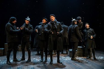 All Is Calm: The Christmas Truce of 1914 is the true story of an improbable, some might say miraculous, event between the trenches occupied by British, Scotch and French on one side and German troops on the other. Both sides expected to easily defeat their opponents in the war, which became known as "the war to end all wars," though sadly, it was not. No one expected to still be fighting, at a deadly impasse, as the days shortened and yuletide arrived. The trenches were cold, damp, miserable constructions that ran for miles through France and Belgium, the last place those demoralized soldiers wanted to be for Christmas. Remarkably, an impromptu truce occurred in one section of the front, initiated by a few German soldiers, with the Allied soldiers promptly responding in kind. There was singing of Christmas hymns in both languages, exchanges of family photos, and trading of cigarettes and other scarce commodities. In the morning light, their immediate officers on both sides agreed to allow their men to bury the bodies of their dead comrades, strewn mercilessly on the ground of no-man's land between the two trenches. After this grim duty, a soccer ball appeared and it was Germans against British, a raucous but good spirited game. The Christmas truce came to an end when higher level officers arrived, livid at the grave offense of fraternizing with the enemy. We know this is true and not apocryphal because All Is Calm is based completely on letters written by men who were there, along with diary entries and official reports, adorned by several poems from the pens of soldiers. Between the recitations of these statements, songs of the era are sung a capella in stunningly beautiful choral arrangements by Erich Lichte and Timothy C. Takach, as demonstrations of the changing moods. They range a jaunty "Come On and Join," set to the tune of "Alexander's Ragtime Band," as Englishmen sign up for the war they expect to be an easily one, rip-roaring adventure, to a morose "I Want to Go Home" as they experience the misery of the trenches, to beautifully wrought Christmas carols, expressing the light of peace still alive within them, despite the violence they have inflicted and endured. Every element of All Is Calm works in perfect harmony with the others. From the opening scene, one soldier barely visible through a cloud of smoke, a ghost returning from his horrific past while singing the tenderly plaintiff "Will Ye Go to Flanders," a traditional Scottish tune. He is gradually joined by others, combining voices and imagery that draw us into their company as they revisit a most incredible Christmas past. Marcus Dillard's lighting design and Nicholas Tranby's sound design cast a spell that establishes a dreamlike aura, which continues throughout the show. Trevor Bowen's costumes have an authentic look about them, and represent the variety of men thrown together by war, Scots, English and German, country bumpkins and gentlemen. Abbee Warmboe provides props for their encampment that look like artifacts from a history museum. This wonderful artistry surrounds the eleven men on stage who bring All Is Calm to glorious life. I would be hard pressed to single out any one, but all deserve mention hereSasha Andreev, Phineas Bynum, David Darrow, Nicholas Davis, Benjamin Dutcher, Ben Johnson, Riley McNutt, Rodolfo, James Ramlet, Andrew Wilkowske, and Evan Tyler Wilson, all veterans of past productions of this work. Each one shines at every solo turn they are given; collectively, their harmonizing is sweet enough to induce tears. While the singing is powerful, spoken lines also express depth of feeling, be it glee, regret, fear, grief, hope, or any other shade of human emotion. In one heartbreaking passage a soldier describes watching his best friend be shot down in the trench, and the agony of not being able to go to his friend's side, lest he suffer the same fate. In a lighter passage, a soldier describes his company's lighthearted parade through English villages on their way to join the fighting, cloaked in an innocence that will soon abandon them. Each of these is made gripping by the combination of their author's voice and the actor's sensitive delivery. The range of dialects also bear a sense of authenticity, with Keely Wolter providing excellent dialect coaching. Peter Rothstein, Theater Latté Da's founder and artistic director, repeats his role as director of this year's production. With every actor on stage for the entirety of All Is Calm, their every move is intentional, as they form different groupings that poke at one another good naturedly, unpack supplies, shiver in the winter cold, or otherwise depict the reality in the trenches. In November 1914, Winston Churchill (spoken by sonorous James Ramlet), then a 39-year-old naval officer, wrote to his wife. "What would happen, I wonder, if the armies suddenly and simultaneously went on strike and said some other method must be found of settling the dispute?" The following month, the men fortunate enough to be at the scene of the Christmas truce seemed ready to seek an answer to that question. Tragically, it was not to be, as the war dragged on for four more years, a loss of life estimated at forty million, more than half of those civilians. The Christmas truce was never repeated. Far from being the war to end all wars, that conflict planted the seeds for the second world war, with a long string of armed conflicts following, continuing to this day. In 2020, more than 120,000 people died fighting in wars around the world. Still, All Is Calm shows us that the impulse to lay down arms, and to ask the question "Why am I trying to kill that man, who has done nothing to me?" lies within us. Entering the season when peace is meant to be the highest of virtues, this poignant masterful show is a welcome reminder that "Peace on Earth" need not be merely a dream. All Is Calm: The Christmas Truce of 1914 runs through January 2, 2022, at the Ritz Theater, 345 13th Avenu