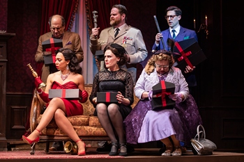 A new, long-in-development stage version of the 1985 farcical, pseudo-scary movie based on the Parker Brothers (Hasbro) board game Clue, is receiving a lavish, over-the-top, anything for a laugh production at Paper Mill Playhouse. Herein an energetic, first-rate cast throws caution to the wind to entertain those who can put aside a lack of subtlety, logic, and character development with their slapstick, farcical comedy. The setting is a large, imposing mansion isolated on a dark, mountainous road outside of Washington, D.C. Inside the mansion are Wadsworth, a butler who places himself in charge of the situation; Yvette, a sexy maid; and the cook. They are awaiting invitees who appear unaware of who has invited them and the reason for their invitation. Though the invitees are addressed by pseudonyms by the butler to protect their identities, it quickly becomes apparent that each has a prominent role in government, law, the military politics, or in the social life of prominent Washingtonians. Blackmail and murder are on the agenda of their host and blackmailer, Mr. Boddy. The back stories and plot are overstuffed and confusing, but the actions of the characters are so ridiculously over the top that it is not difficult to evaluate the extent of the lack of logic on stage. The dialogue is loaded with groaner puns and plays on words ("I want a straight answer". Gay Man: "Not from me".) Mark Price as Wadsworth provides a solid anchor for the exaggerated farcical tone of those surrounding him. Graham Stevens (Mr. Boddy and others) walks a line between farce and the play's faux dramatic moments. Isabelle McCalla is on target as a silly Yvette. Donna English brings vibrancy to the seemingly evil Mrs. White. Sarah Hollis nicely embodies Miss Scarlet, whose name defines her. Kathy Fitzgerald is comically overblown as Mrs. Peacock, a batty corrupt politician's wife. John Treacy Egan is convincing as the dense and self-important Colonel Mustard. Michael Kostroff brings an appealingly natural feel to the role of the womanizing Professor Plum. Alex Mandell is particularly winsome as the mild and self-deprecating Mr. Green. The appeal of the latter two performances suggests to me that a more subdued production might have worked better. The highlight of Clue is the lavish, evocative, witty, and richly atmospheric set design of Lee Savage, staring with a framed view of the dark and foreboding Boddy Mansion and its environs surrounded by a visually striking rectangle of orange light. When this portrait disappears into the flies, we find ourselves inside a front entrance hall with gothic architectural accents. The details are rich and compelling, and include three balconies, seven chandeliers, and two sconces. As a seemingly endless number of mostly full stage size rooms–dining room, ballroom, conservatory, library, lounge, kitchen, billiard room and passageways among them–come at us in differing manners and directions, each is detailed and appears amazingly three dimensional. Integral to the concept of this Clue is the considerable musical underscoring and music provided by Michael Holland who incorporates pre-existing pop and jazz into his musical palette. To the extent that there may be scary moments here, they are startles emanating from the underscoring. In the middle of the play, several of the evening's invitees and hosts decide to pair off and seek out others who may be in the mansion as well some missing weapons–or something to that effect. As they set off down a hallway, they break into some loose, jocular choreography set to the score. Then a fully choreographed danced divertissement breaks out. It is one of Clue's more enjoyable bits, and on the same anarchic page on which the entire creative team–under the guidance of director Casey Hushion and author-adaptor Sandy Rustin–has placed its bets. However, its lack of motivation left me scratching my head. The one-act production ran 75 minutes at the performance reviewed. Clue, the 1985 movie adaptation of the board game, has taken an exceptional and circuitous journey to come to us on the venerable Paper Mill stage in play form in 2022. The movie was distributed initially with each theater receiving a print with one of three different endings (four were filmed), likely in the hope of generating discussion and repeat viewings. However, the movie was the recipient of tepid reviews and poor box office. In the ensuing years, it developed a considerable following via television showings and home video releases, each of which included the three disparate endings. In this form, following the A and B endings, both are relegated to speculation and C is presented as the accurate explanation of preceding events. After two out of town tryouts, a stage musical version (book by Peter DiPietro, music by Galen Blum, Wayne Barker and Vinnie Martucci, lyrics by Tom Chiodo) was produced Off-Broadway in 1997. It has been described as an "interactive musical" as audience members draw cards in order to determine such things as the murderer, the room in which the murder was committed, and the weapon that was used. It claims 216 possible endings and dialogue to support each of them. It closed after a run of 21 performances. It has had subsequent productions largely in community theaters and schools. In 2017, Hunter Foster directed a new version of Clue based on a screenplay by Jonathan Lynn with additional material by Foster, Sandy Rustin and Eric Price at the Bucks County Playhouse (PA). Foster again directed Clue at the Cape Playhouse (MA) in 2018. By January 2021, playwright-actress Sandy Rustin had sufficiently revised Clue so that the credits for the Cleveland Playhouse production are based on the screenplay by Lynn, written by Rustin, additional material by Foster and Price. Ruskin has indicated that director Casey Hushion had shaped this new version with her. It is this version, with director and most of the cast intact and creative crew intact that is no