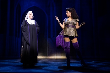 Fleeing to a nearby police station, Deloris reports what she has witnessed to police lieutenant Eddie Souther, who just happens to have been a nerdy admirer of hers when they were in high school together. In order to protect Deloris from Curtis, Eddie arranges with the austere and reluctant Mother Superior of the Queen of Angels convent for Deloris to hide out there, disguised as a nun (Sister Mary Clarence). Deloris is unhappy and angry about the Mother Superior's insistence that she be bound by the restrictions placed upon the nuns by their order. This is the set-up for Sister Act, the musical stage adaptation of the 1992 box office smash hit film comedy of the same name which starred Whoopi Goldberg, now on stage at the Paper Mill Playhouse. Originally, it was successfully produced by the Pasadena Playhouse and Alliance Theater (Atlanta) in 2006-2007. In 2009, it was produced in London, where it ran for more than 600 performances. A revised version, directed by Jerry Zaks, opened on Broadway in 2011 where it attained a ru of 589 performances. Patina Miller starred in both the London and Broadway productions. The gag-filled book by Cheri Steinkellner and Bill Steinkellner, with additional book material by Douglas Carter Beane, written for the Broadway version is the basis for this production. Largely written in the style of Dan Goggin's Nunsense, the book is mildly amusing and serviceable, failing to take flight until the second act. Goggin is a tough act to follow in the business of loveable comedic nuns. In any event, the convent has a dreadfully unmusical nun's choir led by the frumpy, superannuated and inept Sister Mary Roberts. In time, having gained affection and sympathy for the sisters, Deloris assumes leadership of their choir and turns them into the swingiest, most popular choir in Christendom, or should I say, Philadelphia, transforming the lives of both herself and the sisters in the process. Despite the often intentionally low-brow, unsophisticated level, it would be a bit curmudgeonly not to take some pleasure from any number of the humorous lines which abound here. When a nun informs Deloris that she is a postulant, Deloris responds, "Well, I used to get low in cash myself sometimes, but I never turned to that." In conversation about the oldest nun, a sister observes, " Rumor has it, when they found the shroud of Turin, they called her in to verify the likeness." And I can't resist sharing my favorite as it perfectly blends the religion and show-business elements of this musical. After the Deloris-led nun's choir obtains wide popularity, the monsignor announces that "The reviews are in. 'If you see only one Catholic mass this season, let this be it'." As a gangster's moll, Nicole Vanessa Ortiz (Deloris) is a bit too smooth and high class to be convincing. However, as the convent stay softens Deloris' edges and Ortiz unleashes her mezzo-soprano, we know that Deloris is in strong, safe hands. The convent nuns–led by Jennifer Allen as the Mother Superior who is troubled and resistant to the value and virtuousness of Deloris; Belinda Allyn as the shy and repressed Sister Mary Robert; Kara Mikula as the enthusiastic and bouncy Sister Mary Patrick; Diane J. Findley as the angrily displaced head of the choir–bring humor, pathos, and, most importantly, strong show-stopping voices to their roles. Jarran Muse is an appropriately likeable Eddie Souther, and Akron Watson is an effectively menacing Curtis Jackson. When late in the evening they get the opportunity to show their musical theater props, both Muse and Akron prove to be particularly delightful song and dance men. Anthony Alfaro, Ryan Gregory Thurman, and Todd A Horman (Curtis' crew) similarly excel in their showcase number. Key creative credits are: direction by Jerry Zaks; direction re-created by Steven Beckler; choreography by Anthony Van Laast; choreography re-created by Janey Rothermel. This would seem to indicate that this is a replication of the Broadway production. There is nothing particularly innovative or auteur-like in the staging. Neither is it called for. In the early going, while mildly amusing, Sister Act feels flat and disappointing. It appears to me that the fault may be in the direction, which lacks verve and sold pacing, and a scenic production which until the rejuvenated sisters hit the stage (or, should I say altar) is sparse and colorless. However, once the sustained concert-like choreography begins and is joined in a sustained manner by more traditional musical theater choreography, Sister Act becomes high spirited, feel-good, scintillating entertainment. What is sensational about Sister Act is the rich and rollicking music of Alan Menken. Strange as it may seem, the ubiquitous and monumentally successful Menken, whom I believe is our best active American theater composer, is insufficiently appreciated and recognized. I think the major reason for this is that a large percentage of his most popular music was written for Disney movies, causing many musical theater aficionados to snobbishly ignore him. The range and quality of his music makes him rank with our iconic musical theater composers. The lyrics of Glenn Slater seamlessly complement Menken's music. The terrific orchestrations of Douglas Besterman, along with the vocal and incidental music arrangements of Michael Kosarin, dance music arrangements of Mark Hummel, and the terrific orchestra conducted by Christopher Babbage, deserve mention because of the joy to be derived in paying attention to their contributions. Through the years, no composer has as successfully combined a gift for traditional and contemporary music styles. Exactly 40 years ago, Menkin (with lyricist Howard Ashman) premiered the sensational doo-wop, rock 'n' roll, early Motown, and American songbook musical Little Shop of Horrors off-off Broadway. It is clear that there is good reason why Sister Act has been set in 1979 Philadelphia. Add in Gospel and a bit of jazz, and you
