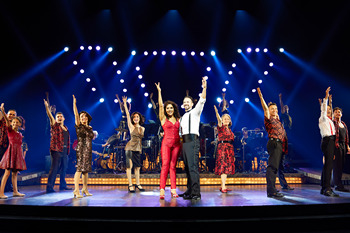 After the opening number, which depicts a performance from the 1990 concert which also brings the show to a close, Feet! flashes back to 1963 Vietnam where Gloria's father Jose Fajardo, who is serving in the United States military, is listening to a recording ("Cuando Salí de Cuba") which we observe Gloria has made and sent to him. Thereafter, we meet Gloria as a young woman studying to be a psychologist and helping to care for her father who is suffering from multiple sclerosis resulting from his service in Vietnam. Impressed with the songs Gloria writes, her grandmother Consuelo arranges for her to meet Emilio Estefan, a local band leader. Gloria isn't comfortable with the idea of performing professionally and wants to pursue her education. Furthermore, her mother (for reasons to be revealed later) strongly opposes Gloria going into show business. Further dramatic complications featured in Feet! include the resistance of the Estefans' record producer to allow them to record a crossover album when they are riding high on the Latin music circuit, and, Gloria's life-threatening spinal injuries resulting from a crash of her tour bus with a truck. This and Gloria's gritty and remarkable comeback are the principal plot drivers in the second act. The time given over to the accident and its dire repercussions is overly lengthy, casting too long a pall over the evening's pleasures. However, the joy of Gloria's comeback and its musical accompaniments provide an extended and joyously pleasurable conclusion to this praise worthy entertainment. Missteps include the introduction of so many characters and plot points in its early phases, which initially make Feet difficult to follow, and sound engineering which has the over-amplified orchestra drowning out lyrics and distorting the music. Paper Mill has an outstanding sound system, but as Angelo Del Rossi, the late Paper Mill artistic director, told me very long ago when I complimented him on what sounded to me like a new and improved sound system, "it's not the system, it's the manner in which it is operated." In addition to the songs which feature Latin dance rhythms, Emilio and Gloria Esteban have written more than their share of romantic ballads ae well as songs growing out of their personal struggles. As a result, the lyrics contributing to plot development seem a better fit than such lyrics generally found in jukebox musicals. Linedy Genao captures the style and persona of Gloria Estefan with seeming ease, convincingly conveying her various musical phases through the years. Brandon Espinoza underplays Emilio Estefan. Emilio is written as being overbearing, and it is difficult to get a bead on how bookwriter Alexander Dinelaris wants us to feel about him. Francisca Munoz (Gloria Fajardo), Yajaira Paredes (Consuelo) and Vanessa Sierra (Rebecca) as Gloria's mother, grandmother and sister, respectively, and the large supporting cast all perform solidly, but because there are so many characters who flit too briefly in and out of the story, none make a particularly strong impression. Similarly, director-choreography Alex Sanchez has delivered a solid production in which each aspect–singing, dancing, acting–is solid, but by and large, individual performances do not stand out. From the Act One opening depicting Gloria Estefan, her producer and songwriting partner / husband Emilio Estefan, their son Nayib, their band the Miami Sound Machine, and a crew of lively back-up singers and dancers rocking the house performing "Rhythm is Gonna Get You" at a 1990 concert on to the flashback of Gloria and company performing "1-2-3" as she hits her performing stride and she and Emilio embrace their love for one another through to the first act finale when the group first performs its crossover (from the Latin market onto the mainstream record charts) with their lively and infectious "Conga" continuing with second act opening medleys and concluding as expected with a delightfully infectious megamix song-and-dance finale, On Your Feet! provides the upbeat musical entertainment that is the raison d'etre for jukebox musicals.