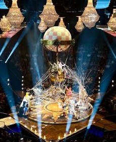 Verne's novel, while extremely elaborate, actually has a fairly straightforward plot. In 1872 London, and with the expansion of rail lines across Asia, wealthy Phileas Fogg states that it is now possible to travel around the world in just eighty days. He wagers his life savings of £20,000 on a bet with members of the upper crust Reform Club who don't believe he can succeed in his globetrotting expedition in such a short time. With his trusty and resourceful valet Passepartout at his side and traveling by a combination of trains and ships, Fogg's adventure takes him, and the audience, from London to Egypt, India, Hong Kong, Japan, California, and New York before finally making it back to London. However, the wager puts Fogg's fortune and his life at risk when a police detective, who thinks Fogg is a thief on the run after encountering him on his journey, puts as many obstacles in Fogg's way as he can to slow his trip down until he has the means to arrest him. That turns the adventure into a completely different one than the determined and relentless Fogg had originally imagined. Along the way, Fogg also meets the widow Mrs. Aouda and finds that discovering love may be more important than making it back to London within the 80 days. Eason's adaptation follows the main plot of Verne's novel with many scenes of high adventure as well as moments that are charming, fun, romantic and comical. Director Dave Tinney brings a wonderful sense of playfulness and romance to the production and he manages to draw effective and clear portrayals from his four leads that resonate, along with winning performances from the group of men who play all of the supporting characters. Tinney also manages to incorporate the aerial acts and acrobatics into the production fairly seamlessly to play up the playful and romantic elements of the play. However, as talented as these aerialists are, and there are several awe-inspiring sequences, there are a few times when these moments don't add anything to the story but spectacle. The show is double cast, and the cast we saw performs on Mondays, Wednesdays and Fridays. Kelton Davis is excellent as Fogg, a proper English gentlemen who shows little emotion and claims that he never jokes. He prefers to study mathematics and often quotes calculations, but when he meets Mrs. Aouda, Fogg's rigid demeanor changes and Davis wonderfully shows how he doesn't quite know at first what these new emotions are that he's feeling. Ryan Simmons is superb as Passepartout. His combination of double takes, arched eyebrows, and rubbery body movements get big laughs as does his thick French accent, which continually confuses people when he speaks. There is also a great running gag on how no one knows how to pronounce his name, which is highly humorous due to Simmons' refined comic abilities and his reactions to the names people call him. Simmons comes out into the audience before the show begins and his playful nature immediately makes him an audience favorite. Amishi Rohaj is appropriately reserved as Mrs. Aouda, a woman who just lost her husband and finds herself whisked into Fogg's adventure. Rohaj brings a lovely sense of quiet and stillness to the, at times, elaborate adventures goings on around her, which affords a nice break from the chaos and also allows for the romance between Aouda and Fogg to resonate. There are a few moments when Rohaj lets us see how much Aouda is truly enjoying these new and exciting experiences. Zac Zumbrunnen is a hoot as the bumbling Inspector Fix who tries to thwart Fogg, and even though it's a small role, Genesis Eve Garcia oozes royalty and majesty as Queen Victoria. Ammar Al-Saffar, Bryan Dayley, Josh Durfey, and Angel Rosa are having a blast playing a multitude of supporting roles, from the upper crust members of the Reform Club to the captain of a ship and various other people Fogg and Passepartout encounter on their journey. Alan Brinkerhoff, Jordan Dahl, Jessica Zöe Bird, Olivia Lee, MaKayla Finlinson, and Jane Jackson are all incredibly talented aerialists and acrobats who use silks, trampolines, circus apparatus, and dance, all exceptionally choreographed by Lindsey D. Smith with aerial choreography by Ramsi Nia Stoker, to deliver many impressive and highly theatrical moments. The creative elements are excellent. Kacey Udy's scenic design incorporates Victorian and steampunk elements, as do the colorful and elaborate costumes by Joy Zhu and Elise McMurry; the saris for Mrs. Aouda are rich and gorgeously detailed and the tall top hat for Fogg is a wonderful, whimsical touch. Udy uses a wooden rotating floor to evoke the sense of movement that's crucial to the plot along with many large scenic elements that descend from the flies, including an elephant and a very impressive set piece that's used to depict the ship the group takes. There is a director's note in the program which includes mention of how a hot air balloon wasn't in Verne's original novel but something added for the 1956 film version. The script even touches upon this omission, but Udy finds a way to incorporate it into the production, and it's a wonderful addition. The lighting design by Jaron Kent Hermansen and sound by Michelle Ohumukini are excellent, especially for the storm at sea and the many night time sequences. The cities and countries where Fogg is currently on his voyage are displayed on the large screens that surround the audience and projected on the floor of the stage, and Maddy Ashton's video and projection designs are fun and whimsical. However, what's most impressive of all is the original score that Rob Gardner wrote for this production that is not only gorgeous as it underscores the action but also is used very effectively to echo the emotions and feelings of the main characters and to serve as a way to supplement the aerial, acrobatic and dance elements. Eason's adaptation of Around the World in 80 Days incorporates several action-packed sequences, an abundance of humor,