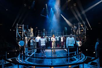 After outgrowing their previous spaces, the Sandy venue is the third location for the Hale Centre Theatre in Utah. This location opened in 2017 and reminds me of Lincoln Center or the Kennedy Center due to its opulence and grandeur and how it beautifully incorporates two theatres, a large lobby area, and an outdoor park into a seamless campus-like setting. With stadium seating, so the sightlines are clear no matter where you sit, the larger 911-seat theatre also has an expansive fly space that allows for large set pieces to quickly descend from above. An abundance of non-stop technical wizardry, an expansive set design, gorgeous lighting, elaborate stage magic, and a large, talented cast makes for in an incredibly impressive and deeply moving production of the 1997 Tony Award winning musical, Titanic. While just about everyone knows of the fate of RMS Titanic, which sank on its maiden journey in 1912 after hitting an iceberg, Titanic the musical incorporates factual information to give attention to many of the actual passengers and crew who were on board, and a lush, operatic score to focus on the events that led up to the disaster, in which more than 1,500 people died. Peter Stone's succinct book and Maury Yeston's lush score do an excellent job of weaving together facts and information about the passengers and the ship as the plot goes from the boarding in England to the aftermath of the destruction just a few days later in April 1912. While the majority of the musical focuses on the three men who were the owner, the builder, and the captain of Titanic, it also spends a good amount of time on supporting characters who were based on actual passengers on the ship, including wealthy members of the first class and poor immigrants in third class who are going to America in hopes of finding a better life, as well as several members of the crew. I've seen about a half dozen productions of this musical and since it's hard to re-create a sinking ship on stage, many of those previous productions veered toward a minimalistic approach. For Hale's production, they pull out all the stops with a multi-layered set design by Kacey Udy that has an expansive section that rotates, along with many individual pieces that rise to form the various decks of the ship and also descend to depict the launch of the lifeboats and the various sections of the boat falling into the ocean. The center section also rises up on one side with its other side folding down to show how Titanic broke in half after the far end was raised up high in the air. There are also a few set pieces, including the bridge and the crow's nest, that descend from above to form an impressive multidimensional stage image. The remarkable design by Udy adds awe and wonder to the production. The production is double cast, and the actors I saw were all exceptional. With the exception of the trio of men in charge of the ship, the entire cast play multiple roles, which helps to give a sense of the large number of people on board in the various classes as well as the large crew. As Thomas Andrews, the builder of the ship, Keith McKay Evans gives a wonderful sense of a dreamer who is still trying to fix what went wrong with the ship as it's starting to sink. As J. Bruce Ismay, the owner of the ship and the main antagonist of the musical who keeps pushing for the ship to go faster, Quinn Allan Dietlein is perfectly villainous. Ric Starnes is appropriately stoic as Captain E.J. Smith, the responsible man who worked for the White Star Line for many years and planned to retire after this crossing. All three have impressive singing voices and consistent British accents. The musical also centers on the hopes and dreams of many of the people on board, including a few who are looking for better lives for themselves. These include, Lauren Pope as the headstrong Kate McGowan, Mckelle Shaw as the social climbing Alice Beane, and Kaden Caldwell as Fredrick Barrett, a stoker on the ship. All three excel with clear vocals and distinct portrayals. Caldwell's delivery of both his solo, "Barrett's Song," and the duet he shares with Angel Martinez as the energetic and eager ship's radioman Harold Bride, "The Proposal/The Night Was Alive" are excellent. Jared Dunn and Michelle Sundwall are wonderful as the devoted couple Isidor and Ida Straus. Ryan Shepherd is very good as Mr. Etches, a waiter for the 1st class passengers. His solo reprise of "To Be a Captain" as the ship is sinking and his fate is known is extremely moving. Josh Durfey, Maxx Teuscher, and Thomas Brandley all do good work as the ship's main officers and the lookout who first spots the iceberg. Durfey is great as the 1st Officer who doesn't feel he's quite ready to take on a ship of his own, and Brandley's "New Moon" solo, as he sings from high above the stage in the crow's nest, is especially beautiful. The rest of the cast deliver clear and warm vocals and distinctive characters. Dave Tinney's direction is excellent, with just one small quibble. He seamlessly uses the almost constantly moving set design to quickly move us from deck to deck and from one class to the next in a cinematic fashion that gives a wonderful sense to the expanse of the ship. His cast all create identifiable and realistic characters with an appropriate sense of urgency once the truth about Titanic's fate is known. The only small drawback is that some of the comic lines in Stone's Tony winning book are lost due to being rushed. While the show still works, that humor can help somewhat to offset the doom and gloom of the story and to flesh out the characters. While pre-recorded musical tracks are used, they are lush and excellent, and Kelly DeHaan's music direction delivers warm and clear vocals from the large cast. The creative elements are sensational. In addition to the aforementioned exceptional set design by Kacey Udy, Jaron Kent Hermansen's lighting and video and projection designs are vibrant and gorgeous. I especially like the 
