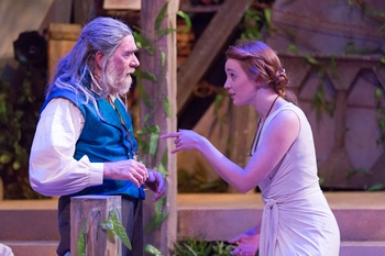 This world and its story belong to the powerful sorcerer and erstwhile Duke of Milan Prospero (Peter DeLaurier). Twelve years ago the usurper Antonio (J Hernandez) set his brother Prospero and young niece Miranda (Ruby Wolf) adrift at sea in order to claim the dukedom for himself. Father and daughter survived the ordeal and came to live on an isolated tropical island, with only the powerful spirit Ariel (Bi Jean Ngo) and misshapen wretch Caliban (also played by J Hernandez) to keep them company. When a ship sailed by his old enemies nears the island, Prospero calls forth a tempest to wreck their boat and strand them on shore. Completely at the mercy of his potent magic, the shipwrecked company must stumble through the obstacles, pitfalls, and plots Prospero sets before them. DeLaurier is a bewitching Prospero, displaying resolute will and heartbreaking physical frailty. Wolf displays youthful confidence and excellent comic timing as Miranda. Graceful and grounded, Ngo brings a subtle darkness to the enslaved spirit Ariel. Hernandez is savagely bitter as the fish-human hybrid son-of-a-witch Caliban. Hernandez works hard to overcome his distractingly inappropriate costume, which makes him look more like a tropical Bigfoot than a creature of the sea. All the rest of Natalia de la Torre's designs are top notch. In particular, the costumes for high born members of the wrecked ship's company are lavish without being overwrought, featuring rich jeweled tones and intricate metallic accents. It is easy to get lost in the delicious language and fairy-tale sensibility of what is largely considered the immortal bard's ultimate work. McMahon's deftly understated production also emphasizes the humanity of these iconic characters. I have seen The Tempest many times, but here I was particularly moved by the momentousness of Prospero's decision to break his staff and bury his book. Surely knowing when to stop, when to let go of power that has been hard won and rightfully held is one of the most difficult challenges any person can hope to face. I cannot help but wonder how much of Shakespeare's own struggle we are hearing in Prospero's wise words. The Lantern Theater Company's presentation of The Tempest, through Sunday April 29, 2018, at St. Stephen's Theater, 10th & Ludlow Streets, Philadelphia PA. For tickets call (215) 829-0395or visit www.lanterntheater.org. Cast: Production Team: |