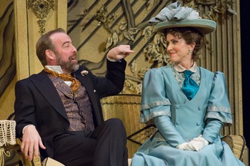 A Woman of No Importance focuses on a group of British socialites who have gathered for a weekend of mild-mannered frivolity at Lady Hunstanton's (Jane Ridley) large country estate. They are joined by a young American woman named Hester Worsely (Audrey Ward), whose brutally honest opinions of British society shock her companions and endear her to one earnest young man in the party. When Gerald Arbuthnot (Brandon O'Rourke) is offered a job as personal secretary of the irreverent Lord Illingworth (Peakes), it seems like the perfect way to prove himself worthy of Hester's affection. However, things get more complicated when Gerald's mother Mrs. Arbuthnot (Alicia Roper) turns up and recognizes one of the other guests. Peaks is an absolute joy to watch, but he is not the only one who turns in a memorable performance. Martello is hilariously dour as overbearing Lady Caroline Pontefract, and Bedford is extremely funny as the easily influenced Lady Stutfield. Roper gives Mrs. Arbuthnot a grace and seriousness that is crucial to the success of the production. O'Rourke plays son Gerald with a sincerity that is adorable. There are some weak links too. Ward comes up wanting as youthful upstart Hester with speeches that are difficult to follow and motivations that feel bizarrely inconsistent. Much of the play's humor is meant to come from the witty repartee and there are indeed some deliciously witty exchanges, particularly where Peaks is involved. Unfortunately, too much of dialogue feels stilted and unnatural. Cast members struggle to maintain their British accents and overcome the most dated material in Wilde's 126-year-old script. Some of the references are too obscure to be inherently funny (what is a lumber room?) and a few of the jokes are actually offensive. One quip about a man who beats his wife created a tangible sense of discomfort among the stunned audience at the performance I attended. Lush costumes and an innovative set pick up some of the slack. Mary Folino's lavish costume designs are beautifully detailed right down to the lining of Lord Illingworth's well cut coat. The interiors and exteriors by set designer Roman Tatarowicz are all done in black and white (or off white), making the action spring to life like a story in a book. Under Shon Causer's lighting A Woman of No Importance is a visual feast worthy of the most elegant company. Once again, it appears that Walnut Street Theatre was unable to find a single actor of color for this production. Hopefully, the next show will feature more diversity and fewer British accents, although that scoundrel Lord Illingworth would probably object to both. A Woman of No Importance runs through March 1, 2020, at Walnut Street Theatre, 825 Walnut St., Philadelphia PA. For tickets and information, call 215-574-3550 or 800-982-2787 or visit www.WalnutStreetTheatre.org or Ticketmaster. Cast: Crew: |