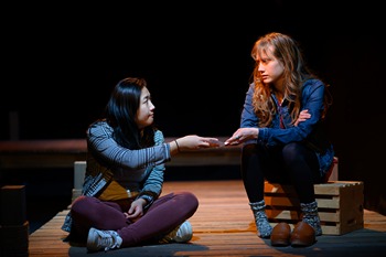 Annie Fang and Alison Ormsby Photo by Johanna Austin/AustinArt.org | I absolutely adore the characters in playwright Douglas Williams' irreverent comedy Ship, now making its world premiere at Azuka Theatre. Nell (Annie Fang) is ticket taker at a whaling ship turned tourist attraction, but she dreams of being promoted to tour guide. She is also a Guinness World Records super fan, college drop out, and recovering addict. Nell's sister Caitlin (Alison Ormsby) works at the local library, but much of her time is spent looking after Nell and their sick mother. Both went to high school with Jeremiah (Michael A. Stahler), a local kid who became a minor celebrity for growing out his fingernails to epic length. Jeremiah has recently returned home following a car accident that broke off all his nails and left him feeling decidedly unmoored.