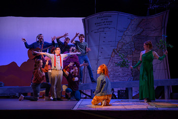 The most serious issue is that the narrative feels confused and rushed for much of the first act. This is the greatest story ever told, from Mary's virgin pregnancy to the birth of Christ. But it might also be a story about people putting on a play about the Nativity. But it's not clear that is what is going on, because we never learn who they are or why they are doing it, and at some point the whole play within a play idea simply vanishes completely. The pace and storytelling is on track by act two, but my sense that the cast does not know exactly what type of play they are putting on (straightforward or self-aware? irreverent or inspiring? glib or serious?) is never resolved. The confusion isn't merely existential–more than once it seems like the cast does not know exactly where they are meant to enter or sit or stand. There are some excellent performances, but one serious casting blunder. DJ Gleason is sweetly fumbling and earnestly struggling as the Angel. Jenna Kuerzi plays Mary with ample charm and a modern sensibility that makes the story feel surprisingly relevant. The funniest performance of the night comes from the elegant and increasingly frustrated Elise Hudson as the Tree. Despite their evident talent, none of these actors makes any connection with Neill Hartley, whose unfortunately stilted performance as the aging and agitated Joseph brings the show to a screeching halt. Hartley's labored and awkward dialogue is a low point of the play. The best part of The Butterfingers Angel is having carols interspersed throughout the story. Great vocals and excellent energy abound during these numbers. It is easy to feel the spirit of the season while the cast is singing and strumming "We Three Kings," "O Come All Ye Faithful," and "Away in a Manger." It always adds something special when the actors are really playing their instruments on stage, and Shannon Zura's sound design fills the space beautifully. The Butterfingers Angel, Mary & Joseph, Herod the Nut, & the Slaughter of 12 Hit Carols in a Pear Tree runs from through December 23, 2022, at Uptown! Knauer Performing Arts Center, Roy A. Smith Mainstage, 226 N. High Street, West Chester PA. For information and tickets, please visit uptownwestchester.org. Cast: Crew: |