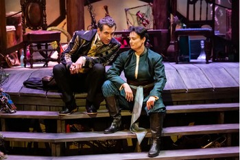 Twelfth Night is set in the kingdom of Illyria and follows the story of Viola, a young woman who is shipwrecked and believes her twin brother Sebastian has drowned. Disguising herself as a man named Cesario, Viola enters the service of Duke Orsino and quickly becomes his trusted messenger in his pursuit of the countess Olivia. But even as she pursues Olivia in the Duke's name, Viola falls in love with Orsino. To make matters worse, Olivia quickly falls for Viola disguised as Cesario. Things only get more tangled when Olivia's household staff get involved and Sebastian shows up very much alive. Olivia (and, of course, Cesario) is played by the winsome Melissa Rakiro. Frequently nervous, easily excited, and always adorably earnest Rakiro's energy is fantastic. There is a fun, easy chemistry between Rakiro and Damon Bonetti as Duke Orsino. Their lopsided romance is more schoolyard crush than desperate unrequited love, which keeps the tone light and feels right in line with the rest of Shakespeare's comedy. Bonetti wisely chooses to play the Duke as childish but charming, eschewing a more dark and brooding affect. Other standouts in the all-around excellent ensemble include J Hernandez as the unintentionally hilarious Sir Andrew, David Ingram as the much maligned Malvolio, and Joanna Liao as a vibrant and capricious Viola. Featuring a richly jeweled color palette and lots of fun detail, Marla Jurglanis costume designs are wonderful. James F. Pyne Jr.'a set design gives the actors plenty of spaces and levels to work, but having a ship's bow on stage for the duration does not make sense to me. I also found the set a bit too dark, but cannot say whether that is due to Pyne's design or the lighting designed by Tydell Williams. McMahon's production features beautiful original music composed by Barrymore Award-winner Christopher Colucci. Colucci's score turns a potential lull (many productions struggle with the song lyrics in Shakespeare's work) into one of the play's highlights. It is a real treat to see the actors themselves play and sing the songs live on stage. I highly recommend heading over the Lantern Theater and having a listen and a laugh for yourself. The Lantern's production ofTwelfth Night runs through Sunday, June 18, 2023, at St. Stephen's Theater, 923 Ludlow Street, Philadelphia PA. For tickets and information, please visit www.lanterntheater.org or 215-829-0395. Cast: Creative Team: |