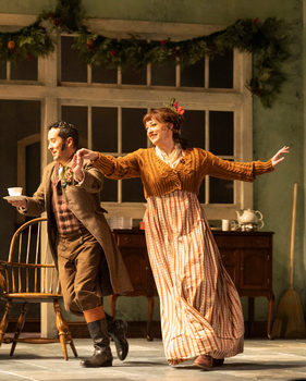 The play takes place at the exact same time and in the same location as Miss Bennet, which is set two years after the events in Austen's novel. However, unlike Miss Bennet, which took place in the main opulent drawing room at Pemberley, the setting has been moved downstairs to the fairly bleak servants' dining room for The Wickhams: Christmas at Pemberley. The focus has also been shifted from the owners of the estate, Fitzwilliam Darcy and his wife Elizabeth, and her single sister Mary to three members of the Pemberley staff (housekeeper Mrs. Reynolds, footman Brian, and newly hired housemaid Cassie) and the younger Bennet sister Lydia and her philandering husband, George Wickham. It won't matter if you aren't familiar with the book or the Miss Bennet play to enjoy this production. However, for a quick refresher, "Pride and Prejudice" is set in the early 1800s and centers on the five Bennet sisters, the various romantic relationships they have, and the idea that women could marry for love and not only for wealth or privilege. Elizabeth eventually marries Darcy but not until her sister Lydia has run off with the notorious cad and rake George Wickham. To save the Bennet family's reputation, Darcy forces Wickham to marry Lydia. Miss Bennet followed the only remaining single Bennet sister, the socially awkward Mary, and her newly romantic involvement with a cousin of Darcy's who was also invited to spend Christmas at Pemberley. For The Wickhams, the plot begins on December 22nd with the arrival of Cassie, a young woman hired as extra help for the Christmas festivities at Pemberley, and follows what happens when Lydia's husband, who is no longer welcome at Darcy's estate, barges into the servant's quarters late one night after a drunken brawl in the hope of scamming money from Lydia's parents. As the dutiful housekeeper Mrs. Reynolds works to keep everything running smoothly at Pemberley, she also hides Wickham and allows him to spend the night in Brian's room as she feels sorry for him. When an incriminating letter is found in Wickham's pocket, it sets in motion a series of events that could break apart the Bennet sisters and bring scandal to the family. Lauren Gunderson and Margot Melcon use the same care they did for the Miss Bennet play, and the focus on the inner workings of the Pemberley estate and the relationship between the Darcy family and the individuals who work for them is especially interesting to see. While the relationships between the working and upper classes in a large manor may be familiar to anyone acquainted with the popular TV show "Downton Abbey," how Gunderson and Melcon manage to incorporate information from both the Austen novel and their previous play is quite fun to see. They have also created rich characters and show how all three of the staff are realistic and three-dimensional individuals with their own hopes and dreams. And if you did see the previous play, it's fun to know that, as the events depicted in that play are happening upstairs, we now get to see the servants' reaction to some of those events as well as the rest of drama that unfolds downstairs. Veronika Duerr, who played a supporting role last season in Miss Bennet, takes over directing duties for the follow-up play and her work here is wonderful. She brings the perfect tone to the production so the humorous moments get laughs and the serious moments ring true. She ensures her cast create realistic portrayals while also making the emotional scenes resonate. I found myself quite moved at the end. While Apollo Mark Weaver's set design isn't as grand as his design was for Miss Bennet, it is quite realistic, as are the period costumes by Lauren T. Roark. Brian J. Lilienthal's lighting design works very well to depict the changing light in the servant's room from the bright but stark winter days to the dark and shadow filled nights. The cast in this production shine. Emily Mohney is excellent as the sure-of-herself Cassie, a young woman who is strong and proves that she doesn't need a husband to take care of her. As Brian, the footman who is as devoted to his work as he is to his need to invent things to make life easier, Seth Tucker does a lovely job. Amelia White is superb as Mrs. Reynolds. Darcy says that Reynolds is as much a master of the house as he is and from White's polished portrayal you can easily see how this woman who appreciates restraint and order but also doesn't like change has kept a tight control over Pemberley for years. Maya Encila does good work in portraying, a loud, silly and foolish young woman. Alex J. Gould has fun playing her lying and cheating husband George, who is simply doing whatever he needs to do in order to survive. Andrea Syglowski and Cecil Washington Jr. are equally as good as the Darcys; they beautifully and realistically portray a couple who are still newlyweds and are very much in love. Fans of the Austen novel, romance, and holiday entertainment will find much to like in The Wickhams: Christmas at Pemberley at Arizona Theatre Company. The Wickhams: Christmas at Pemberley runs through December 23, 2022, at Arizona Theatre Company, Herberger Theater Center, 222 E. Monroe Street, Phoenix AZ. For tickets and information, please visit www.arizonatheatre.org or call 602-256-6995. Written by Lauren Gunderson and Margot Melcon Cast: (In alphabetical order) *Member, Actors' Equity Association, the Union of Professional Actors and Stage Managers in the United States |