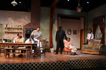 Wilson's plays are embodied with intriguing characters and poetic language that speak to the trials and tribulations that African Americans faced throughout the 20th century. In Joe Turner's Come and Gone, the setting is the Pittsburgh boardinghouse owned by Seth Holly and his wife Bertha. This is but one stop on the long journey for the transitory inhabits who are seeking better lives for themselves, with many of the residents the sons and daughters of slaves who are haunted by their pasts and uncertain of their futures. The title comes from an actual person who was the brother of the governor of Tennessee who would illegally kidnap and falsely arrest Black men and force them to serve on his chain gang. The latest individual to rent a room from the Hollys is the mysterious Herald Loomis, who has arrived with his young daughter and tells Seth and Bertha that he is looking for his wife whom he last saw nine years before. When another resident of the home, the mystical Bynum Walker, keeps singing a blues song about Joe Turner, Loomis tells him to stop singing it. Bynum replies that we all need to find our own song and that Joe needs to find his in order for his life to start again. Much has been written about the plays in Wilson's play cycle and how he uses language, music, and sometimes spiritual elements to probe, frame, and document the joys and sorrows of his characters and to depict the weight and forces of history that they must face during the specific decade in which each play is set. There is a lot of imagery that Wilson bakes into his dialogue; here, the chilling underwater bone graveyard of slaves that haunts Loomis is especially visual and vibrant, but there are also moments of pure joy, as when the entire boarding house erupts into a "Juba" dance. Each play is unique and stands alone, but there are a few characters and locations that are mentioned in more than one of the plays. You do not need to have seen or have knowledge of any of the other plays in the cycle to fully understand and enjoy this one. Director Mark Clayton Southers lives in Pittsburgh's Hill District, where nine of the ten plays in Wilson's cycle are set and is the founder and artistic director of Pittsburgh Playwrights Theatre Company, which completed the play cycle in 2016. Southers has directed all ten of the Wilson plays, so he has a vast knowledge of Wilson's work, this play, and what is required to make a production of it successful, and here, with an exceptional cast, it soars. As Herald Loomis, Roosevelt Watts, Jr. is appropriately intense, brooding, wild eyed, and mean looking. Mike Traylor is excellent, without one false move, as the gentle mystic Bynum Walker. Calvin Worthen and Rico Burton are wonderful as Seth and Bertha. Rapheal Hamilton embodies Jeremy Follow, the young musician who runs into trouble at work, with an abundance of life. Joe Kearns is great as Rutherford Selig, the only white character in the play, a "people-finder" whose father used to ferry slaves to the U.S. but now makes money off finding and reconnecting former slaves with their families. Dzifa Kwawu is excellent as the independent, strong, and religious Martha Pentecost. As Mattie Campbell, the woman who comes to Bynum for help to find her man that ran away but instead finds a new life for herself, Amanishakhete Anacaona is appropriately shy and sweet. Shonda Royall shines as the feisty and matter of fact Molly, the woman who doesn't need a man or anyone in her life. Also, in smaller parts, Imani Jones and Jaelyn Walker play the Loomis daughter and a young boy next door, respectively. The production elements are fantastic, with rich period details in Sarah Harris' set and Imani Jackson's costumes. Stacey Walston's lighting is gorgeous and perfectly draws focus to the appropriate section of the set as the scenes play out. At times exuberant and at other times chilling, The Black Theatre Troupe's production of Joe Turner's Come and Gone is a strong, moving, and extremely rewarding production of this classic August Wilson play. Joe Turner's Come and Gone runs through February 19, 2023, at The Black Theatre Troupe , Helen K. Mason Performing Arts Center, 1333 East Washington Street, Phoenix AZ. For tickets and information, please visit www.blacktheatretroupe.org or call 602-258-8129 Directed: Mark Clayton Southers Cast: |