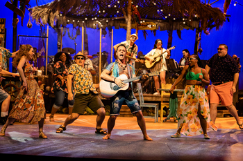 Set at a third-rate beach resort on an island with a volcano, Escape to Margaritaville is a love story between Tully, the slacker guitar-playing singer at the resort bar who is prone to have flings with the female tourists before sending them off on their way back home at the end of their stay, and Rachel, the workaholic environmental scientist who arrives with her best friend Tammy for a week-long getaway before Tammy's wedding. Tully's friend, bartender Brick, hits it off with Tammy, and Rachel lets herself go and ends up sleeping with Tully. Will Tully and Rachel end up together? Will Tammy dump her horrible fiancé and end up with Brick? And will that volcano on the island end up erupting so the Buffett song "Volcano" can factor into the plot? The answers to those questions aren't too hard to guess in the very predictable plot. However, how it gets to its ending and how it incorporates Buffett's songs into the plot is quite fun. Buffett isn't just a popular singer and songwriter, with many of his lyrics forming well-crafted story songs, but he's also written several best-selling books, so he knows a thing or two about storytelling. That helps in how bookwriters Greg Garcia and Mike O'Malley have taken songs Buffett either wrote or recorded to form not only the plot but also traits of the characters and some fun visual gags. So, the "sponge cake" and "lost shaker of salt" that you'll probably remember from the lyrics to Buffett's most famous song, "Margaritaville," make an appearance during that number. While I'm not that familiar with all of his music, I did know about a quarter of the songs in the show and laughed out loud many times when things like that previously mentioned sponge cake showed up. I also think Garcia and O'Malley did a pretty good job incorporating the songs into a plot without having it get too out of line. Only the oddity of having the ensemble portray dead insurance salesmen zombies not once but twice seems completely out of tune with the rest of the island-themed humor in the show. The cast all do a great job playing these mostly caricature characters and provide enough realism in their portrayals to make them more than just two dimensional. As Tully, Shawn William Smith has a genuine likable quality that makes you see why so many female tourists fall in love with him. His soulful voice brings an earthy quality to his many songs, and his guitar playing skills are quite good. Melissa Campbell does a great job as the career-focused and idealistic Rachel. Campbell brings a natural tough exterior at first to Rachel that realistically begins to soften once she and Tully spend more time together and she lets her guard and her inhibitions down. As Tammy, the bride to be who starts to realize she might be engaged to the wrong guy, Kristin Litzenberg is endearing and lovable. Tyler Gallaher is a lot of fun as the goofy bartender Brick, with great comic timing that gets big laughs. All four have bright and warm singing voices that shine on their many songs. In the supporting cast, Dwan Hayes is feisty and fun as Marley, the owner of the resort, and Michael Weaver is a hoot as the salty J.D., the guy who keeps losing his shaker of salt. Also, Skylar Gamble provides a fresh and upbeat take as Jamal, one of the resort workers. The small ensemble do a great job playing multiple roles. Ken Urso's direction keeps the drama low and the comedy high but also ensures the few serious moments in the show resonate. The choreography by Lauran Stanis is upbeat, varied, and danced well by the cast. Lizzie Webb's music direction delivers warm vocals from the cast and bright notes from the small onstage band that sounds great on the mix of country, folk, and reggae songs in Buffett's catalog. The costumes by Dr. Heather Striebel are the appropriate mix of loud Hawaiian shirts, sun hats, and Bermuda shorts, and Jaron Hermansen's lighting washes the stage in oranges and blues to portray the sun-drenched tropical setting. The set by Walt Spangler is from the recent tour and does a good job of depicting the island bar setting plus a fun set piece for an airplane in act two. Escape to Margaritaville isn't a great jukebox musical, but it is fun, escapist fare that won't make you think too hard and will put a smile on your face. Just be prepared to find yourself singing along to the familiar songs, or at least be aware that other Buffett fans around you will be humming and singing along. For this production, ABT's Executive Chef David Young has created a fun, tropical themed menu with offerings including jerk chicken, island tacos, coconut shrimp, gumbo, key lime pie, and, of course, a cheeseburger in paradise. Escape to Margaritaville runs through April 16, 2023, at the Arizona Broadway Theatre, 7701 West Paradise Lane in Peoria AZ. For tickets and information, please visit www.azbroadway.org or call 623-776-8400. Direction by Ken Urso Cast: |